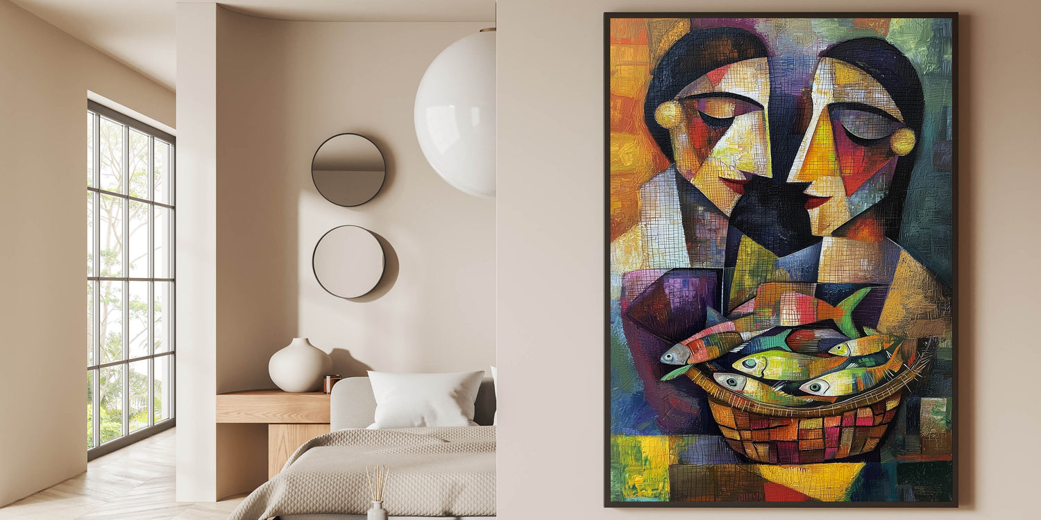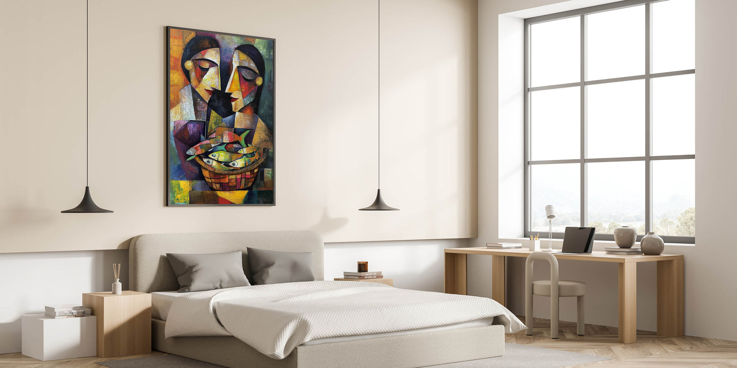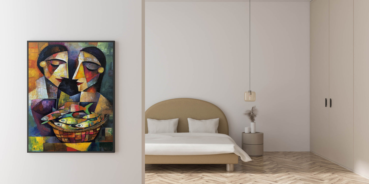 Add a bold and artistic flair to your bedroom with this customizable bedroom wall art, featuring an abstract cubist couple with a basket of fish. This vibrant piece blends warm yellows, deep purples, rich greens, and earthy oranges, creating a striking modern bedroom art centerpiece. Inspired by cubism, the geometric forms and textured strokes add a unique sense of depth and emotion.