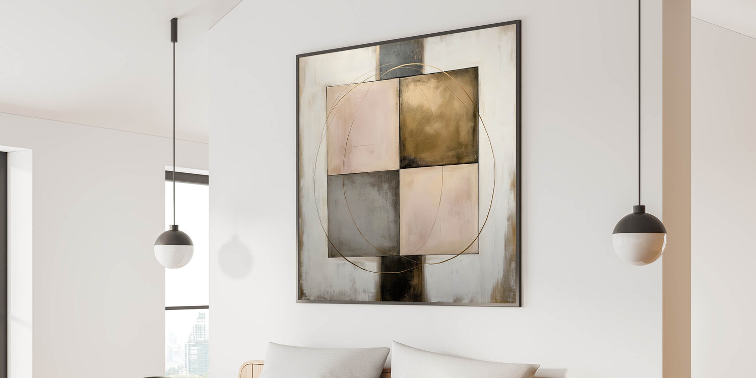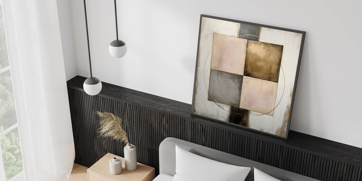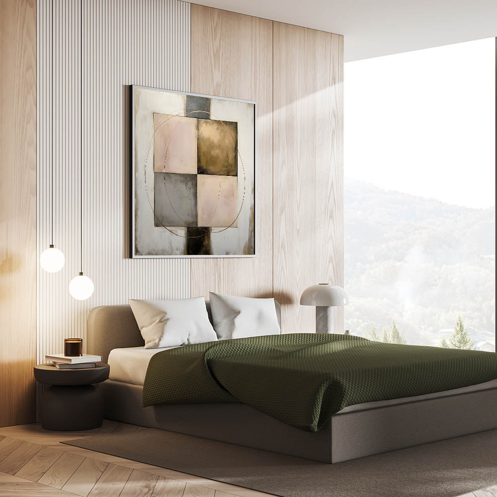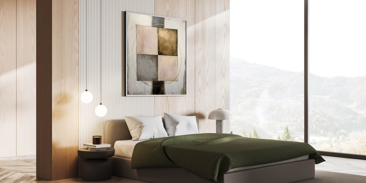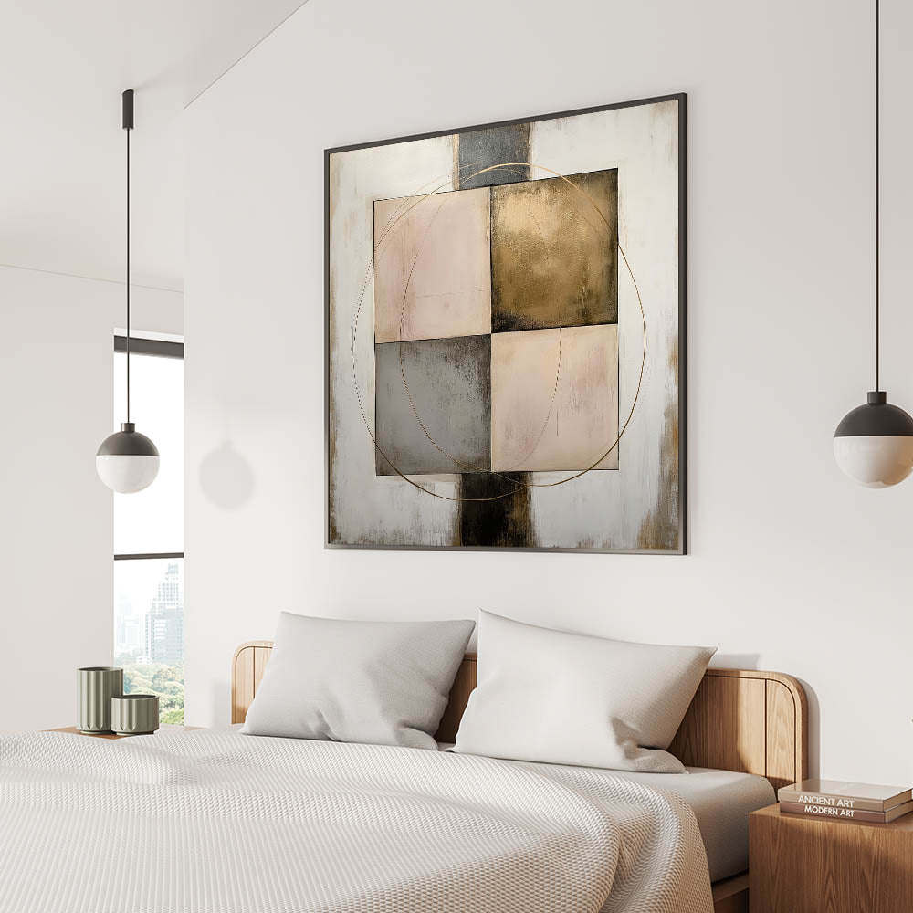 • Unique wall art designs for bedrooms, blending geometric precision with soft, warm tones