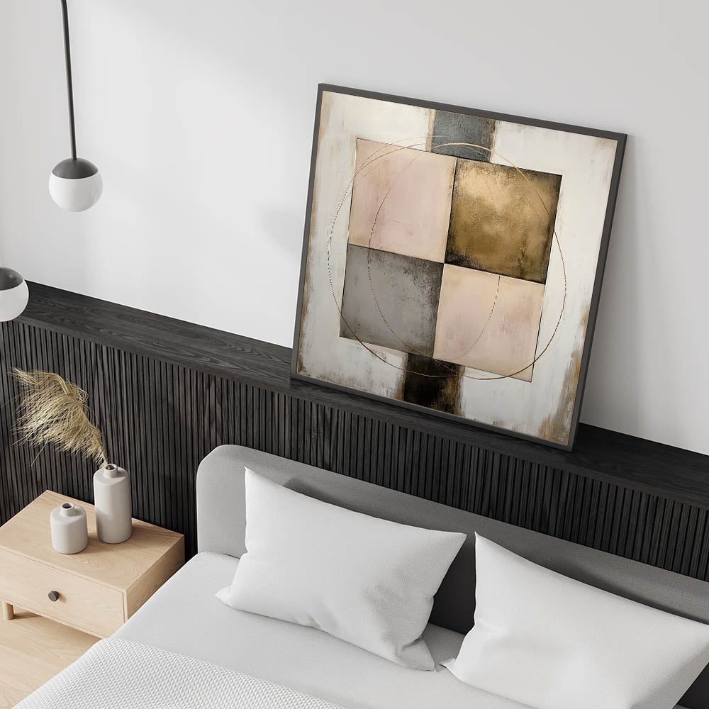 Enhance your bedroom with this elegant abstract bedroom wall art, featuring a sophisticated blend of gold, beige, blush pink, and gray. The geometric design with soft, blended textures and delicate gold accents creates a refined and contemporary aesthetic. This customizable bedroom wall art is ideal for modern, minimalist, and luxury interiors, adding warmth and sophistication to any space.