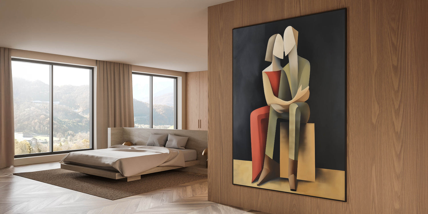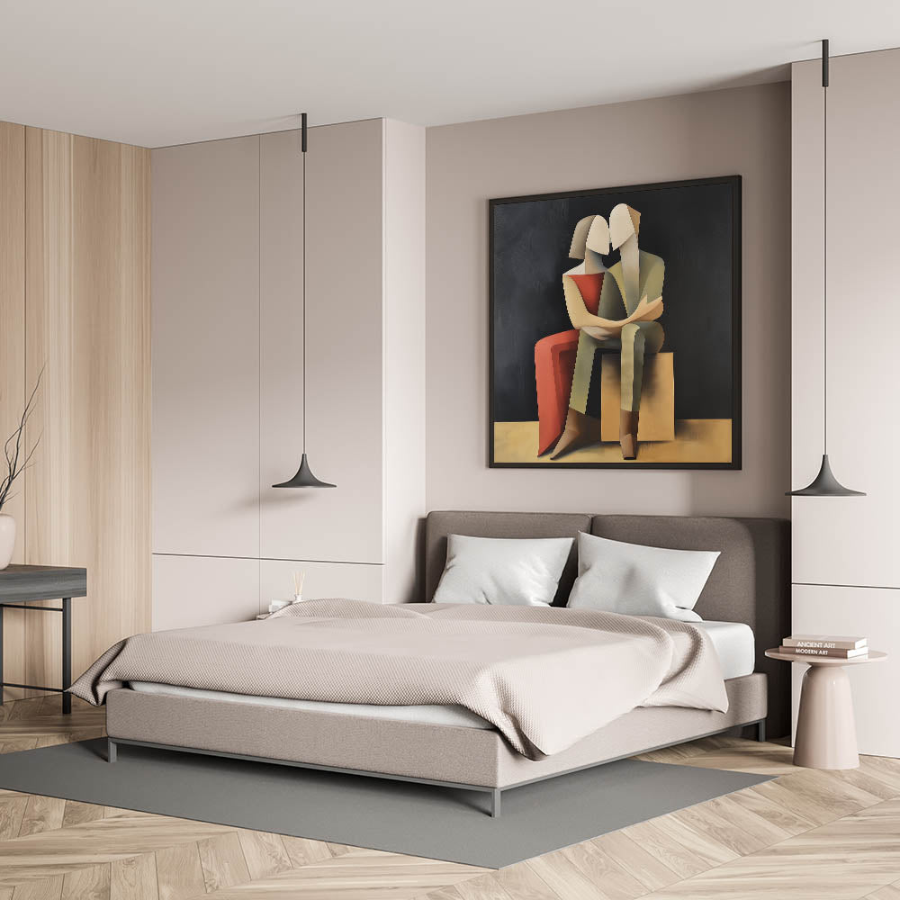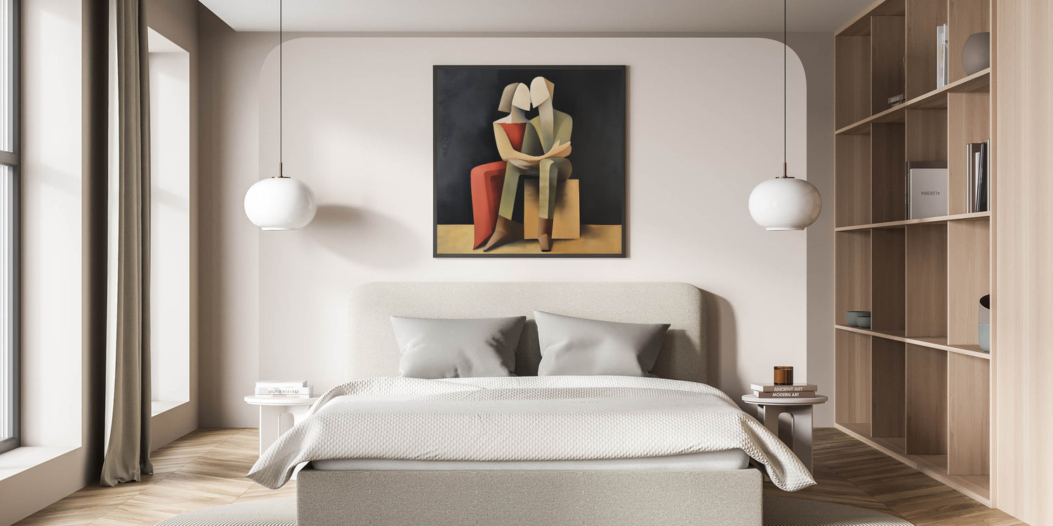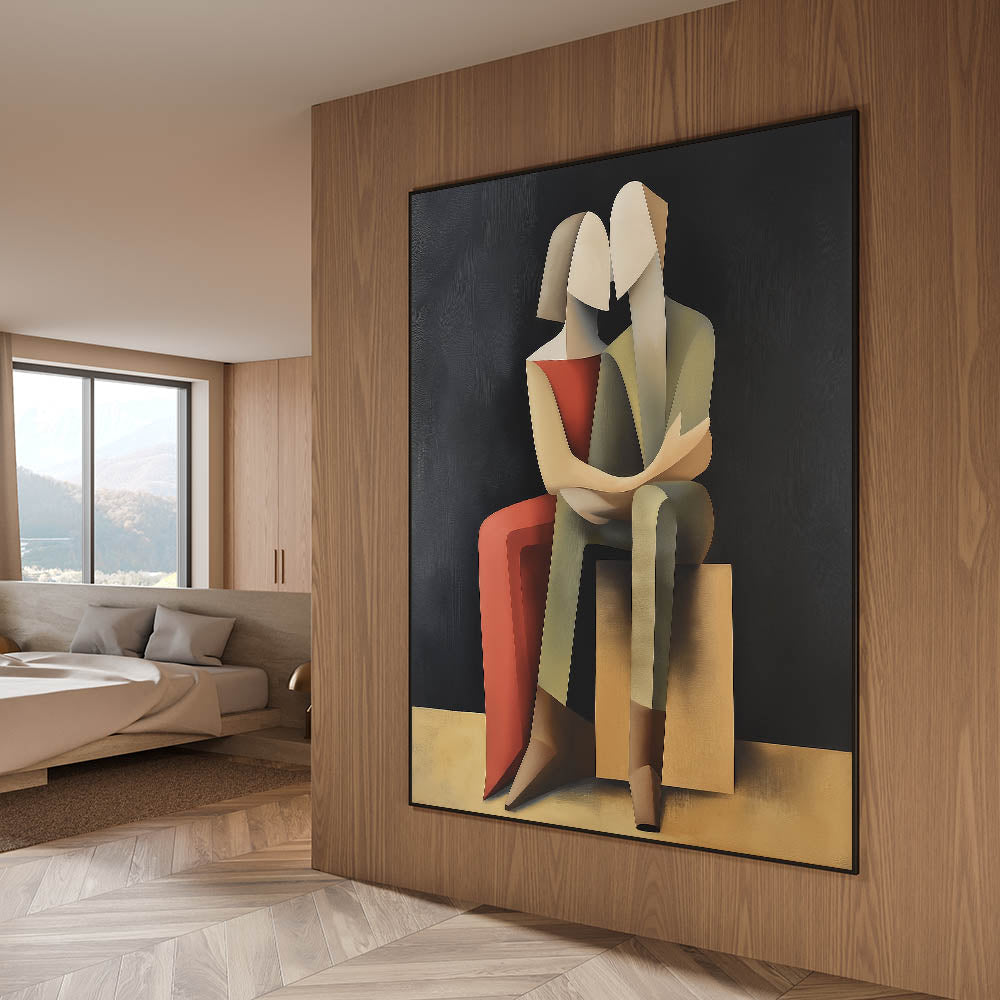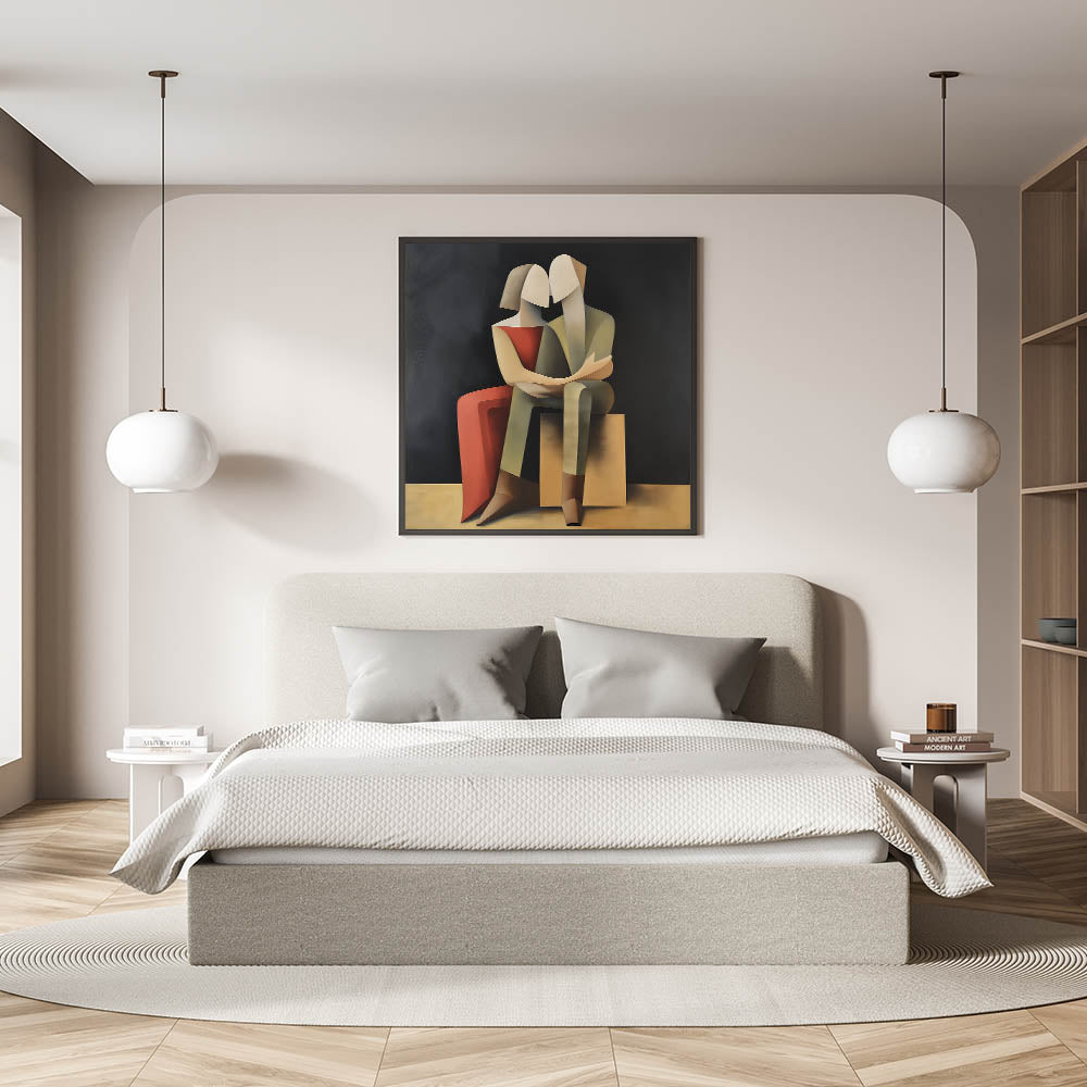 Bring warmth and intimacy to your bedroom with this customizable bedroom wall art, featuring a modern abstract depiction of a loving couple. The minimalist geometric design, combined with earthy beige, olive green, deep red, and black, creates a bold yet elegant statement. This piece is a perfect choice for modern bedroom wall decor, embodying emotion and artistic expression.
