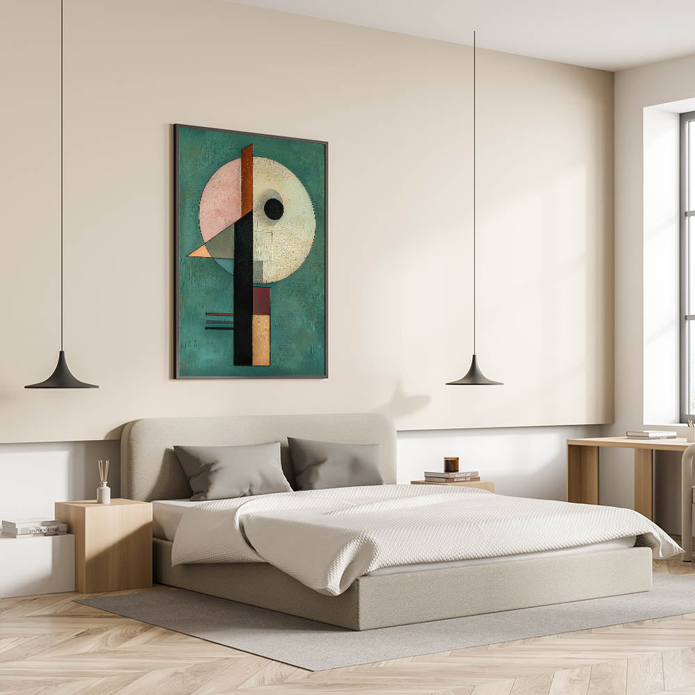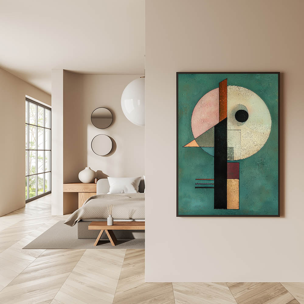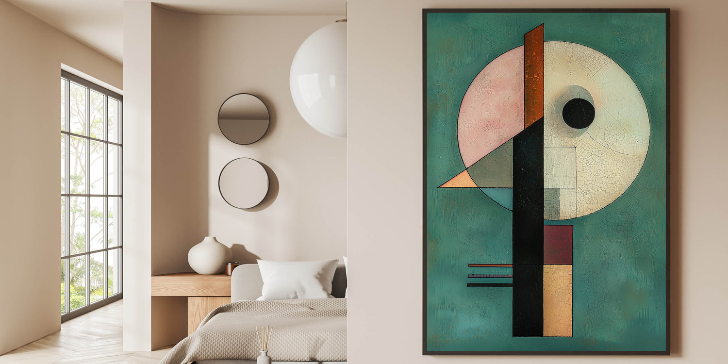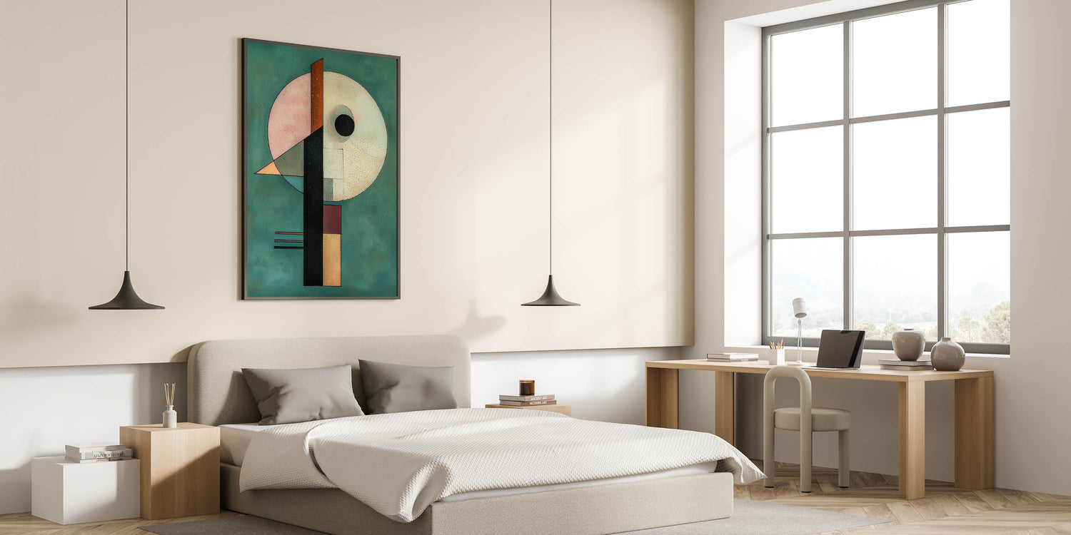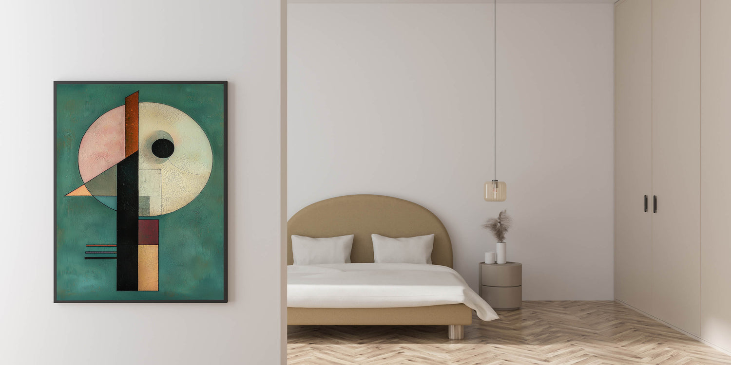 - A unique wall art design for bedrooms, merging abstract geometric shapes with rich hues
