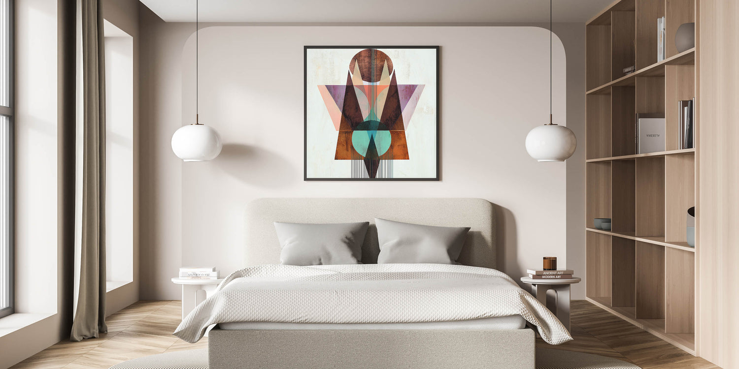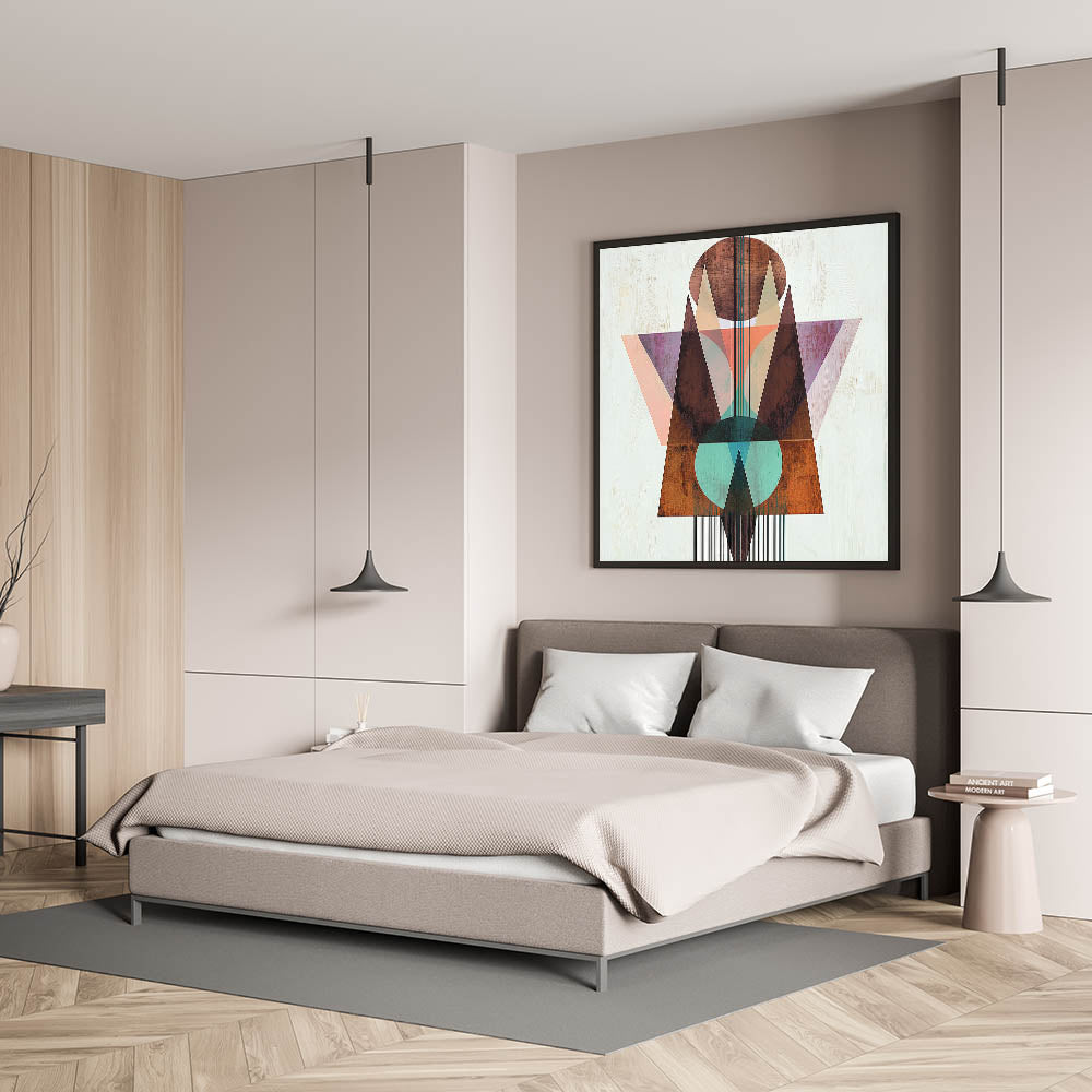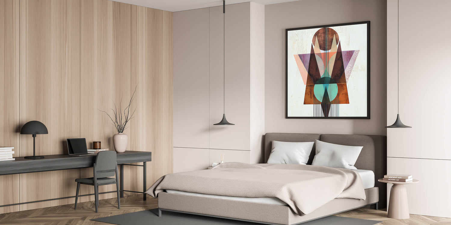 - A unique wall art design for bedrooms, merging geometric abstraction with warm earthy tones