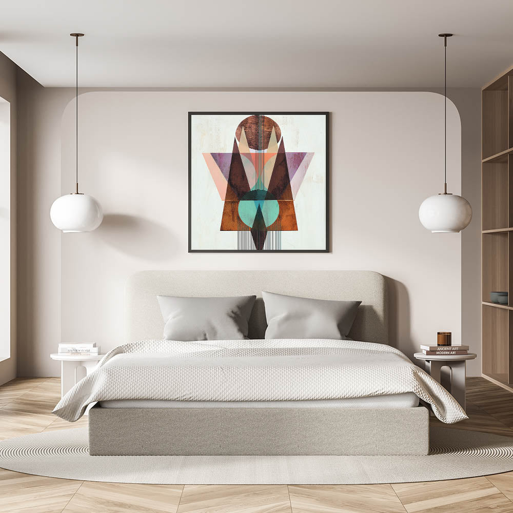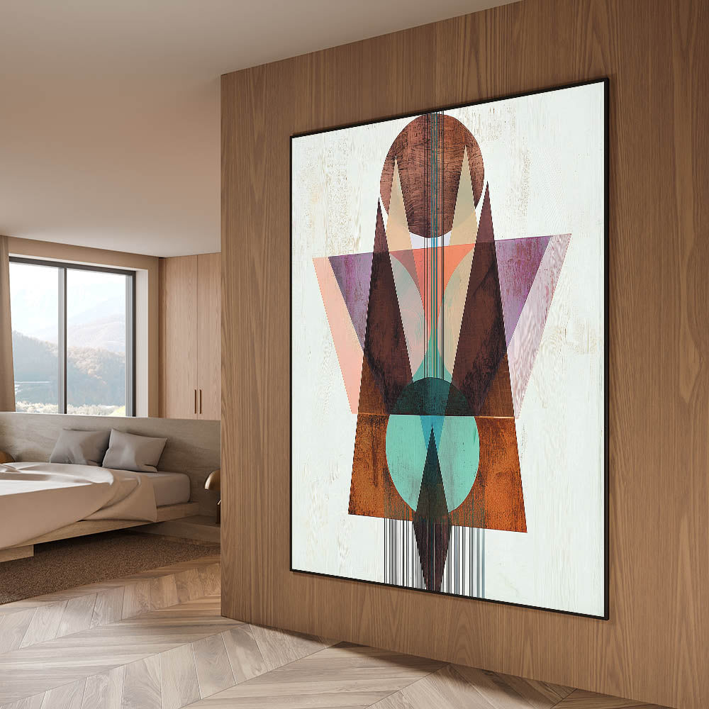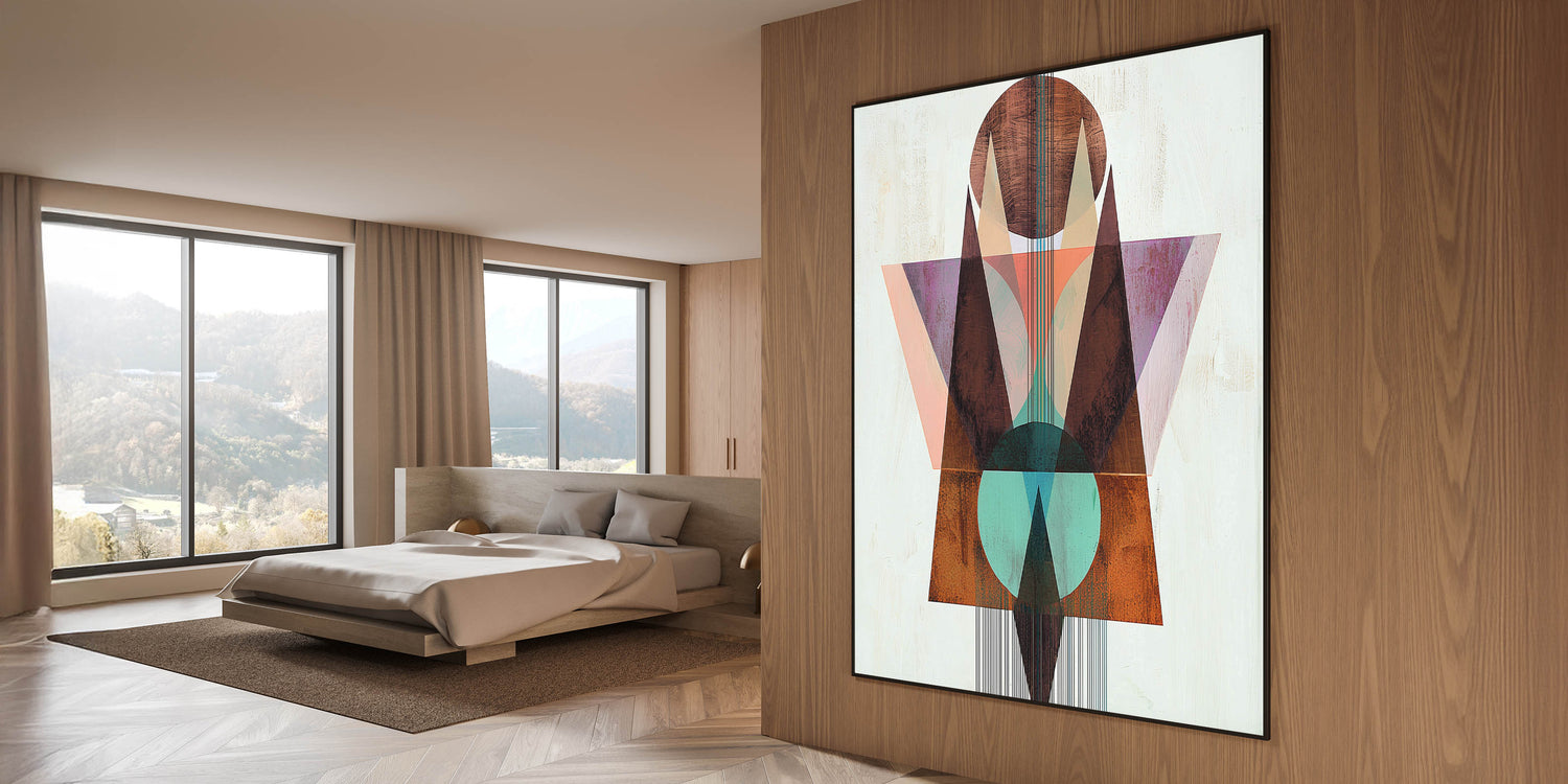 - A unique wall art design for bedrooms, merging geometric abstraction with warm earthy tones