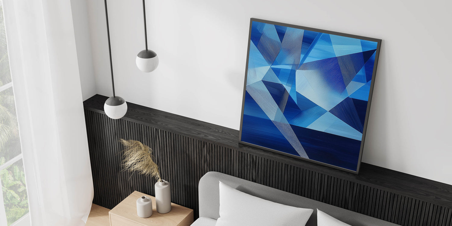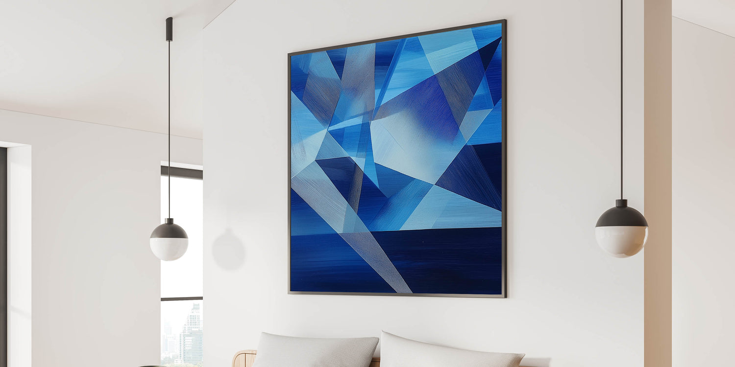 Enhance your bedroom decor with this modern bedroom wall art, featuring an abstract geometric design in deep blue and light blue hues. This high-quality framed canvas print brings a contemporary aesthetic to any space, blending angular patterns with a smooth gradient effect. The striking interplay of shades and shapes creates a sense of movement, making it a stunning focal point for minimalist and modern interiors.