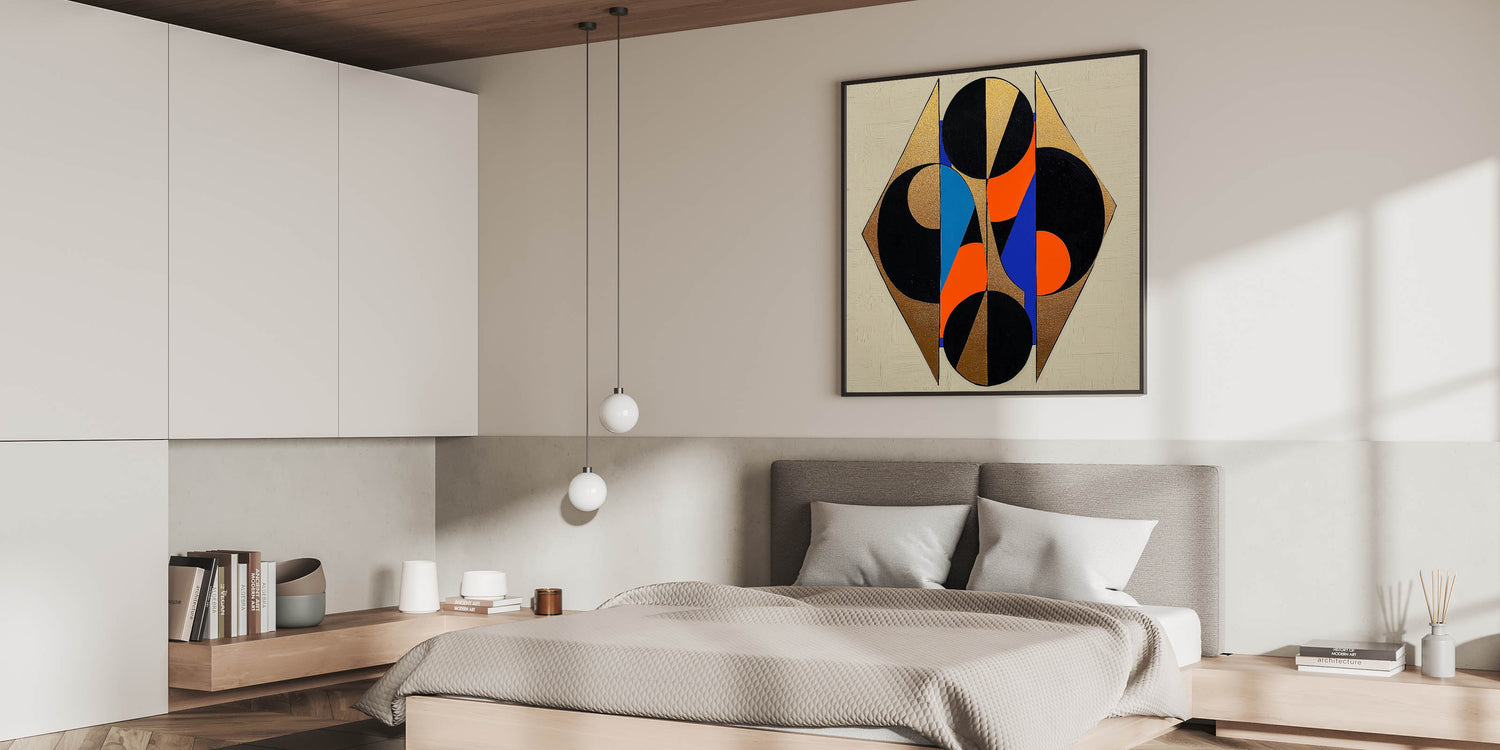 Add a bold and luxurious touch to your bedroom with this modern bedroom wall art, featuring a striking geometric composition in gold, black, orange, and blue. This high-quality framed canvas print blends sharp geometric lines with elegant metallic textures, creating a captivating statement piece. The contrast between deep black and shimmering gold adds depth and sophistication, while vibrant pops of orange and blue bring energy to the design.