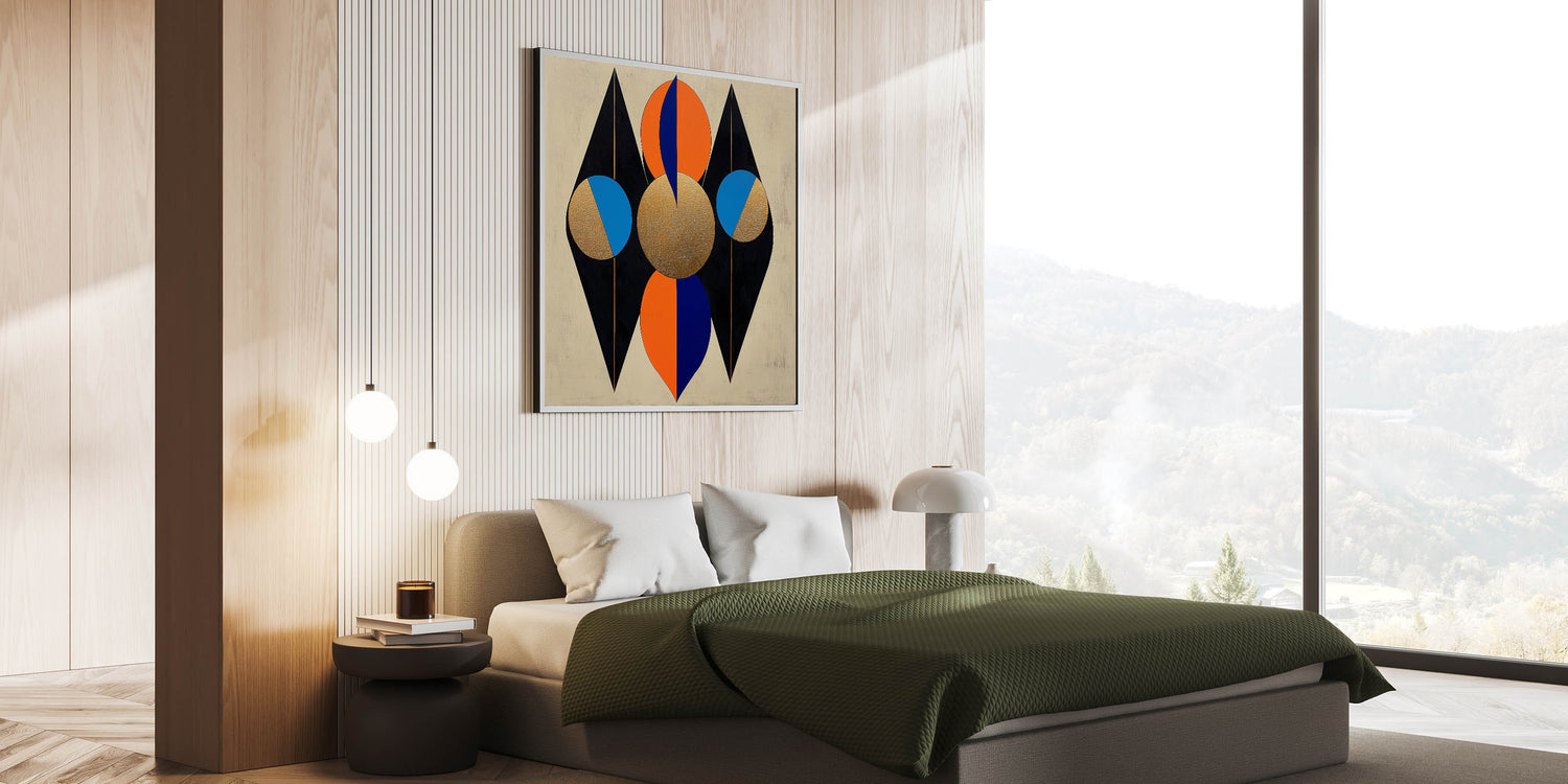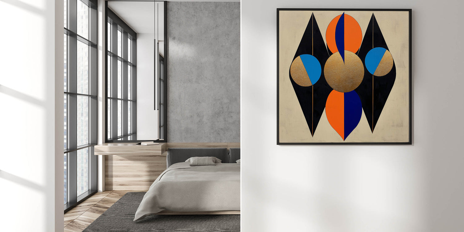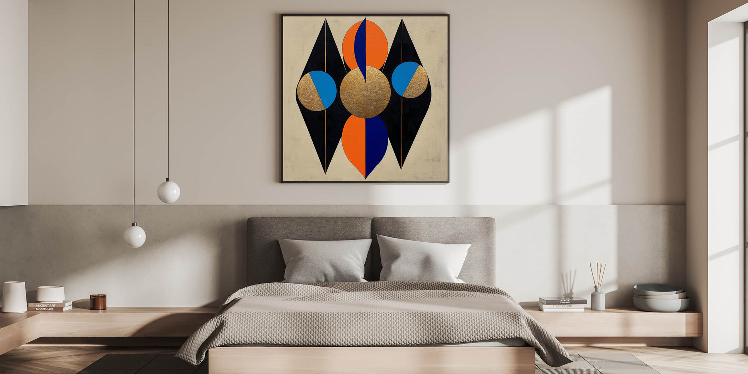 Bring a bold and luxurious aesthetic to your bedroom with this modern bedroom wall art, featuring a striking geometric design in gold, black, orange, and blue. This high-quality framed canvas print blends sharp lines and circular forms with metallic textures, creating a visually dynamic and contemporary piece. The contrast between deep black, rich gold, and vibrant pops of color adds depth, making it a perfect focal point for modern interiors.