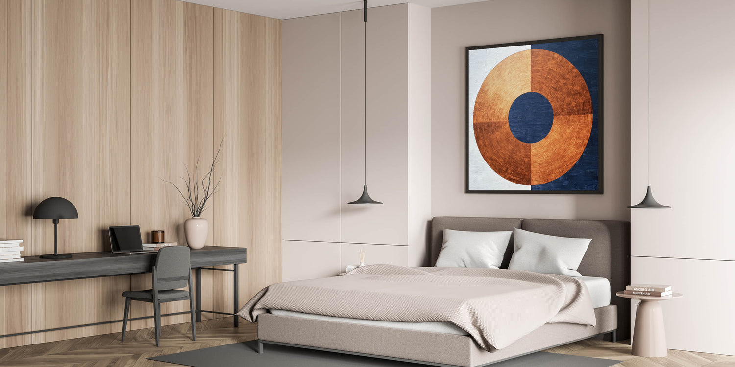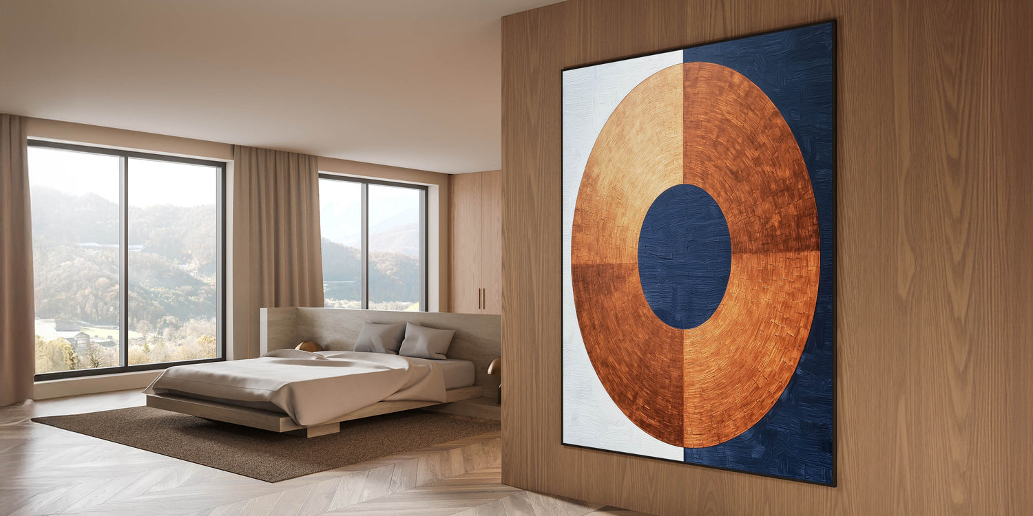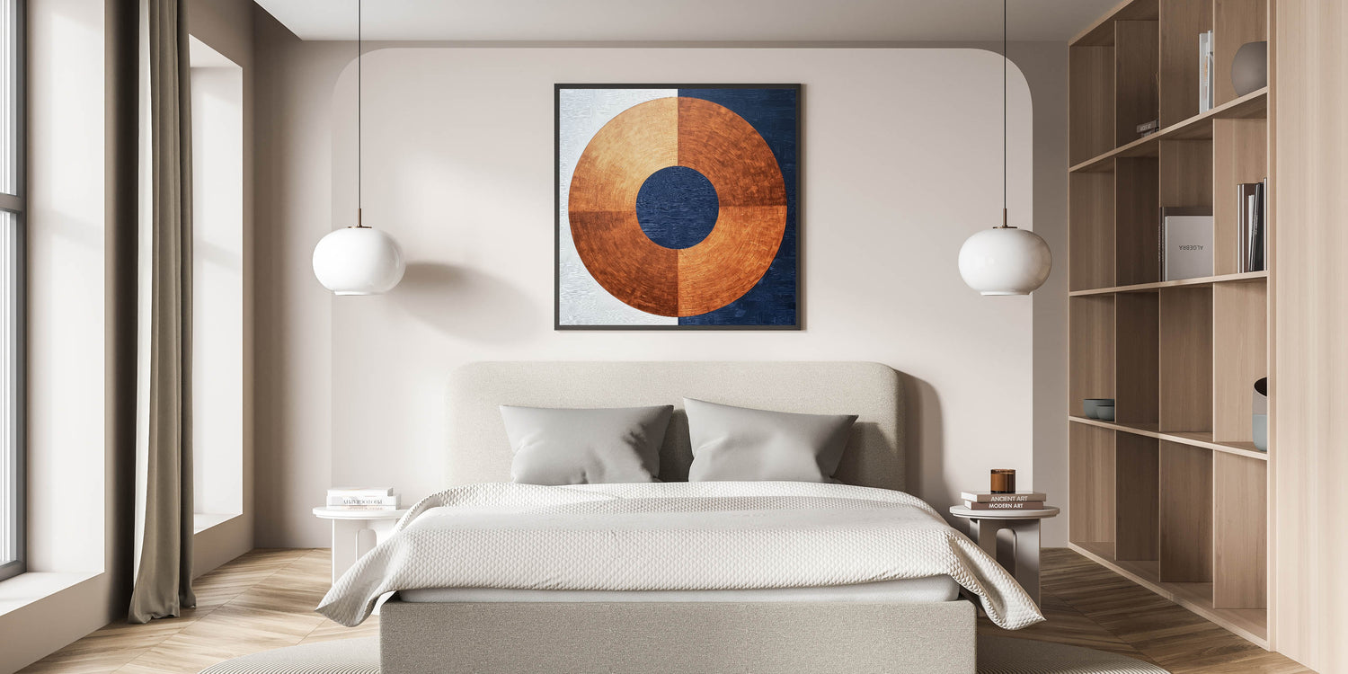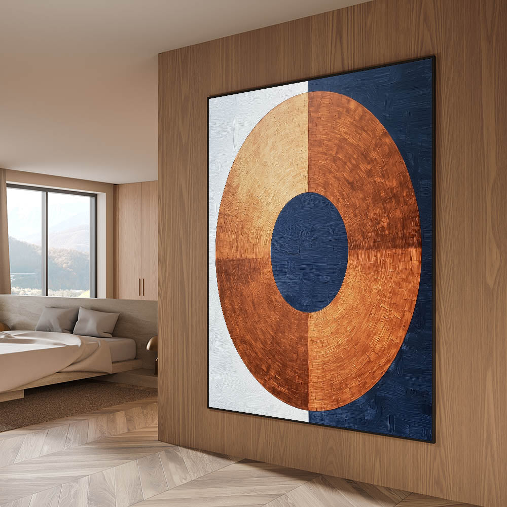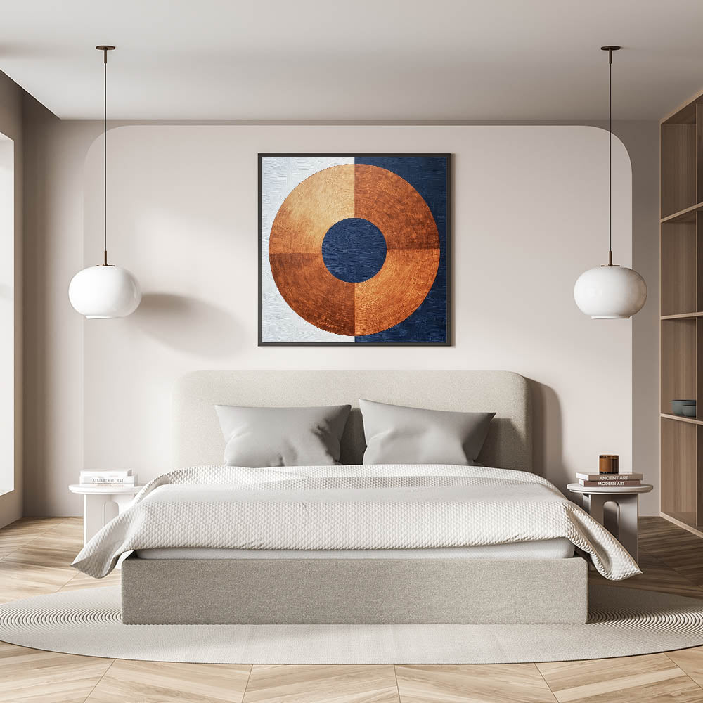 Elevate your bedroom with this minimalist abstract bedroom wall art, featuring a striking circular design in rich copper, navy blue, and white. The bold geometric contrast between warm metallic tones and deep blue hues creates a refined, modern aesthetic. This customizable bedroom wall art blends industrial-inspired textures with contemporary elegance, making it a standout choice for any bedroom.
