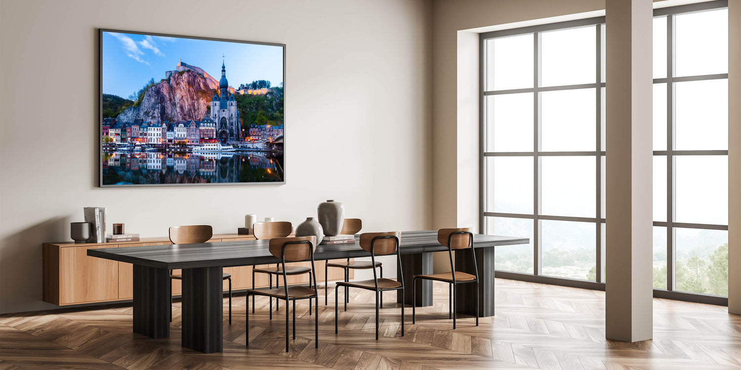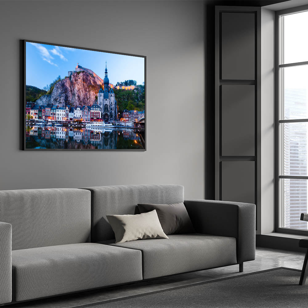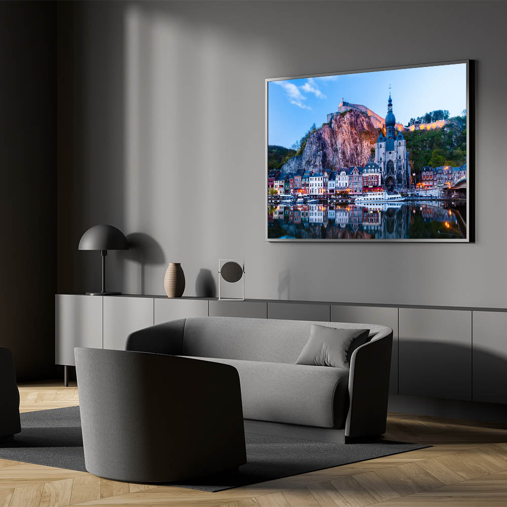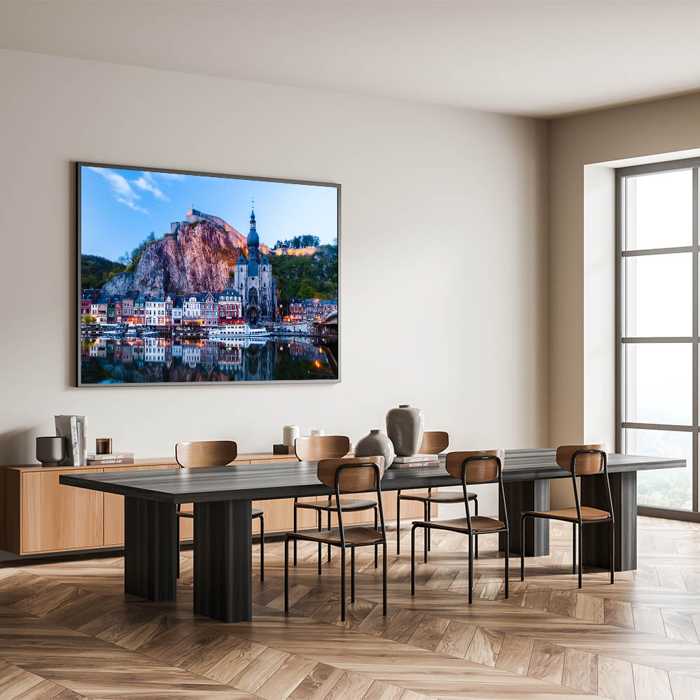 Discover the captivating beauty of Dinant with this stunning piece of Belgian landscape photography. Featuring the scenic riverfront, the iconic Citadel of Dinant perched on a rocky cliff, and the Collegiate Church of Notre-Dame, this Belgium wall art is perfect for bringing a piece of European charm into your home. The tranquil reflections on the river and the blend of natural and architectural beauty make this artwork an ideal choice for any space.