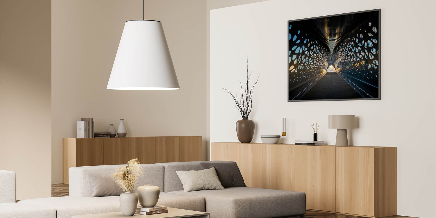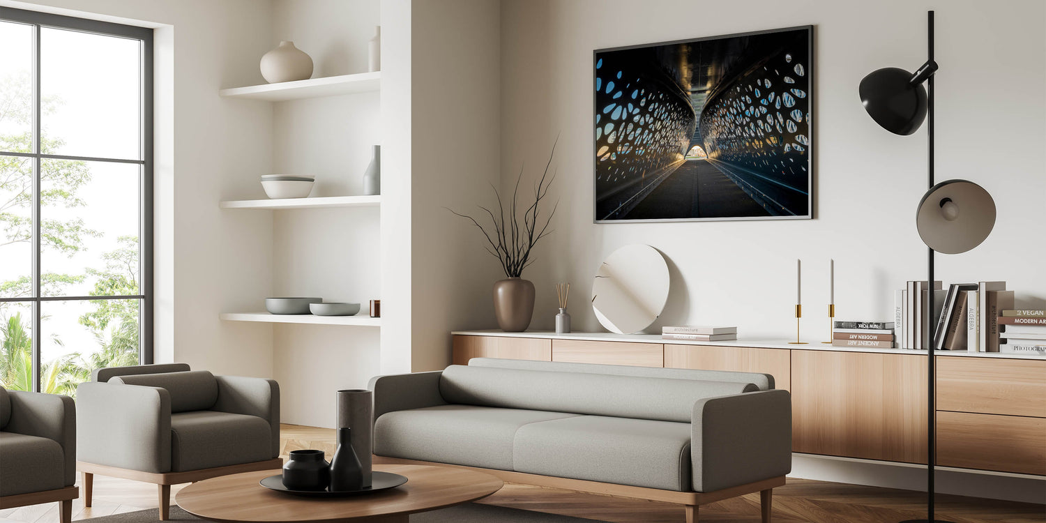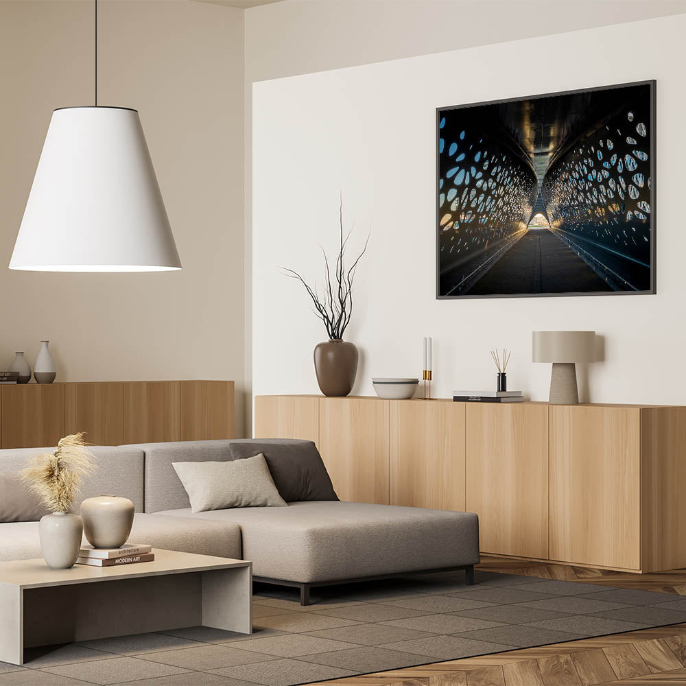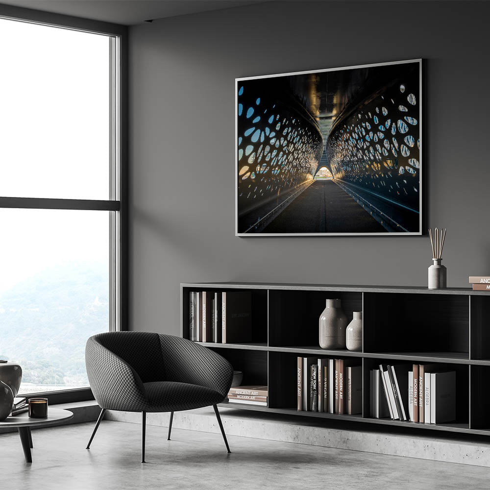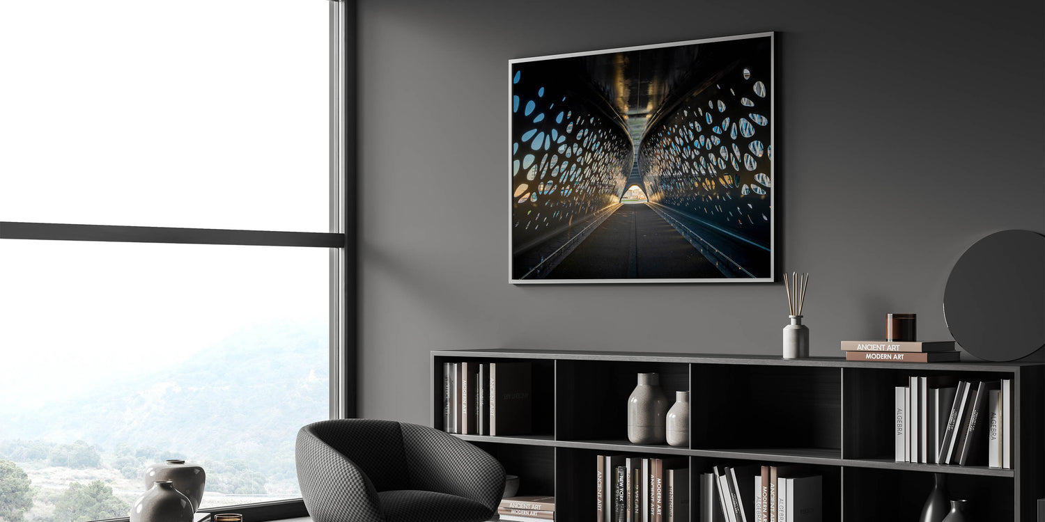 This stunning Belgium wall art captures the sleek, modern design of an architectural tunnel in Belgium, perfect for lovers of contemporary design. The interplay of light and shadow through the tunnel's perforated surface creates a dynamic visual experience that stands out in any modern interior. Ideal for art collectors and those who appreciate Belgian landscape photography with a unique urban twist.