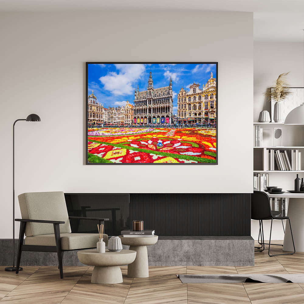 - Vibrant Detailing: This artwork showcases the stunning colors and intricate details of Brussels' Flower Carpet and surrounding historic buildings.