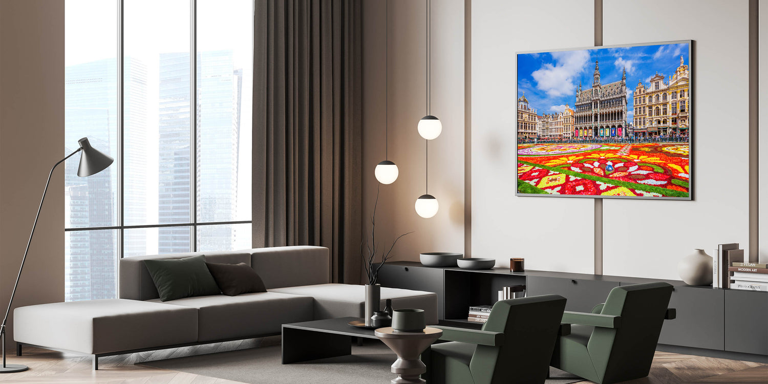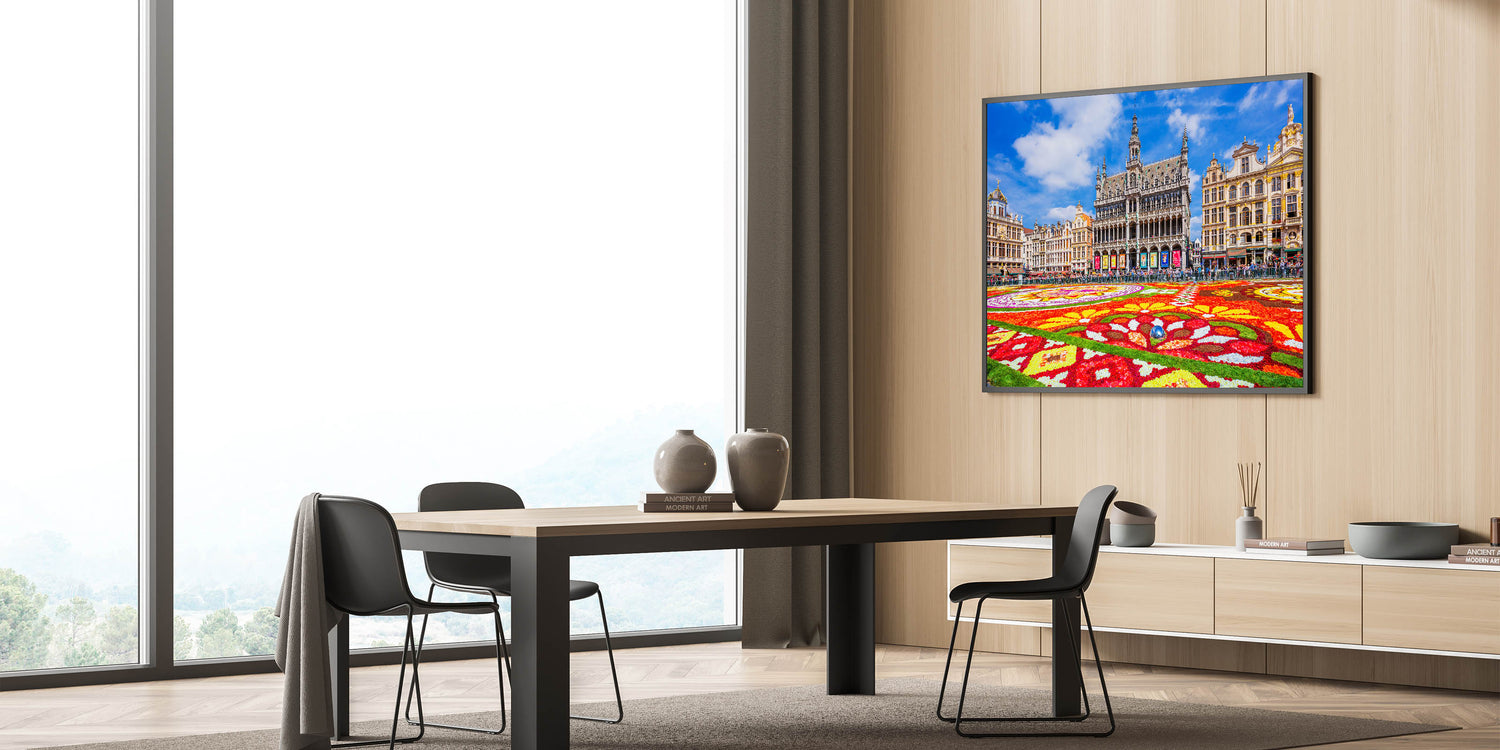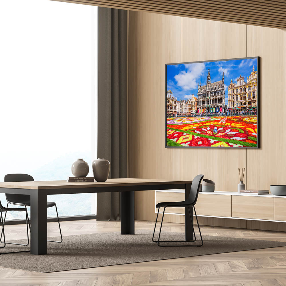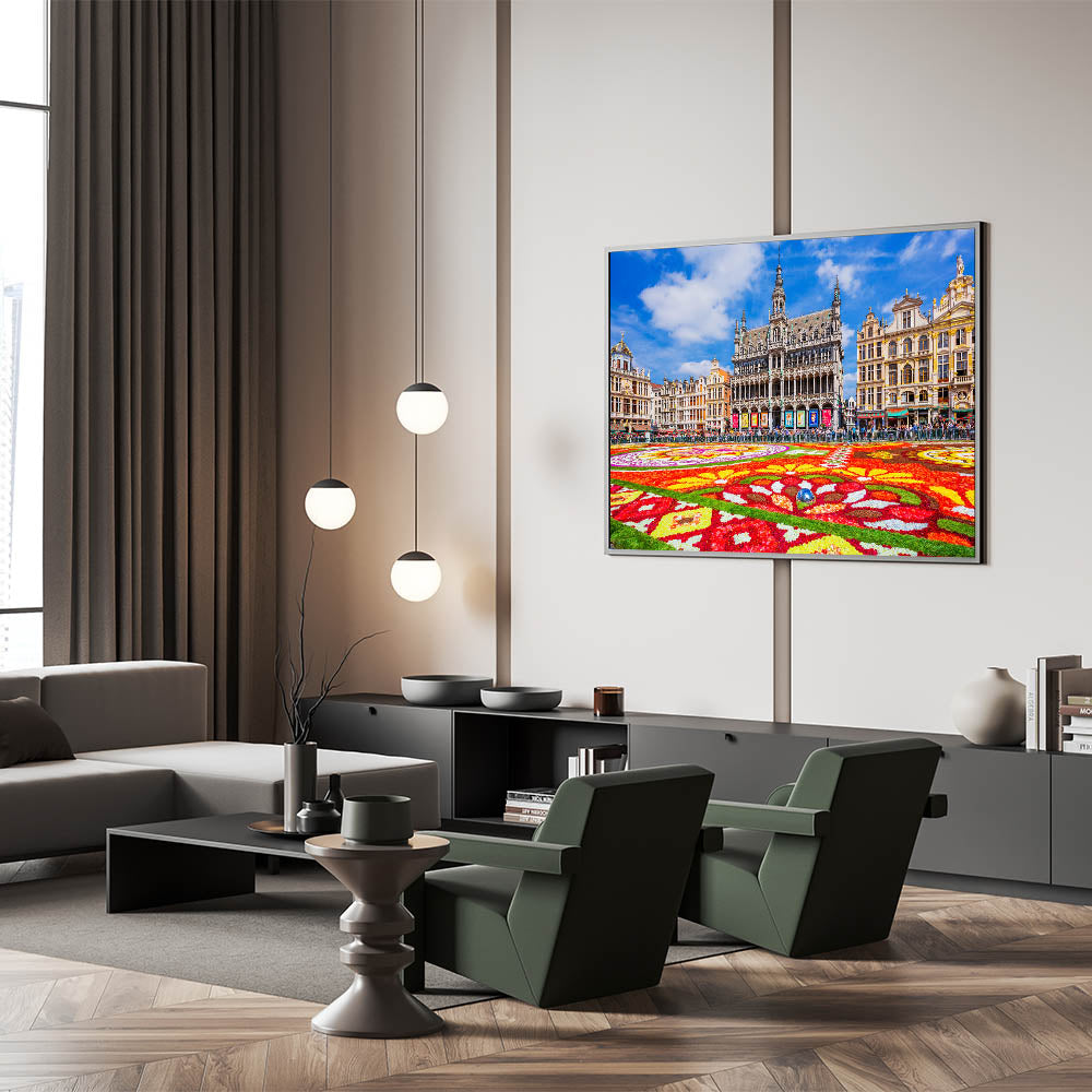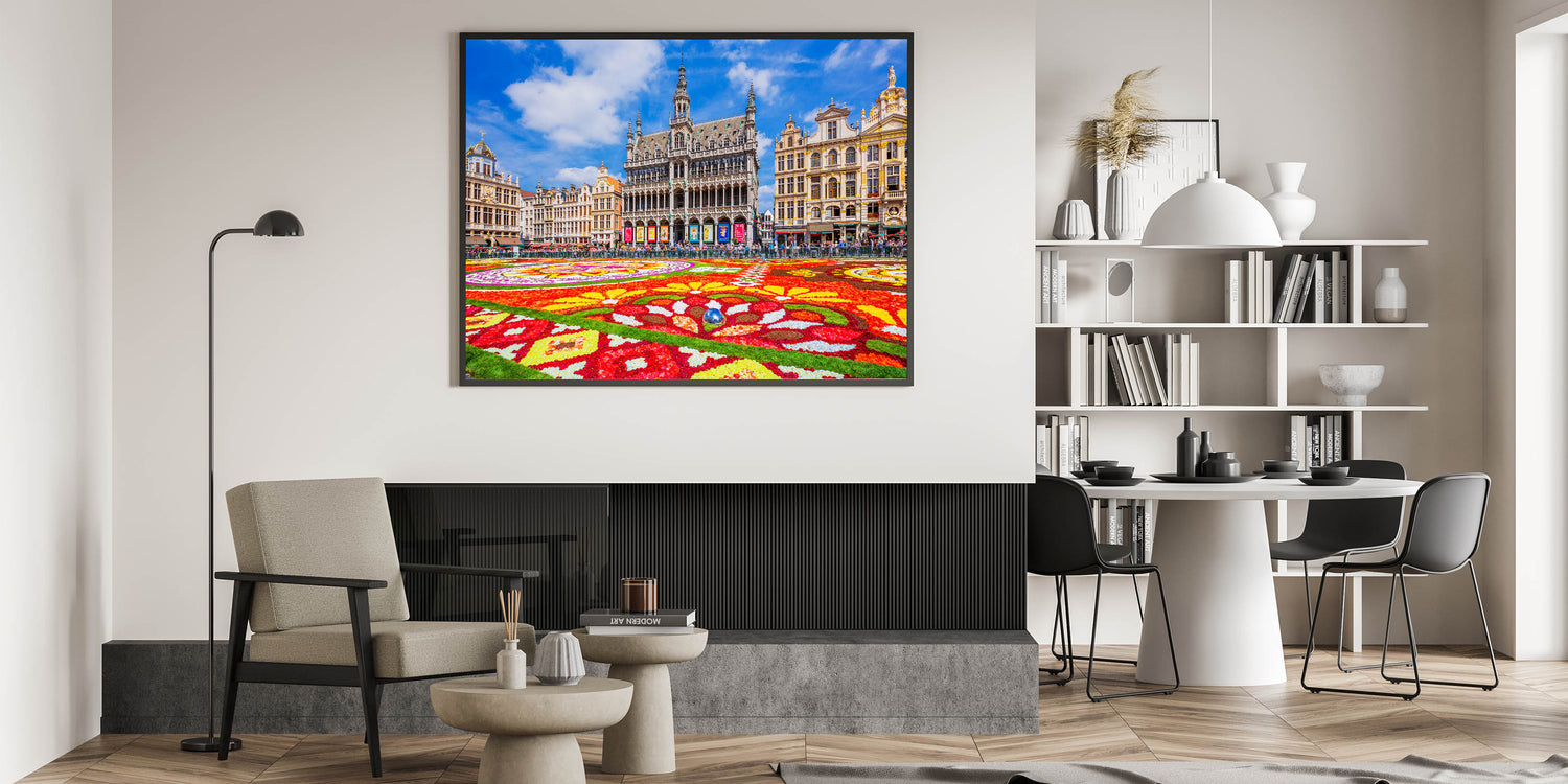 Bring the vibrant energy of Belgium's famous Flower Carpet at the Grand Place in Brussels into your home with this eye-catching Belgium wall art. The colorful flower arrangements beautifully contrast with the intricate architecture of the historical buildings surrounding the square. This Belgium canvas art captures the essence of Belgian culture and history, making it the perfect centerpiece for any room that appreciates European elegance and heritage.