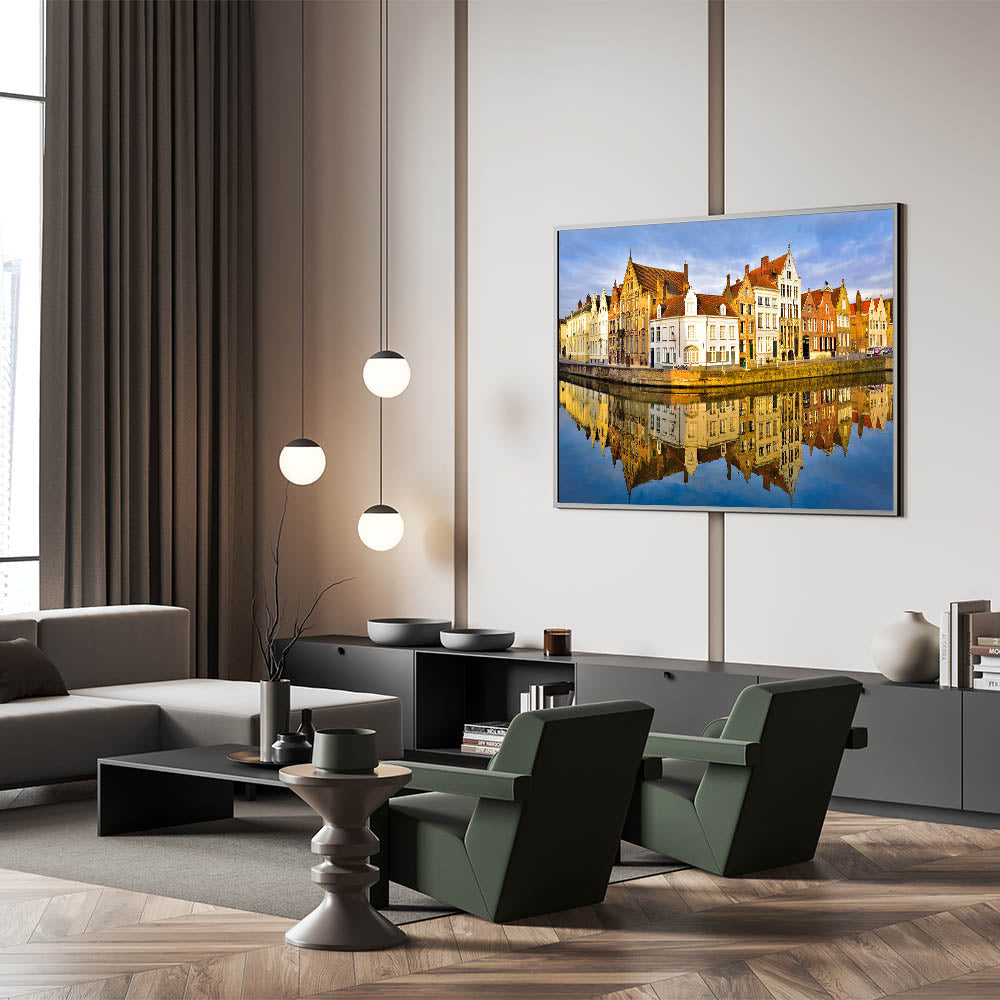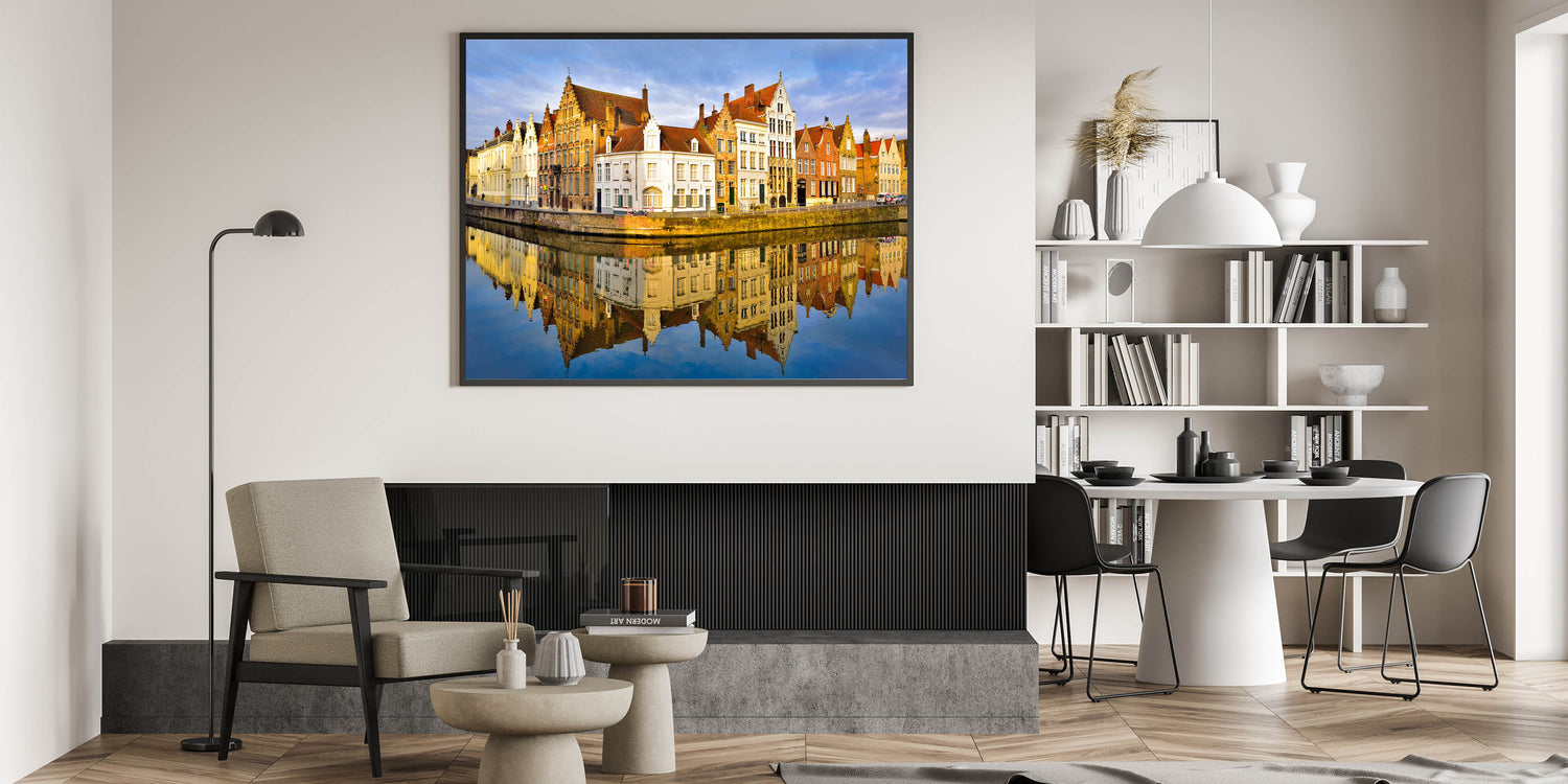 Enhance your home with this vibrant Belgium travel art, showcasing the colorful reflections of the historic buildings in Bruges. This stunning Belgium wall art captures the beauty of the city’s architectural heritage, mirrored perfectly on the calm waters of the canal. The golden light of the sun enhances the warm tones of the brick facades, bringing a lively and inviting atmosphere to your space.