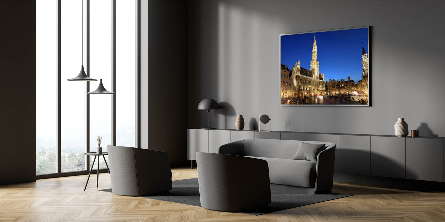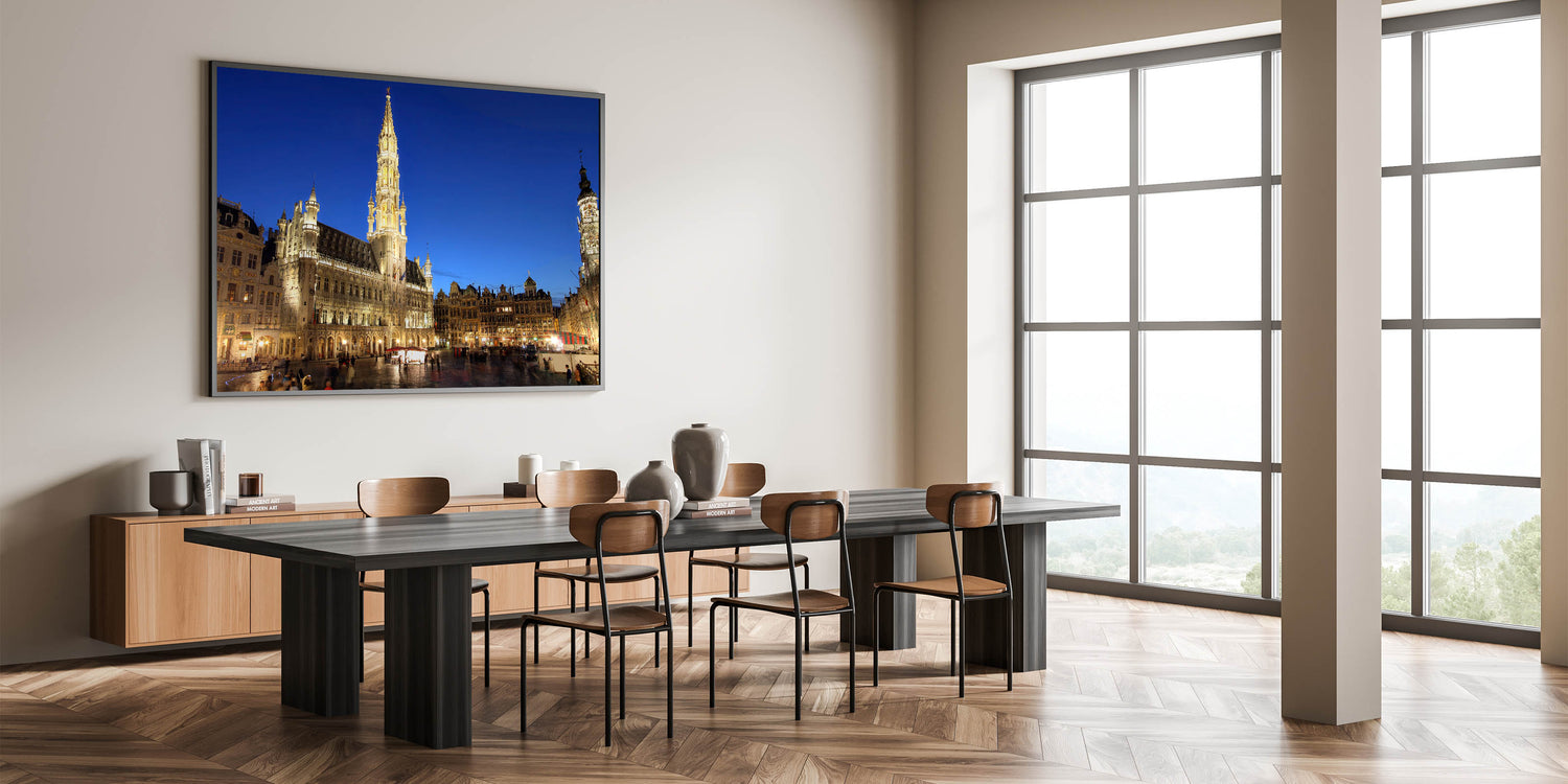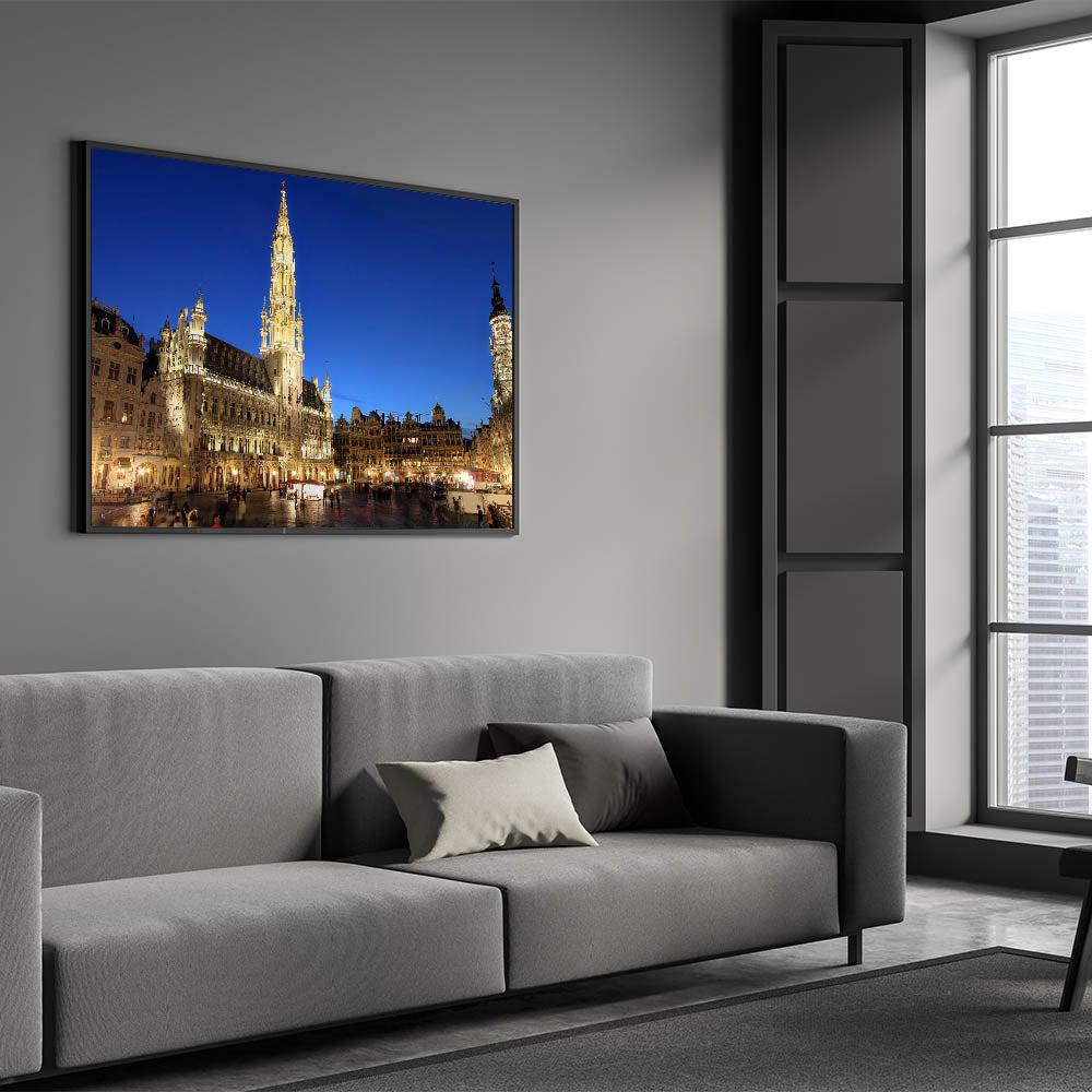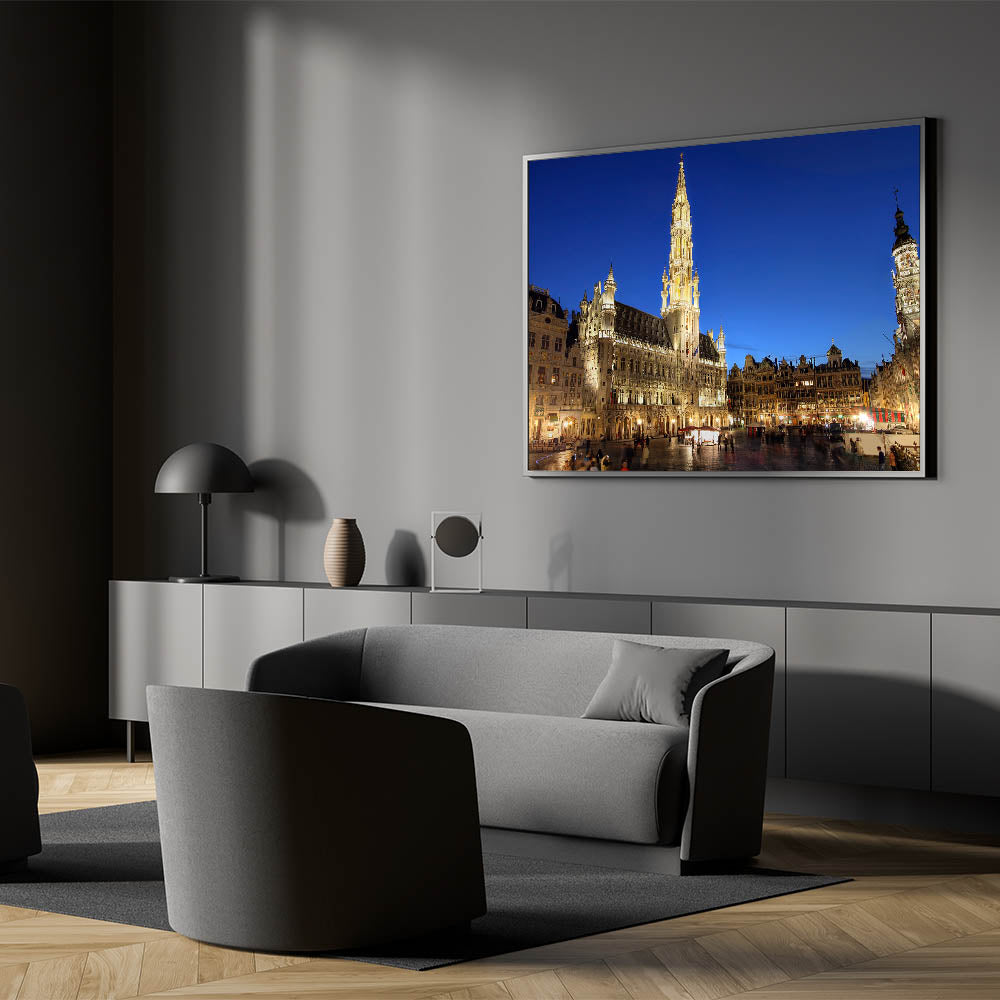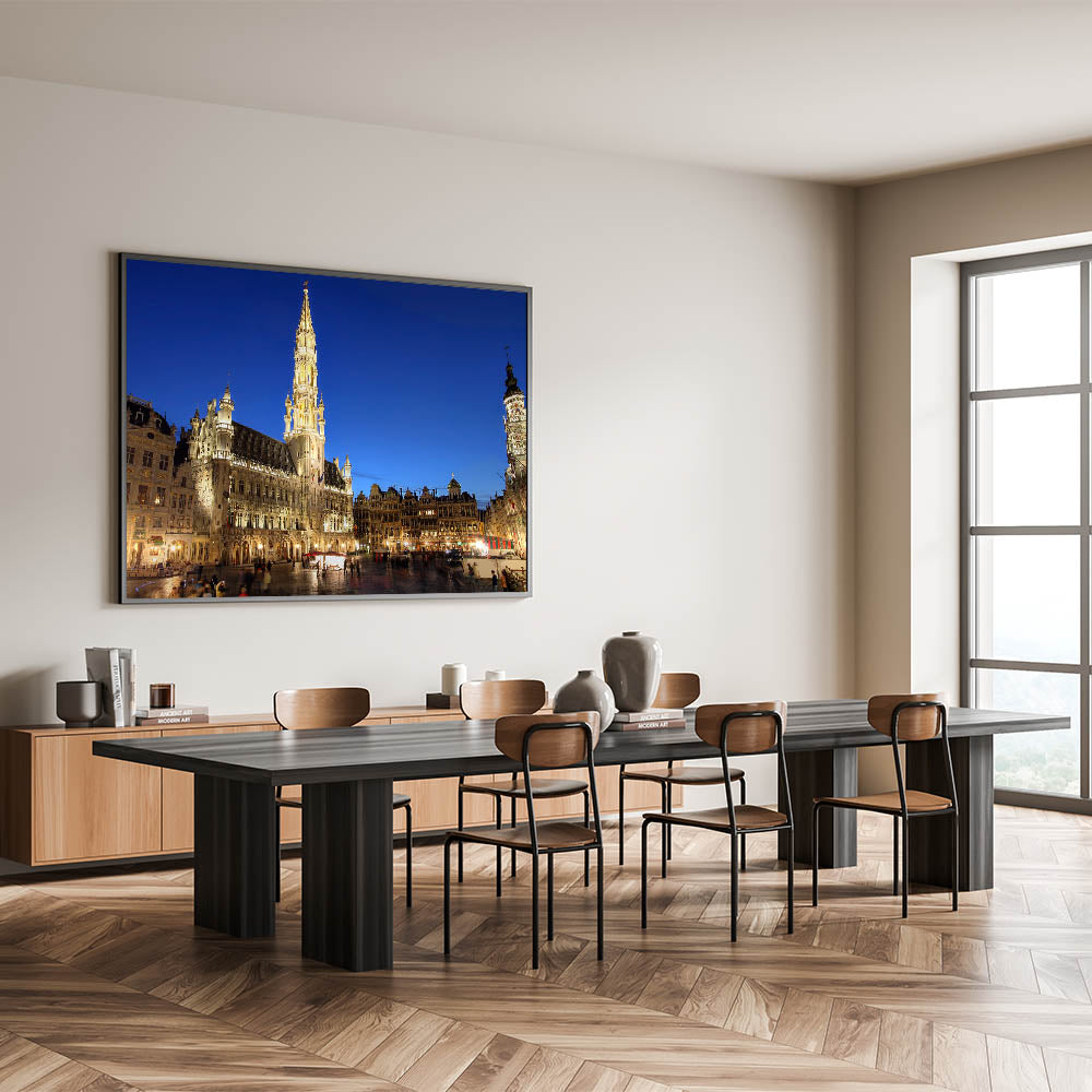 Bring the charm of Belgium into your home with this stunning wall art featuring the Grand Place in Brussels, a UNESCO World Heritage Site. This Belgium wall art captures the illuminated architecture of the iconic square, showcasing the grandeur and beauty of Belgian scenery at twilight.