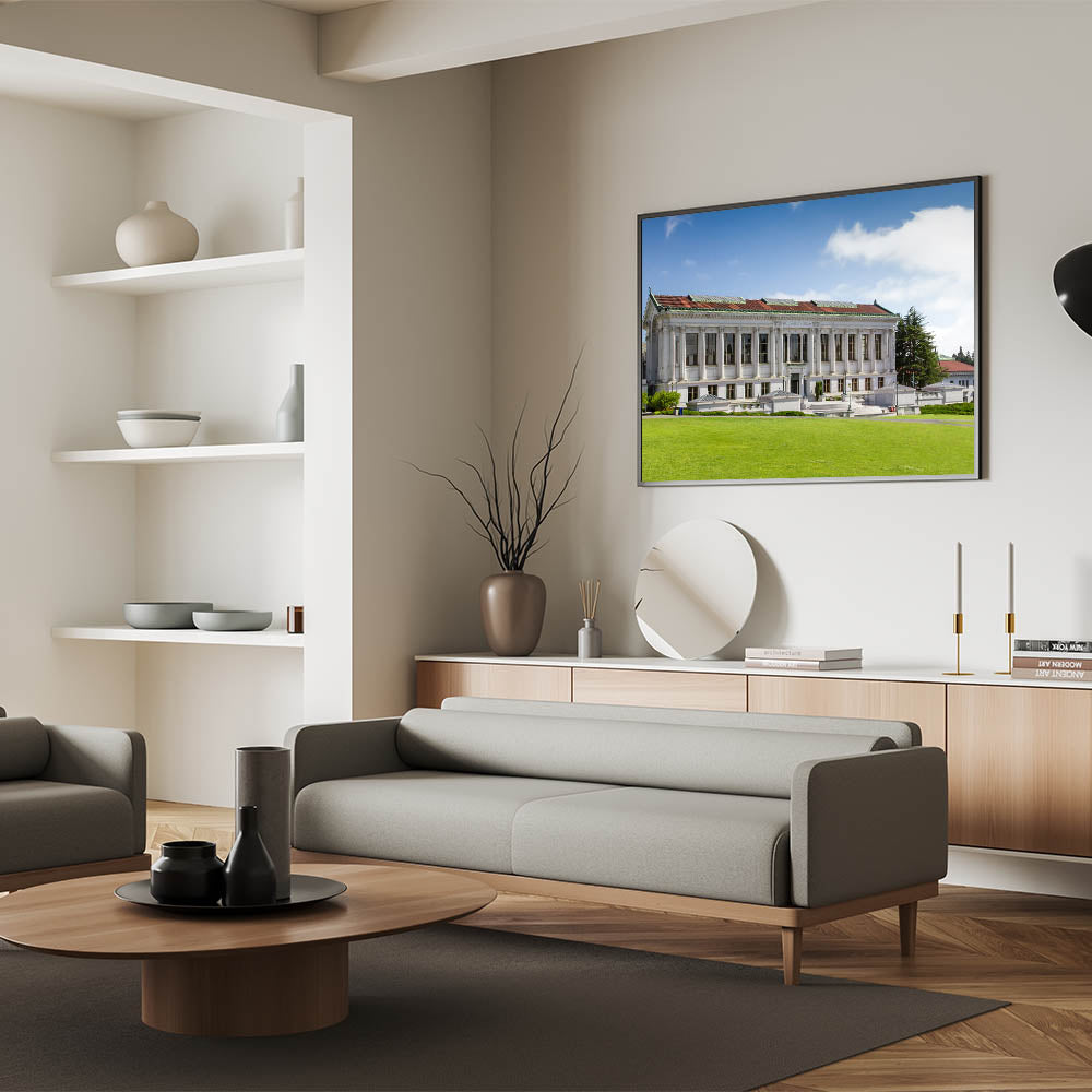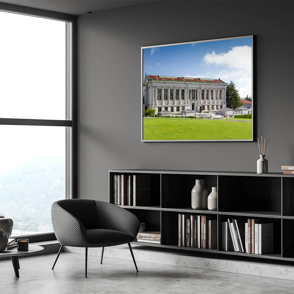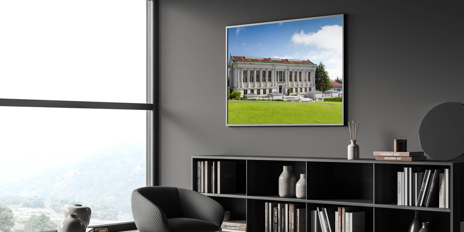 Capture the elegance of Berkeley’s historic university campus with this captivating wall art, featuring the timeless architecture of the university’s library. The stunning Berkeley wall art presents a perfect blend of classic design and natural beauty, showcasing the grandeur of the library’s columns against a serene blue sky and lush green lawn.
