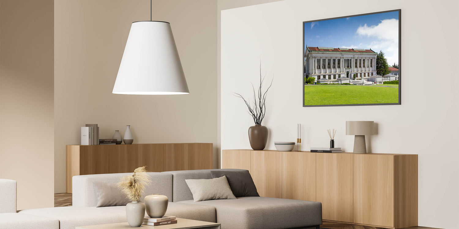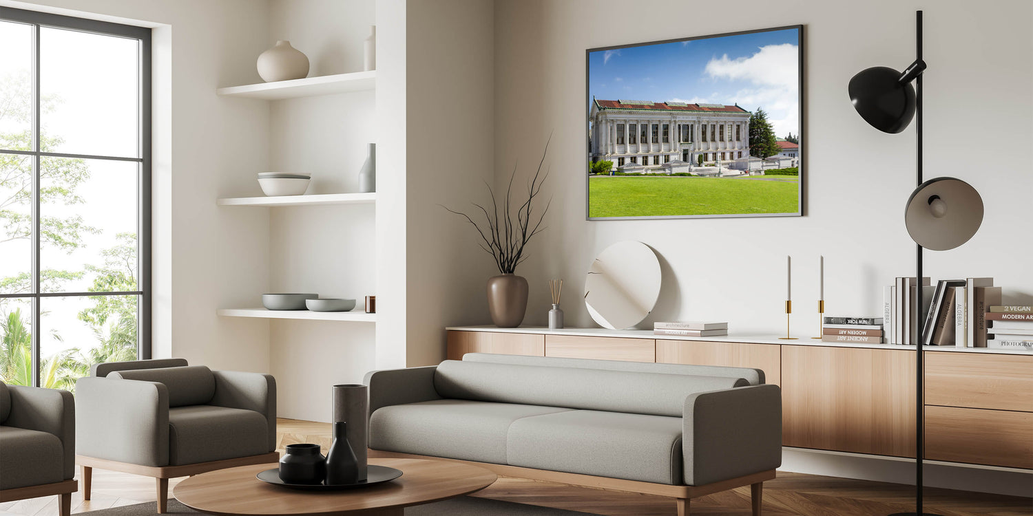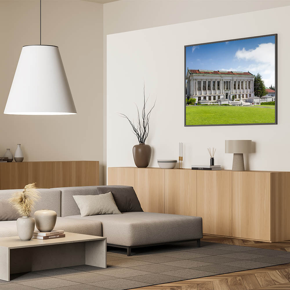 Capture the elegance of Berkeley’s historic university campus with this captivating wall art, featuring the timeless architecture of the university’s library. The stunning Berkeley wall art presents a perfect blend of classic design and natural beauty, showcasing the grandeur of the library’s columns against a serene blue sky and lush green lawn.