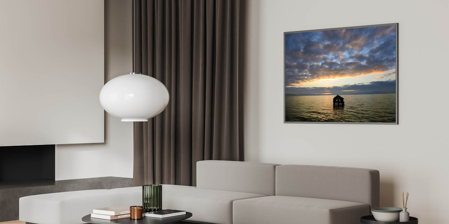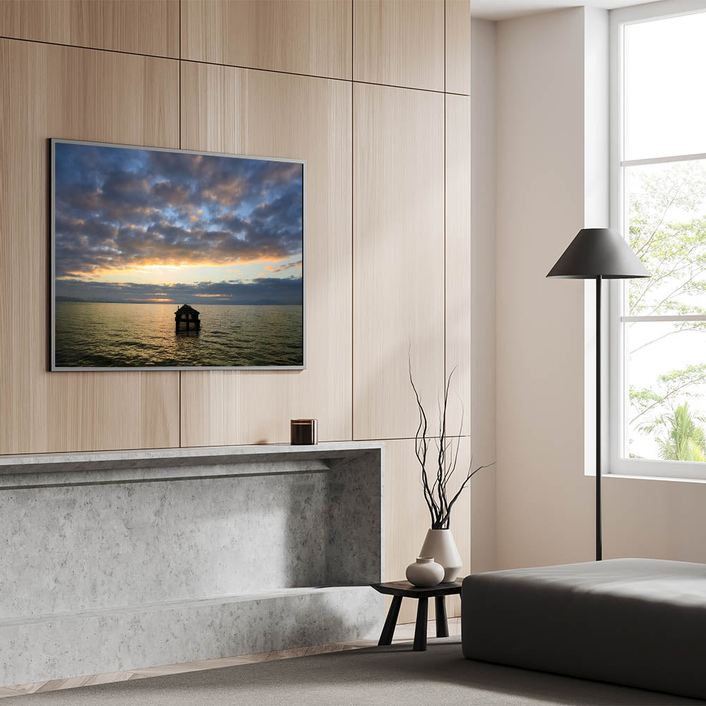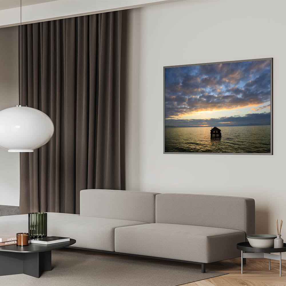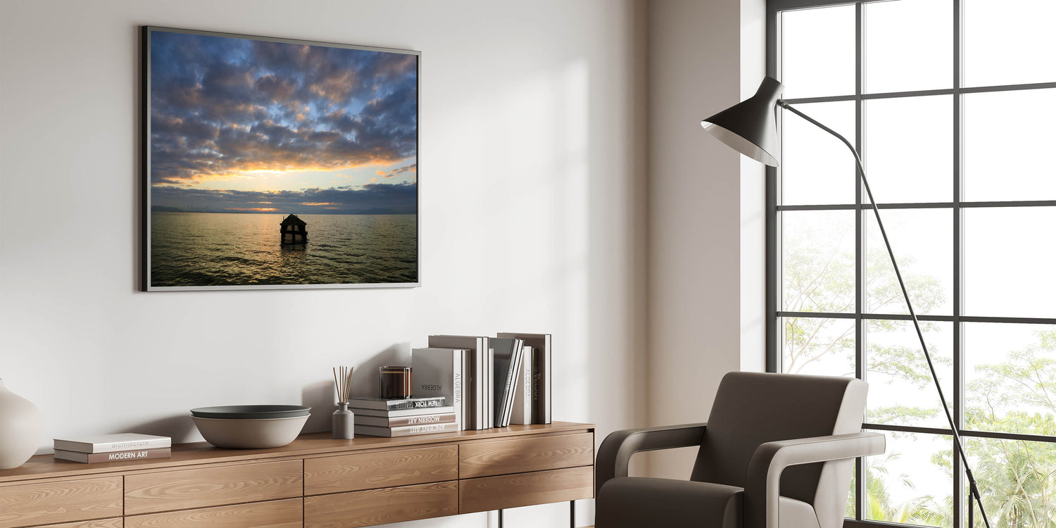 - Vivid, high-definition print capturing the soft hues of a Berkeley sunset over calm waters.