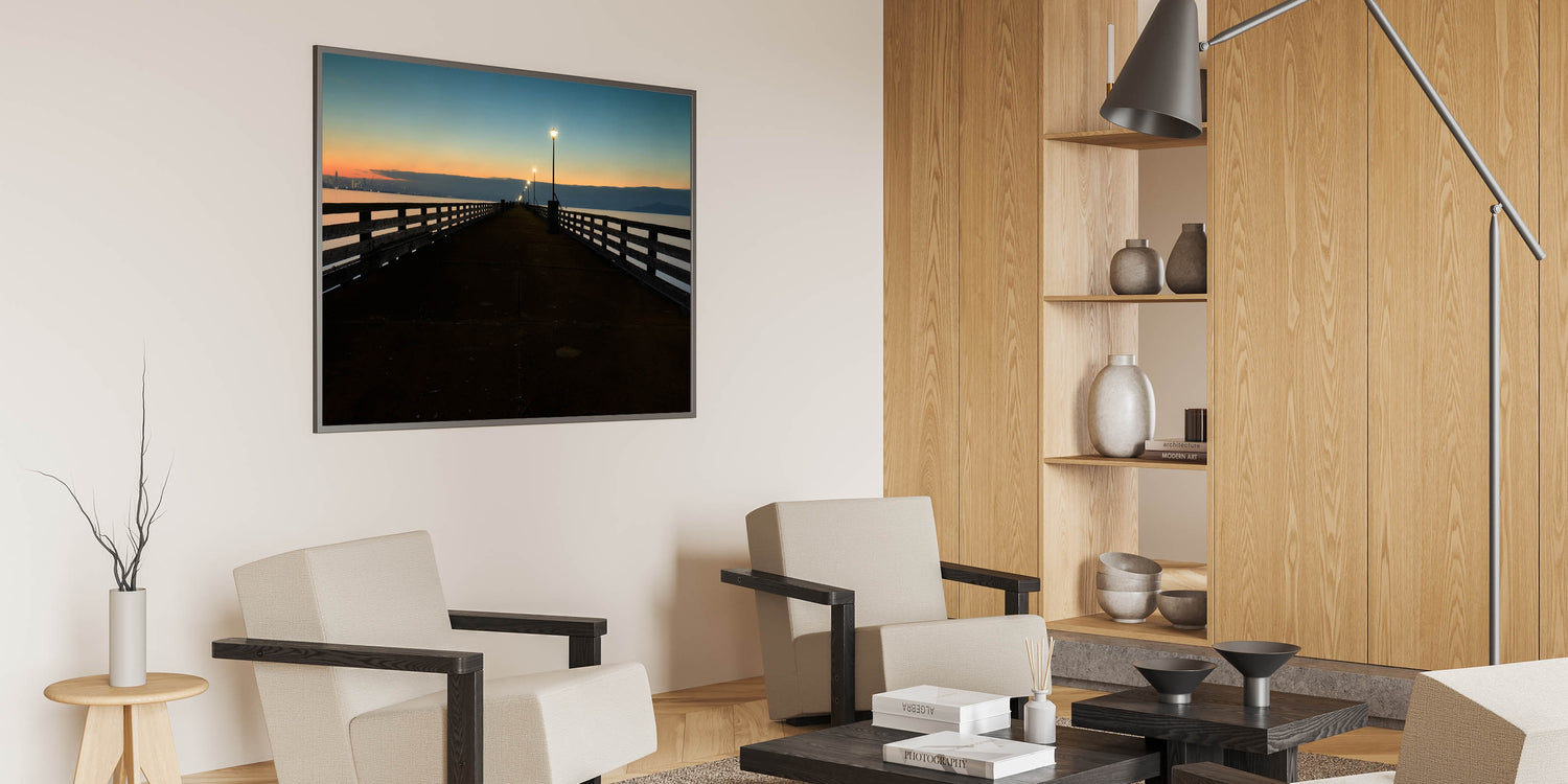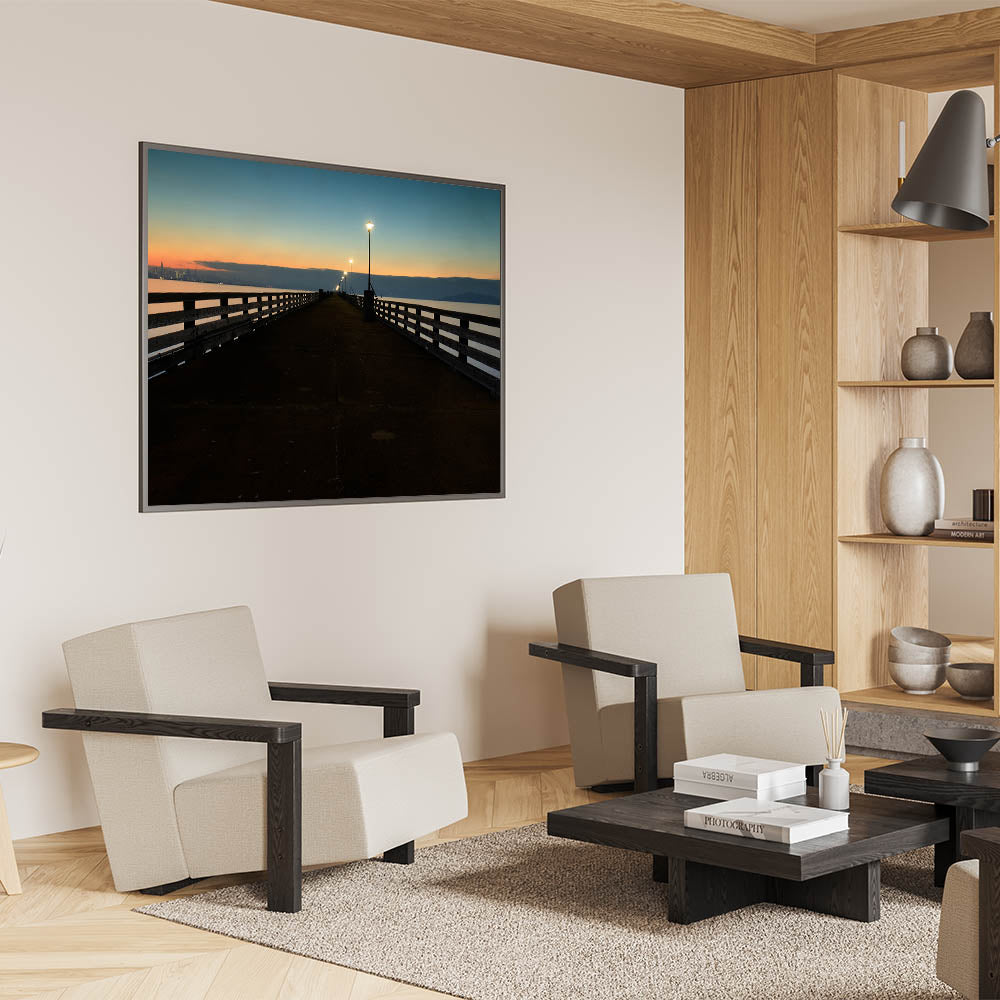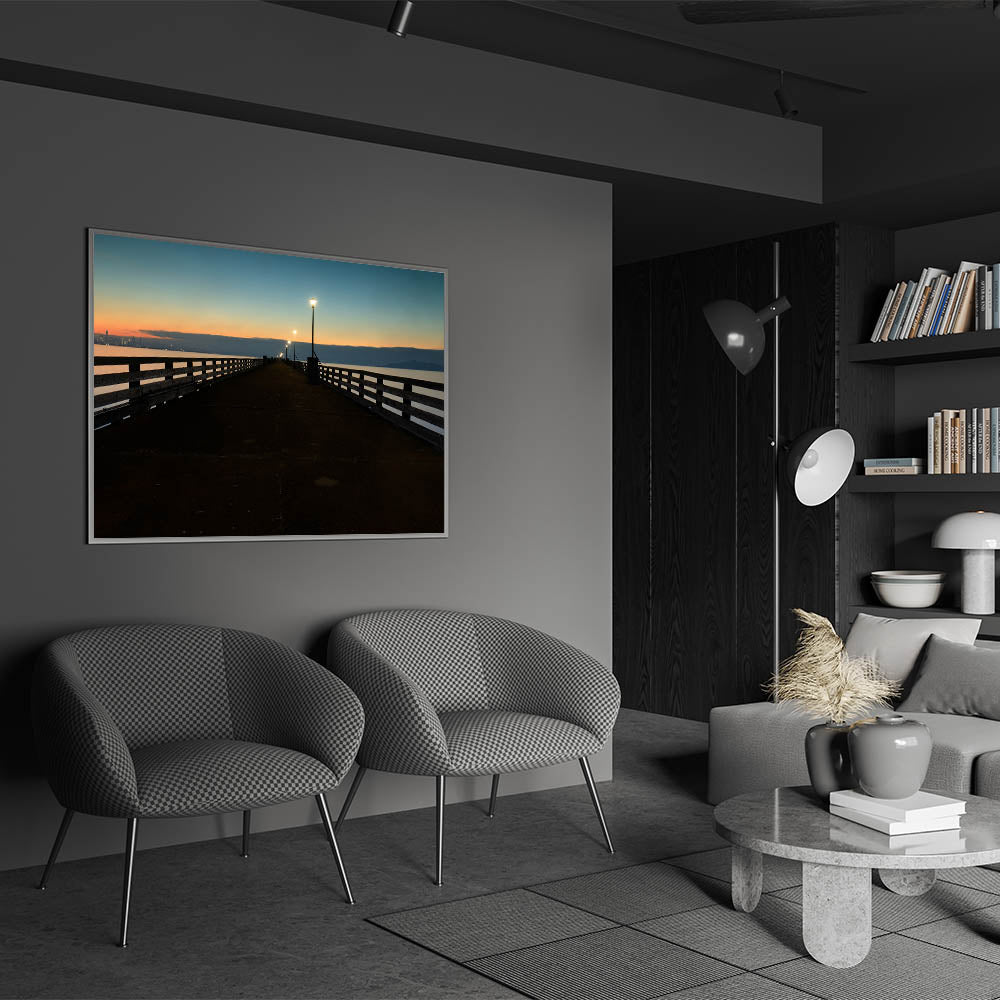 - High-resolution print showcasing the serene beauty of a twilight pier with soft city lights in the distance.