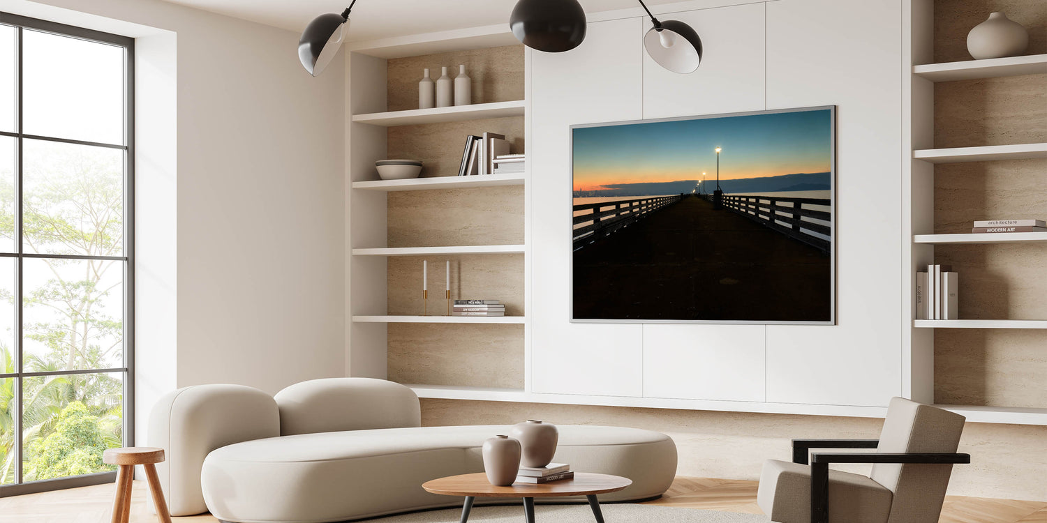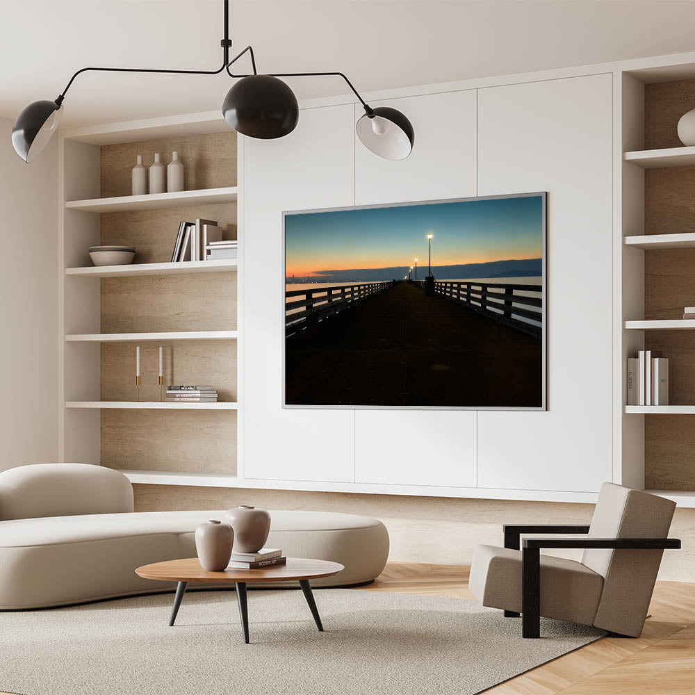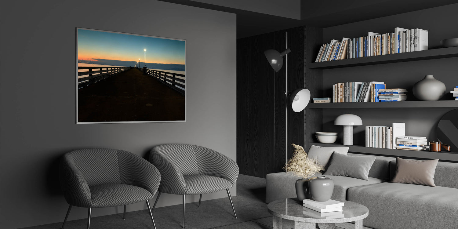 - High-resolution print showcasing the serene beauty of a twilight pier with soft city lights in the distance.