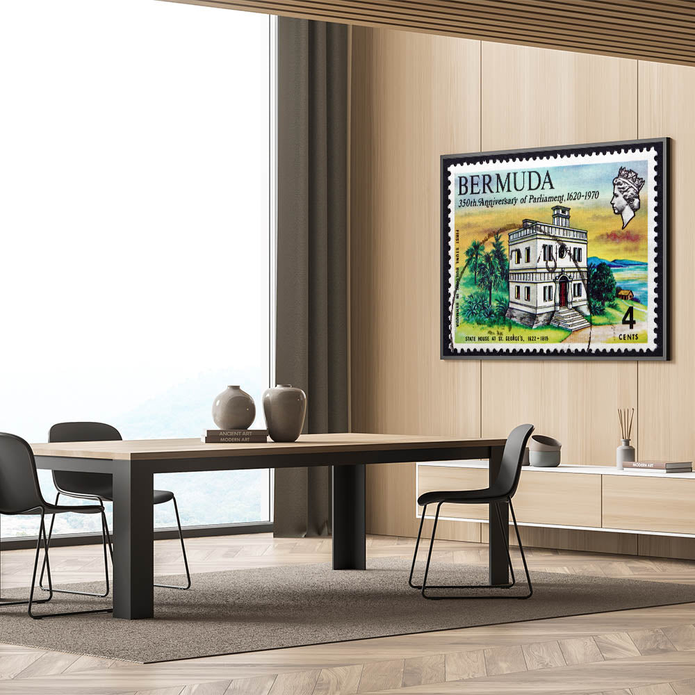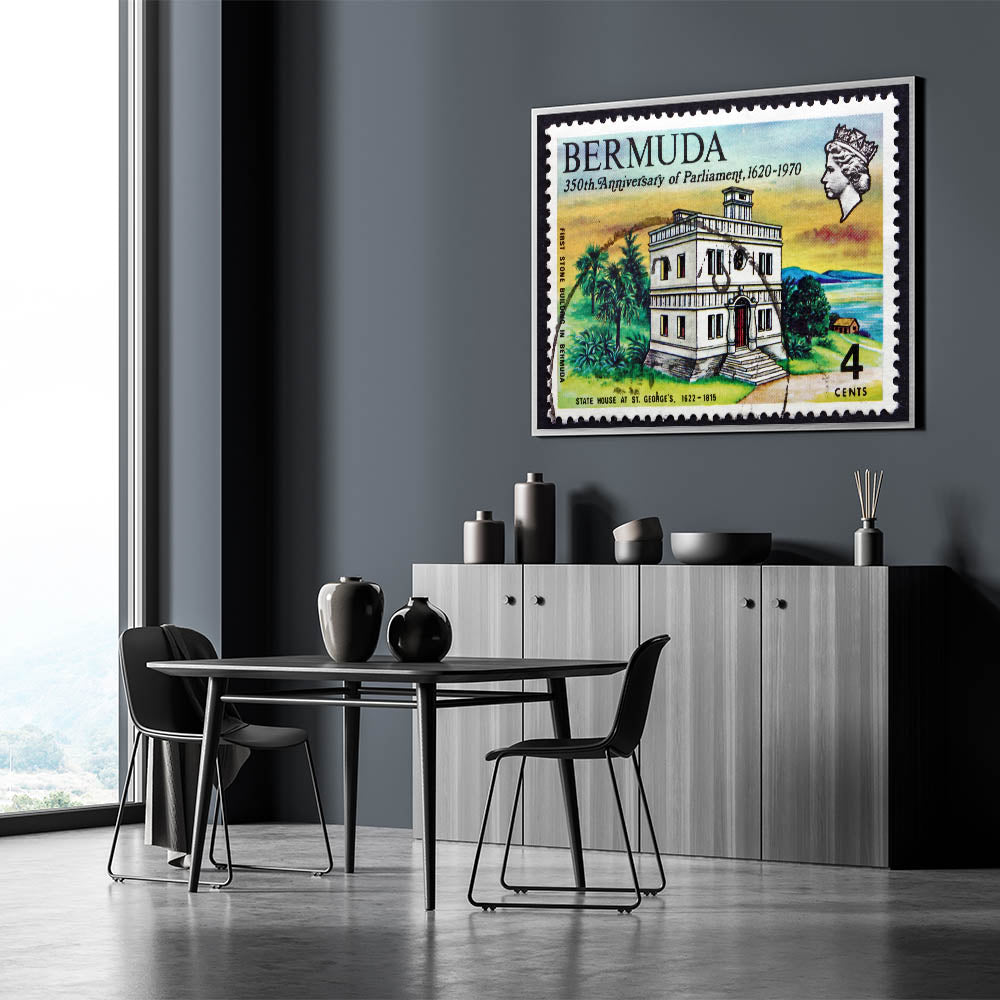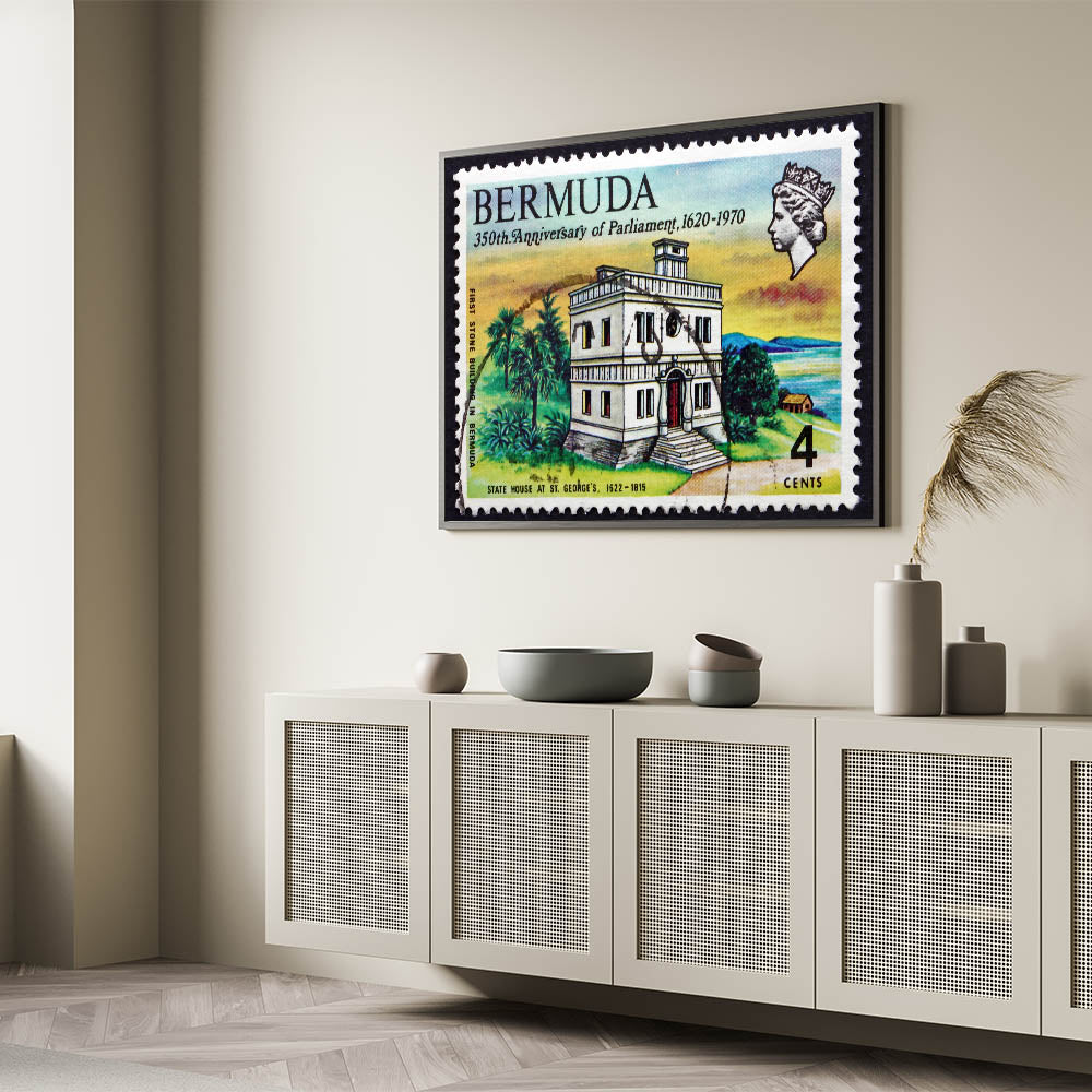 This captivating piece of Bermuda Beach Canvas art captures the essence of Bermuda’s rich history with a vintage stamp featuring the historic State House at St. George’s. Commemorating the 350th anniversary of Bermuda’s parliament, the stamp showcases the iconic first stone building set against a vibrant tropical island landscape. This artwork beautifully merges the charm of historic Bermuda with the serene beauty of Caribbean scenery.