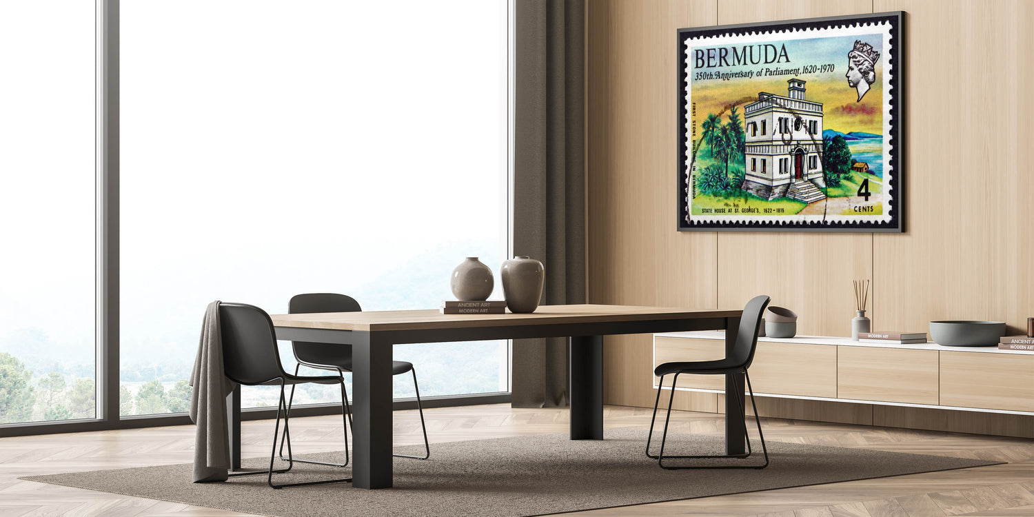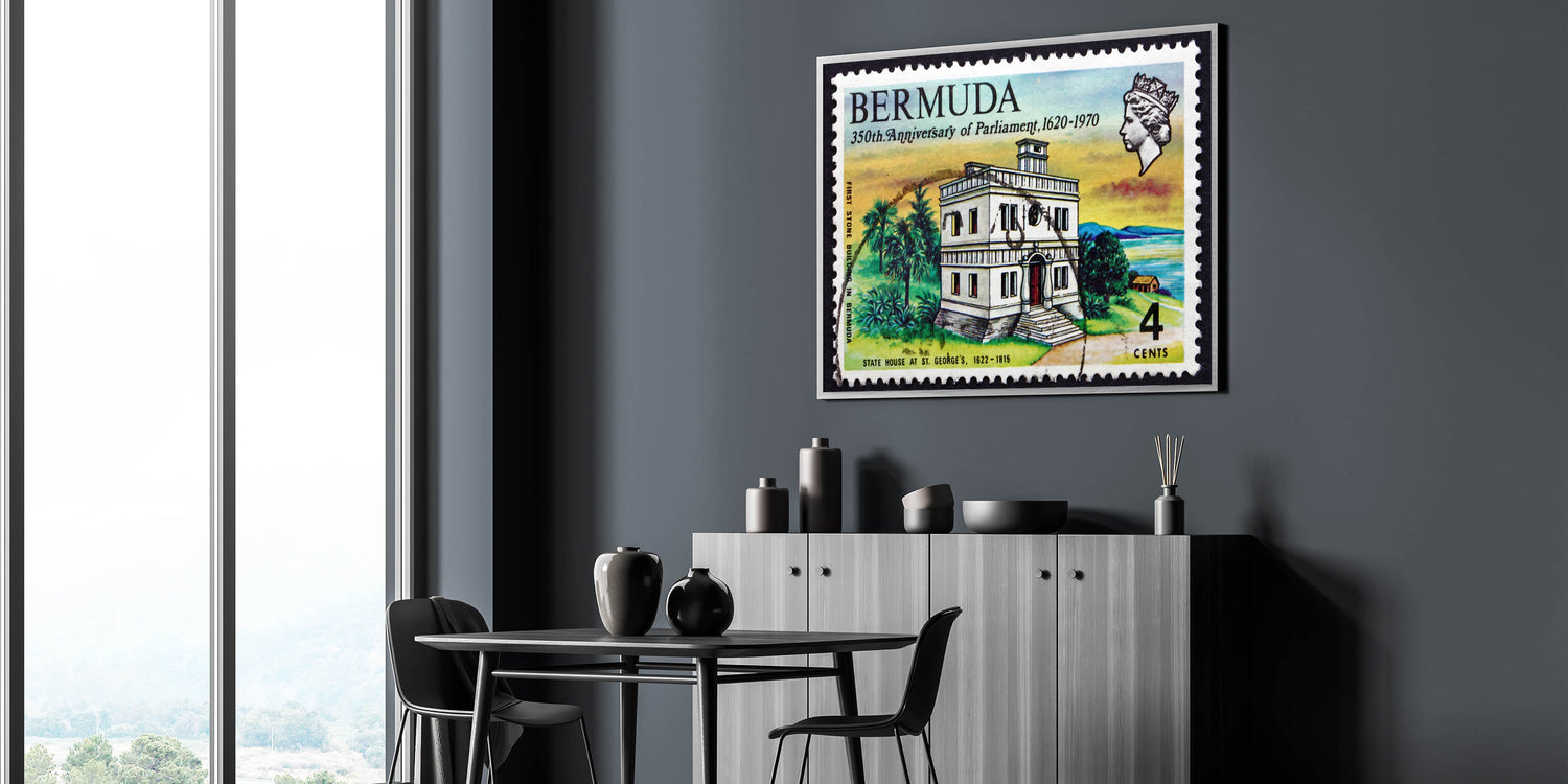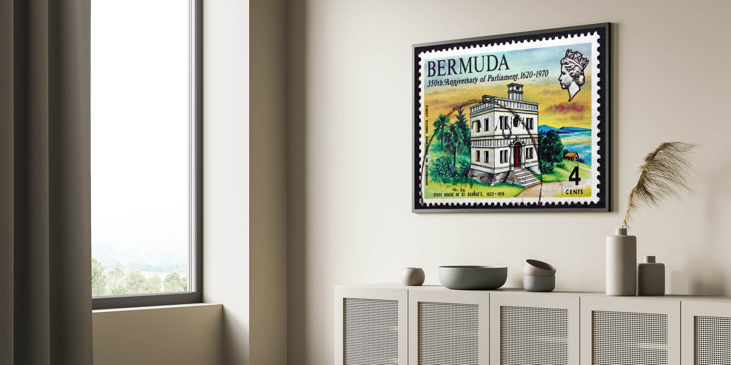 This captivating piece of Bermuda Beach Canvas art captures the essence of Bermuda’s rich history with a vintage stamp featuring the historic State House at St. George’s. Commemorating the 350th anniversary of Bermuda’s parliament, the stamp showcases the iconic first stone building set against a vibrant tropical island landscape. This artwork beautifully merges the charm of historic Bermuda with the serene beauty of Caribbean scenery.