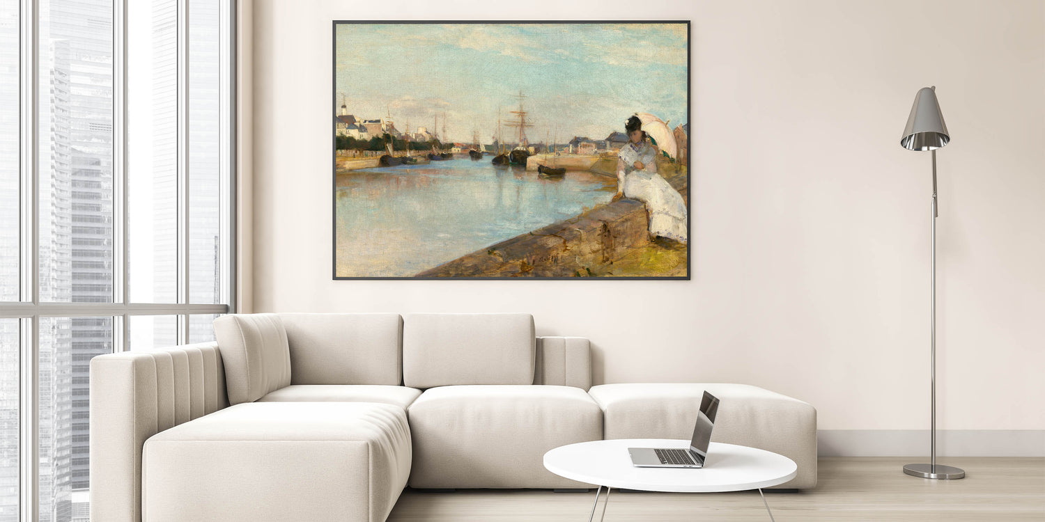 This stunning harbor scene by Berthe Morisot, one of the prominent figures of French Impressionism, portrays a peaceful moment by the water. The composition showcases a woman seated by the harbor, elegantly holding a parasol, with tall ships anchored in the background. The soft delicate brushstrokes and harmonious use of color reflect Morisot’s ability to capture everyday moments in 19th-century Parisian life, blending human figures with tranquil natural elements.