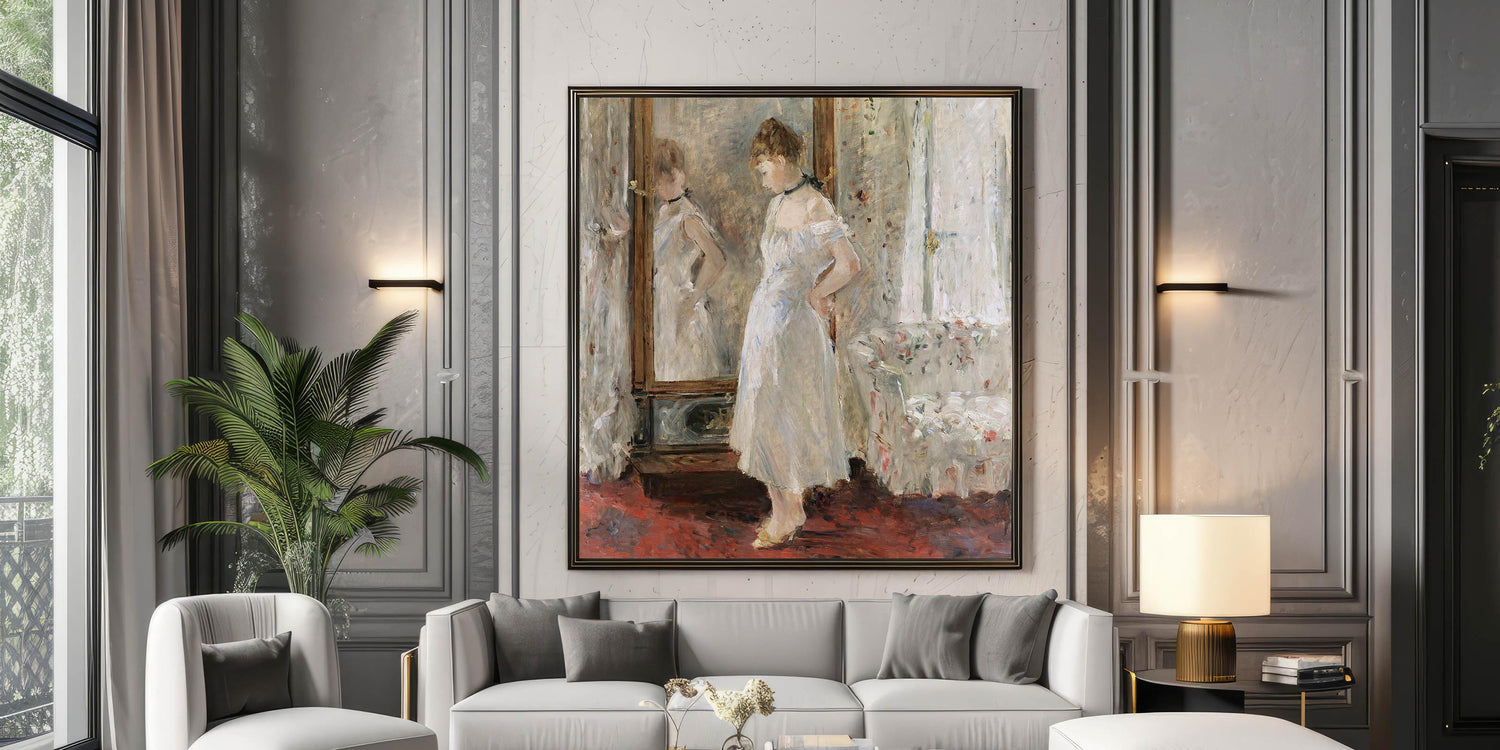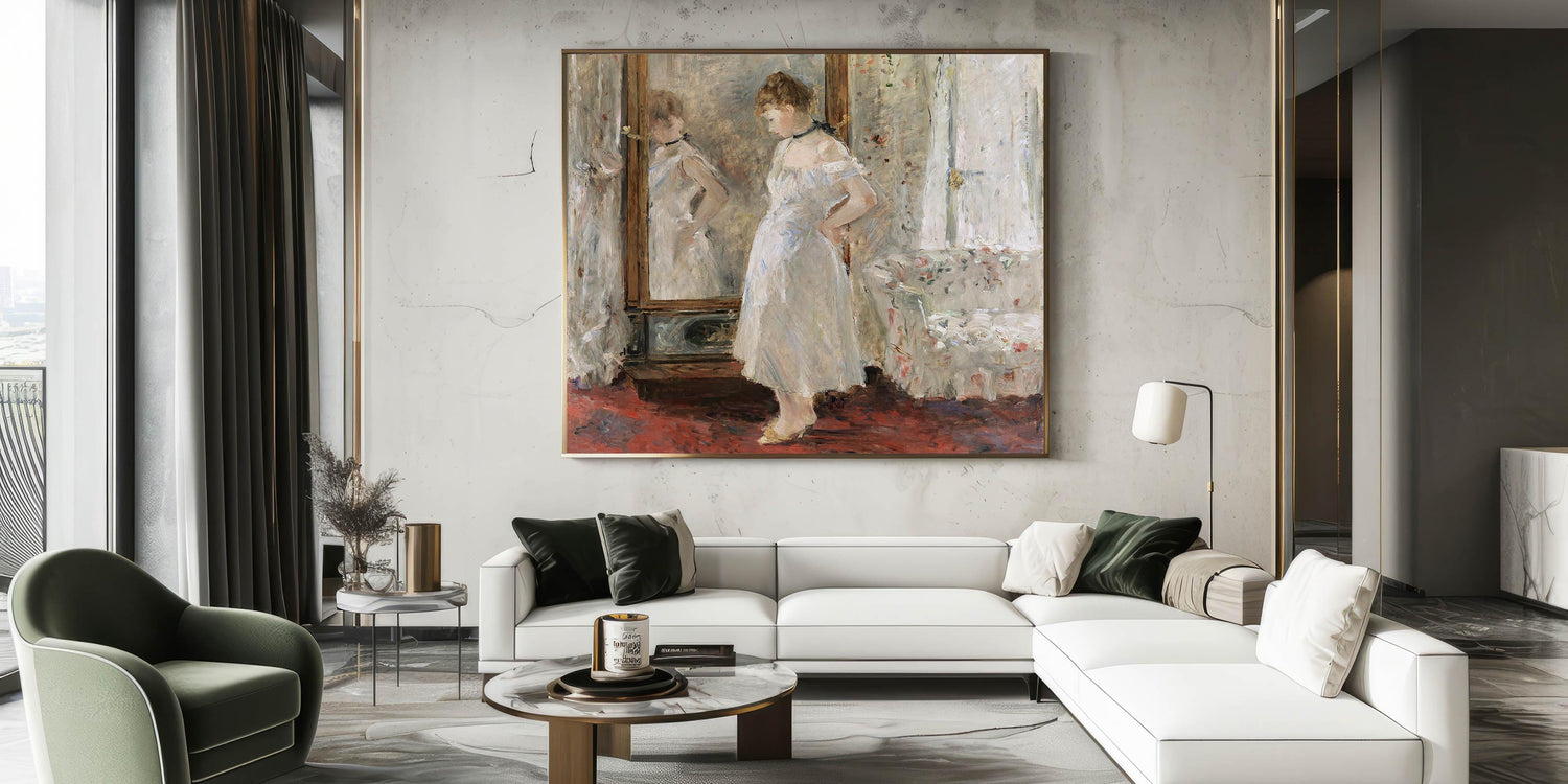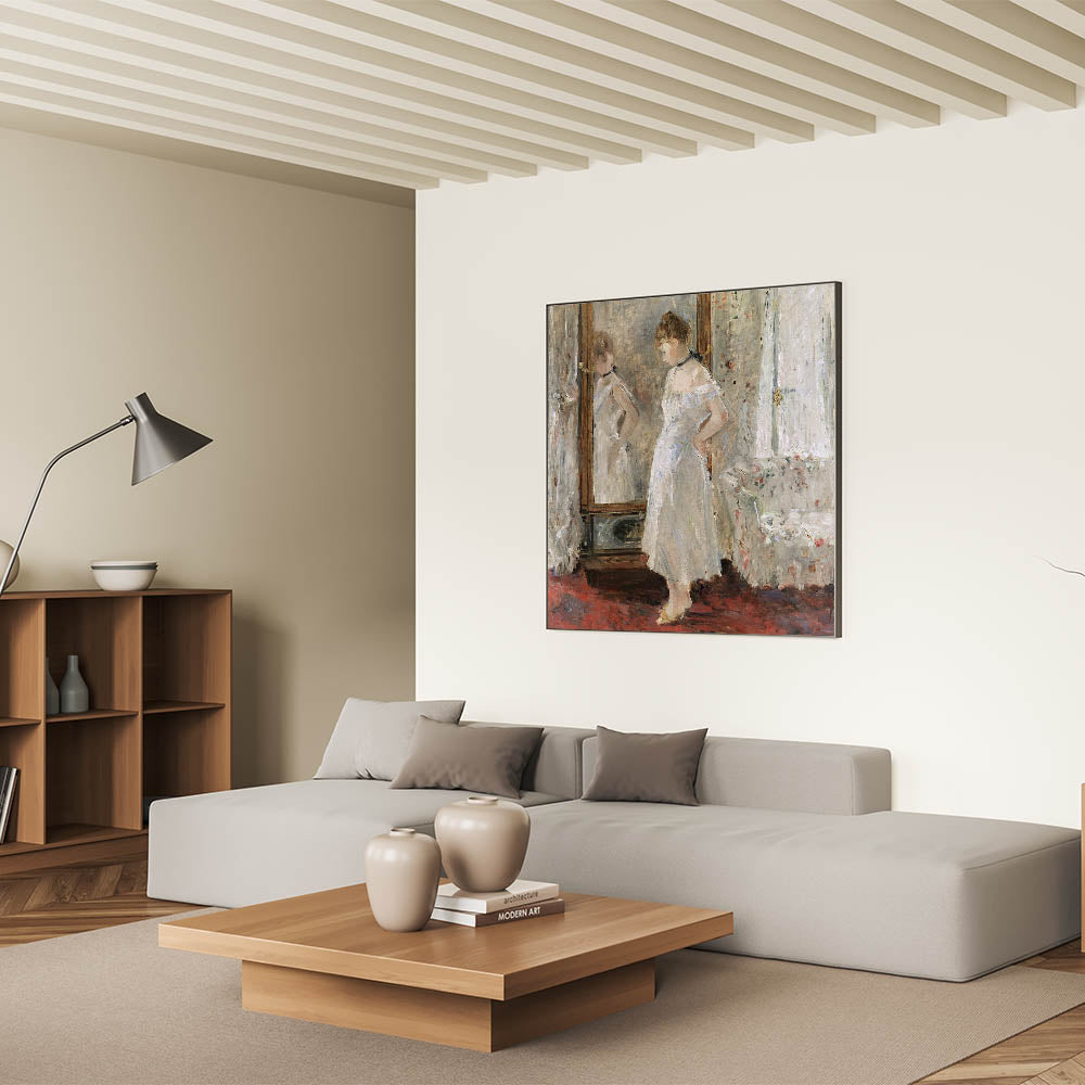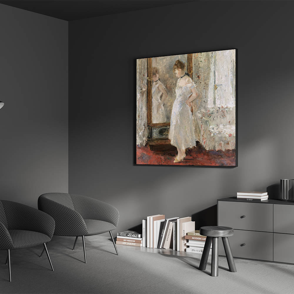 This exquisite painting by Berthe Morisot, one of the leading female figures of the Impressionist movement, captures a delicate and intimate moment of a woman standing in front of a mirror. The artist’s masterful use of light and reflection brings depth to the composition, while the soft brushstrokes and muted color palette create an atmosphere of quiet introspection. Morisot's ability to capture the grace and subtleties of everyday life is beautifully displayed in this artwork.