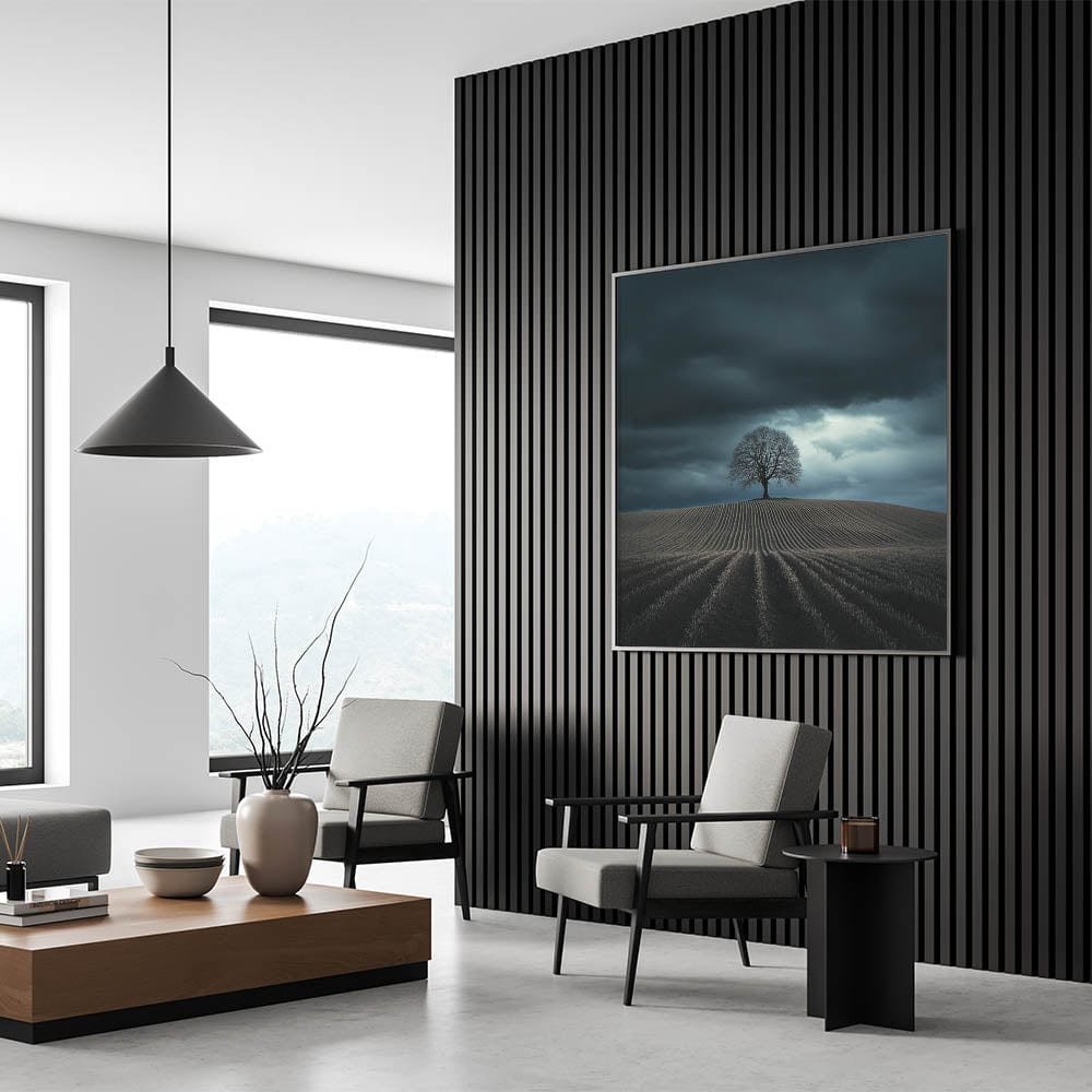 This Black and White Minimalist Landscape captures the power and solitude of nature with a lone tree standing against a stormy sky. The dramatic lighting and deep shadows create a Minimalist Scenic Art Print that evokes both mystery and serenity. The furrowed textures in the landscape contrast beautifully with the soft clouds above, making this a striking addition to any space.