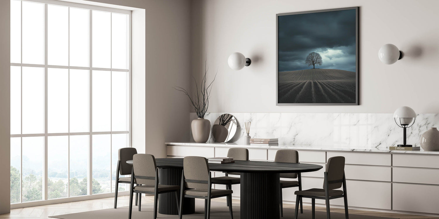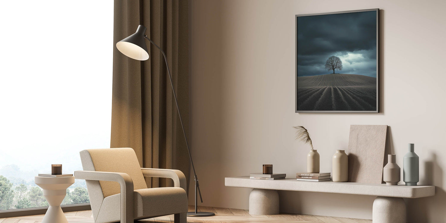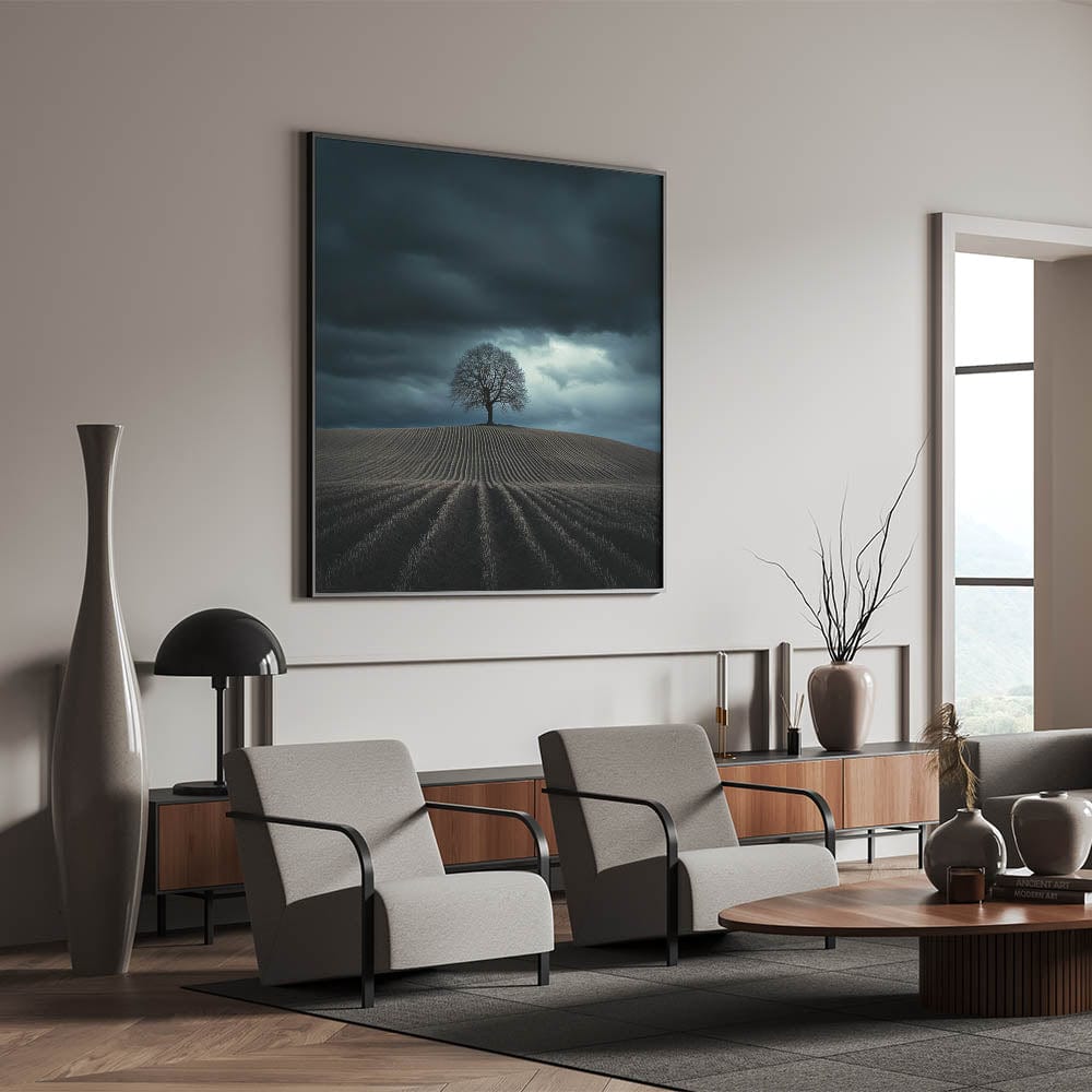 - Minimalist Wilderness Wall Art showcasing a solitary tree in a vast landscape