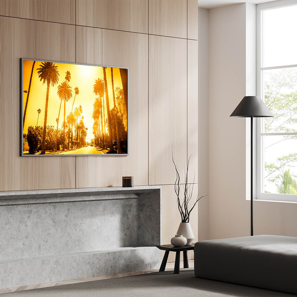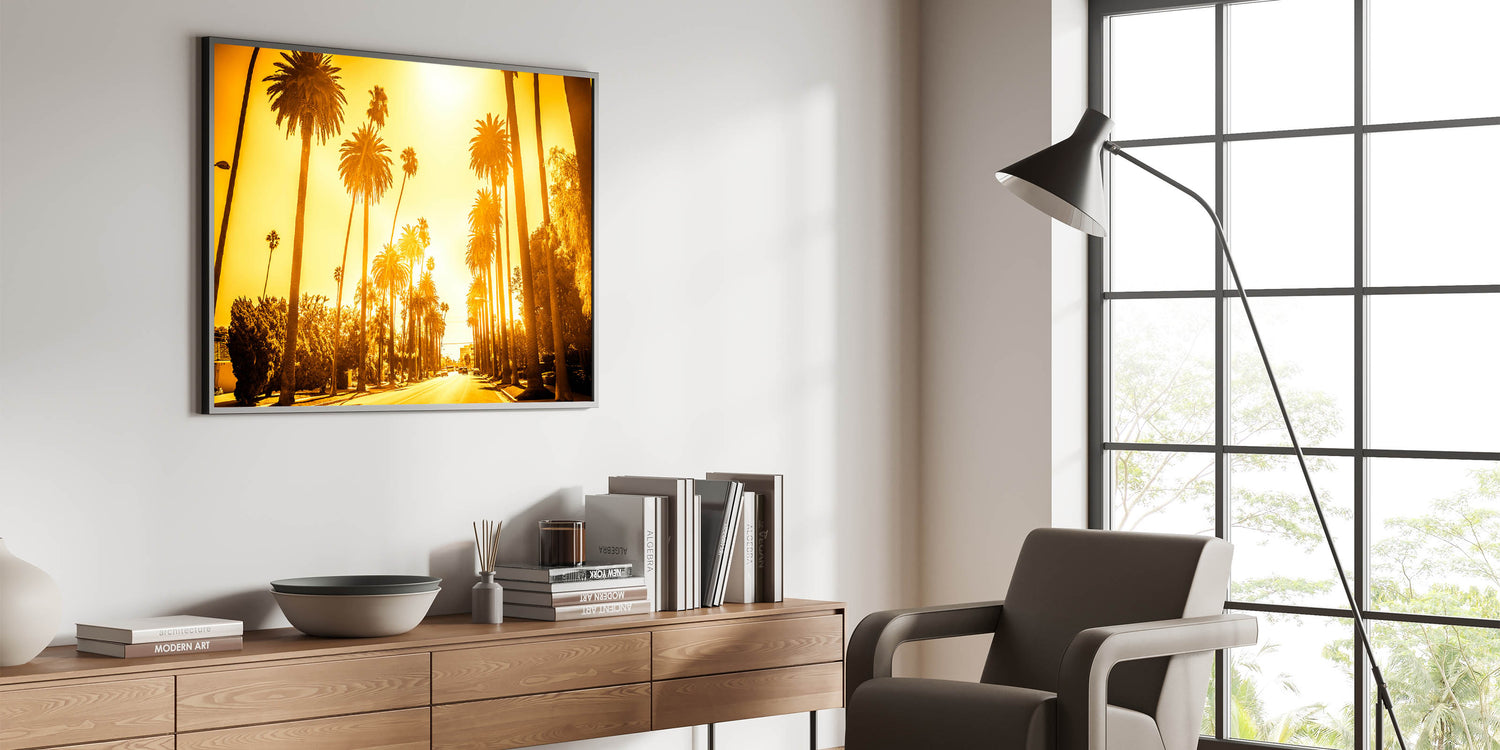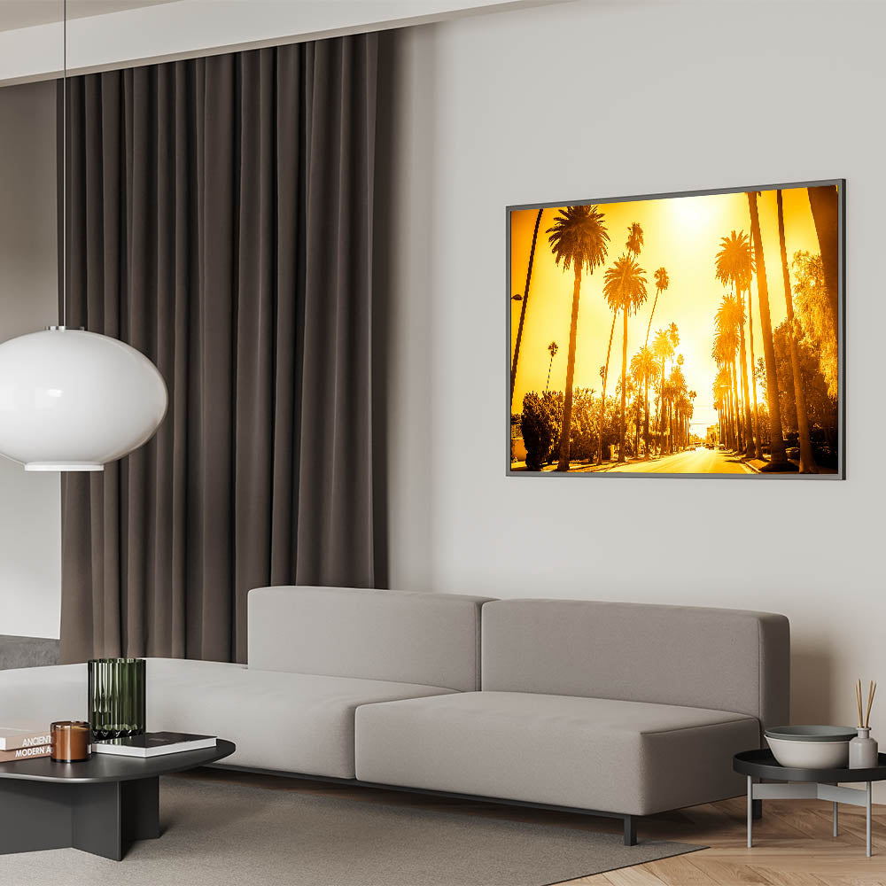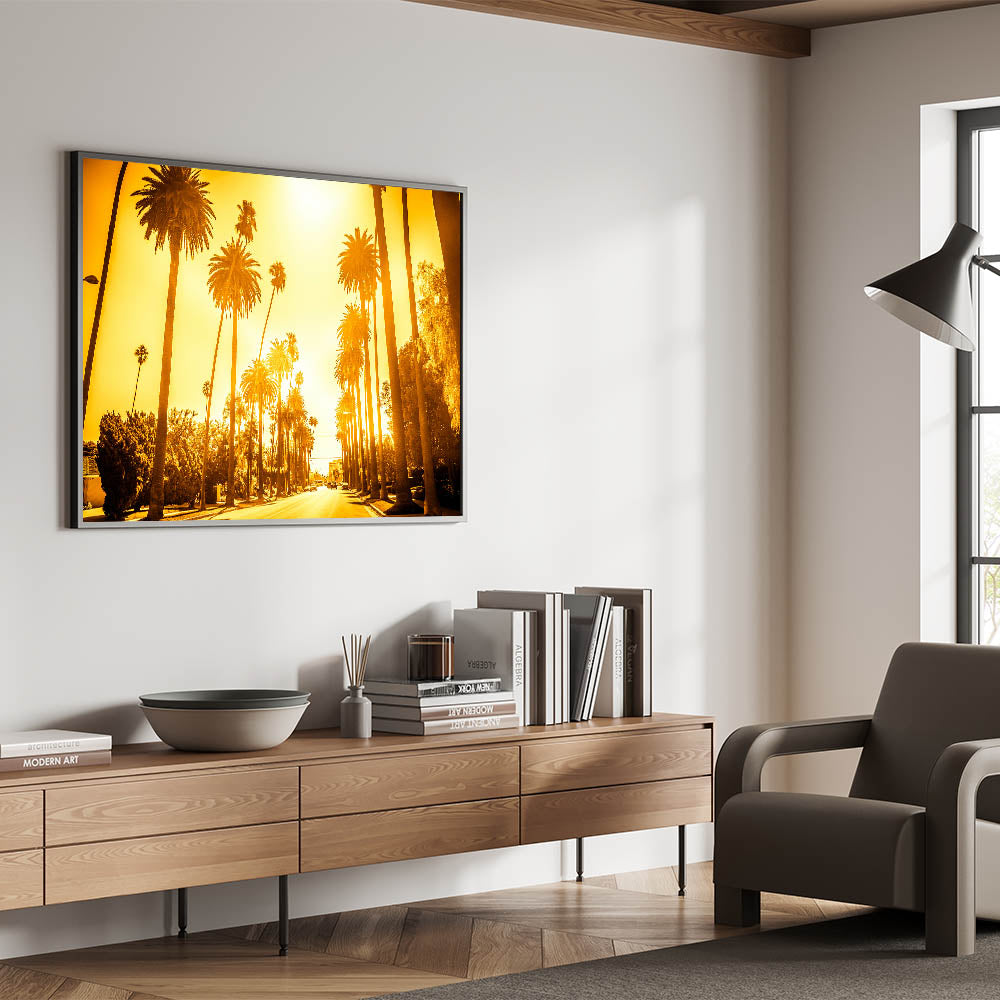 Immerse yourself in the golden charm of Beverly Hills with this vibrant wall art capturing the iconic palm tree-lined streets of California. The warm, golden tones evoke the beauty and elegance of the California luxury lifestyle. Perfect for those who want to bring the sunny, glamorous atmosphere of Beverly Hills into their home or office.
