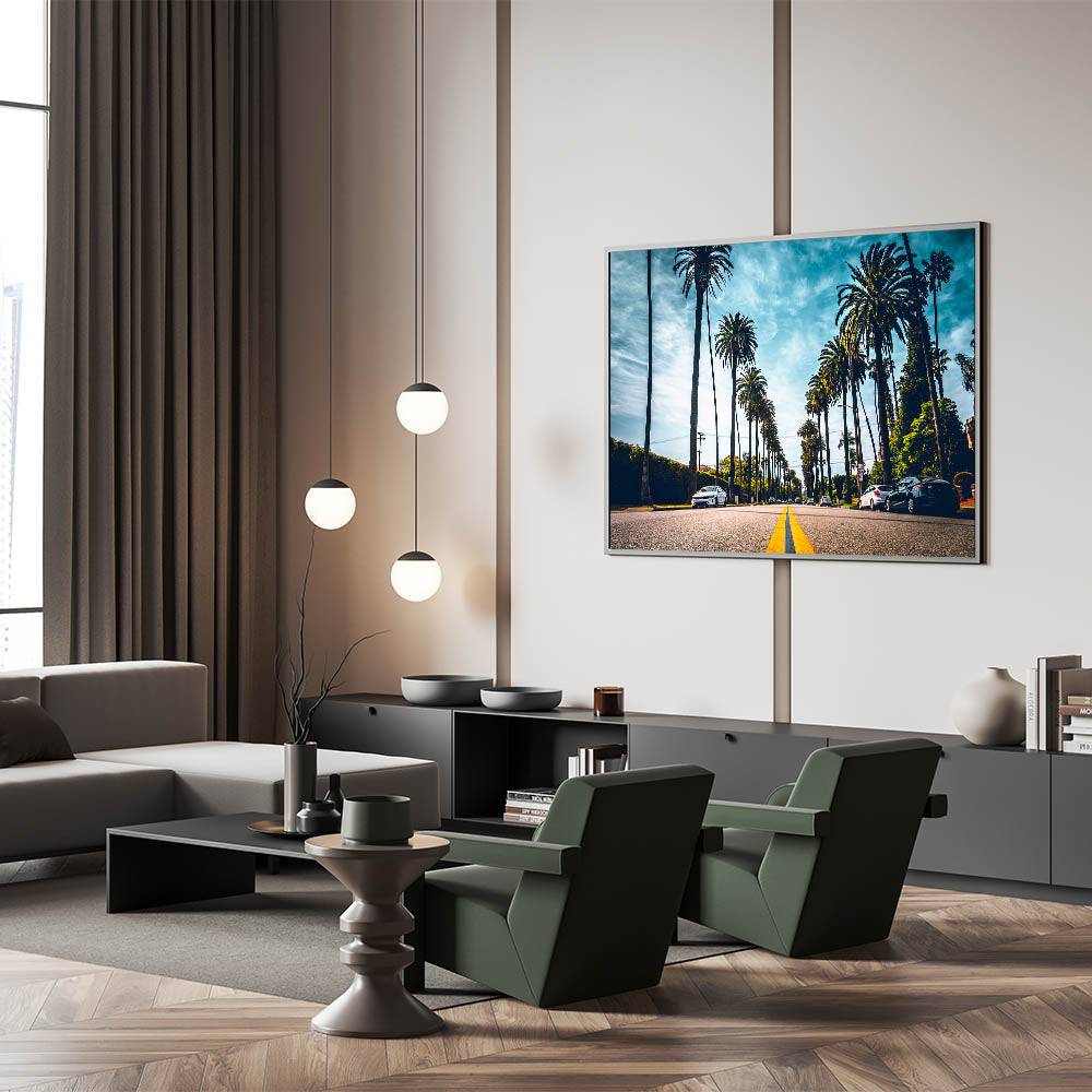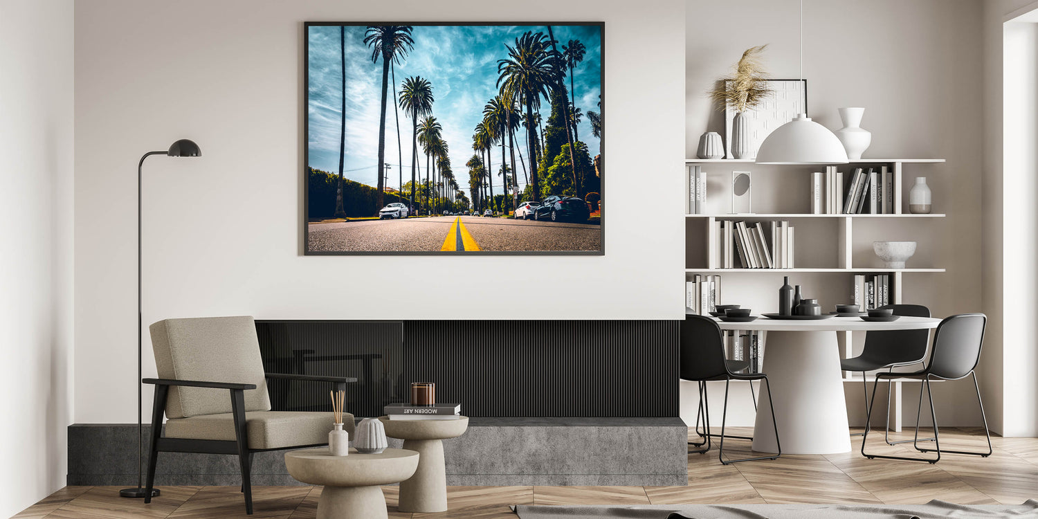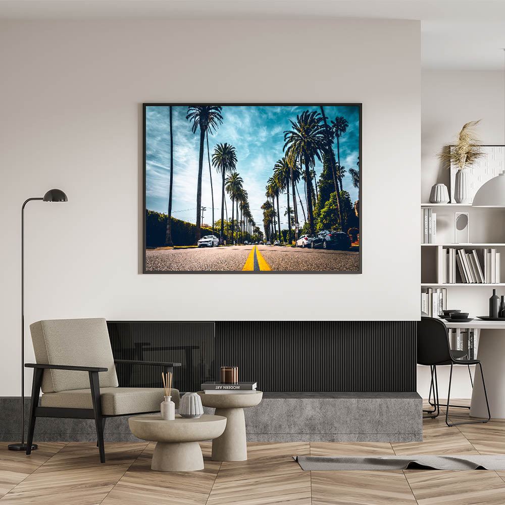 Step into the heart of Beverly Hills with this captivating wall art, featuring an iconic street lined with towering palm trees. The bright blue sky and the striking perspective create a sense of endless possibility, making this piece perfect for those who love the California luxury lifestyle. This artwork brings a fresh, modern touch to any space, capturing the spirit of Beverly Hills' famous streets.