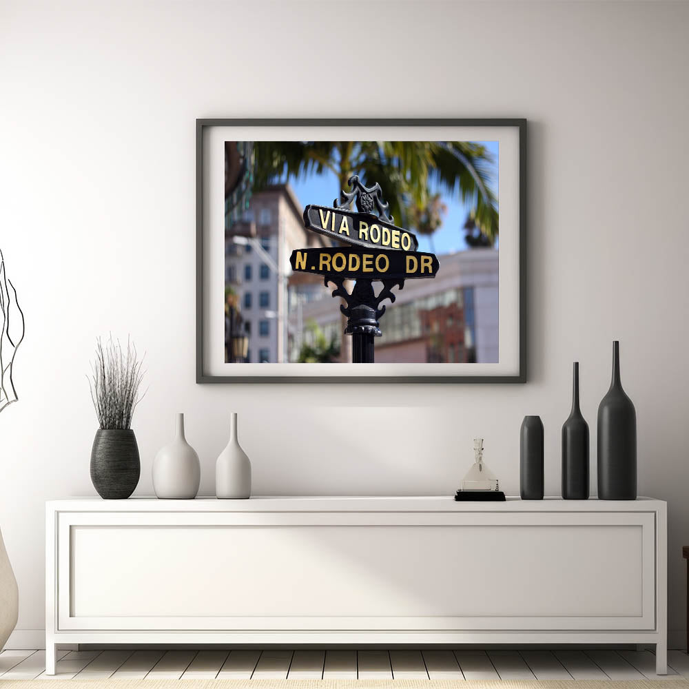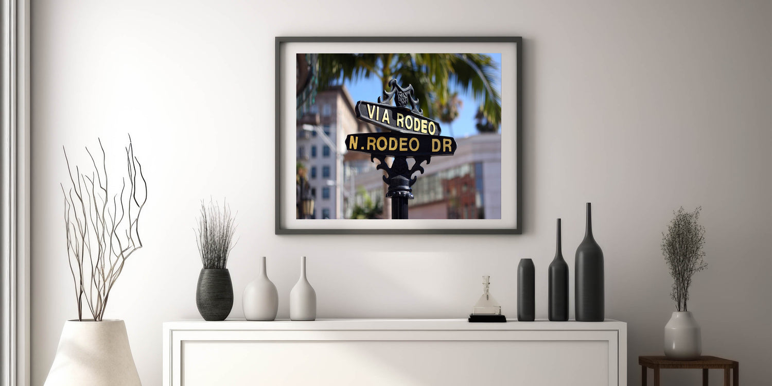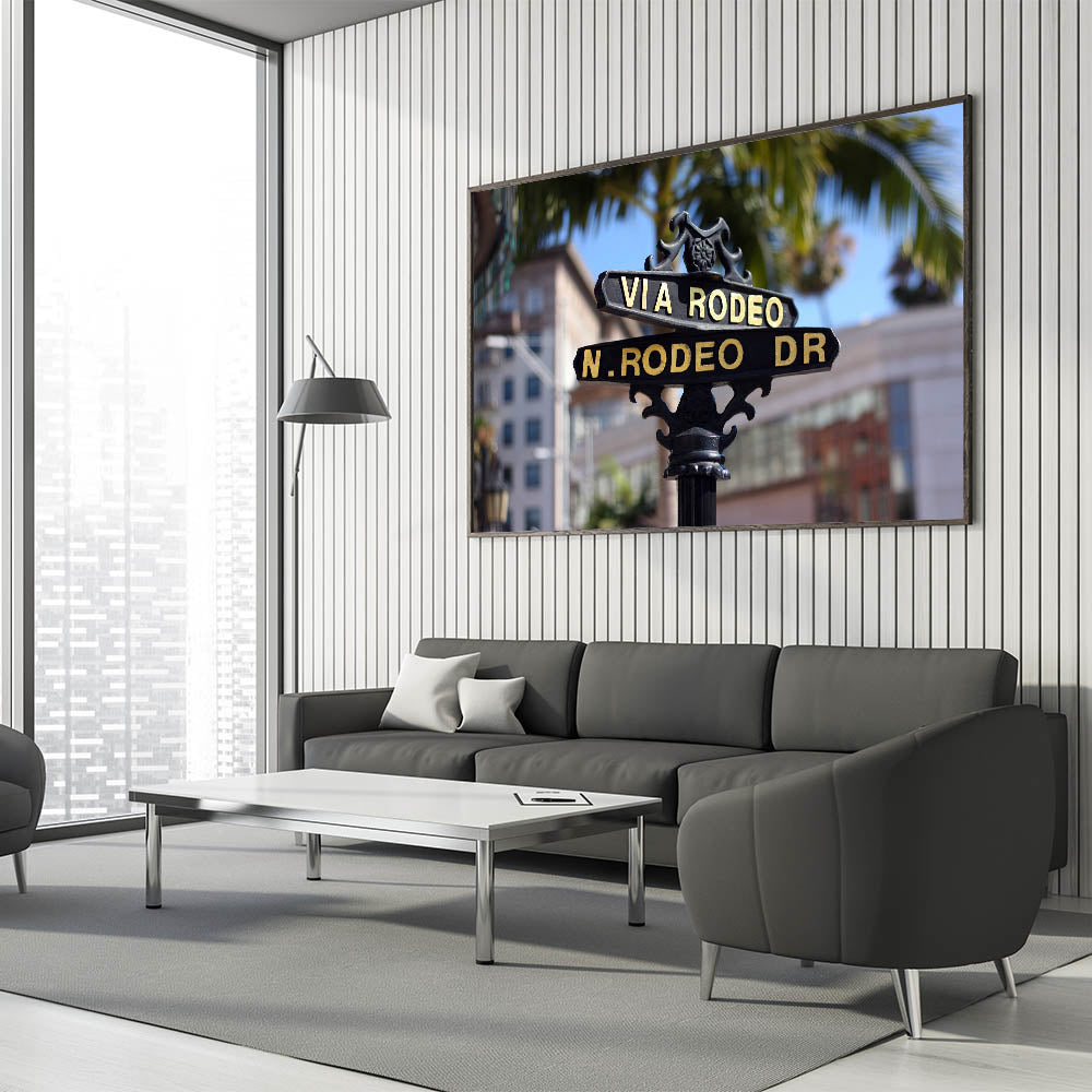 Capture the essence of California’s most iconic luxury destination with this stunning wall art featuring the famous Via Rodeo and N. Rodeo Dr. sign in Beverly Hills. This piece is perfect for anyone looking to add a touch of California luxury lifestyle art to their home or office.