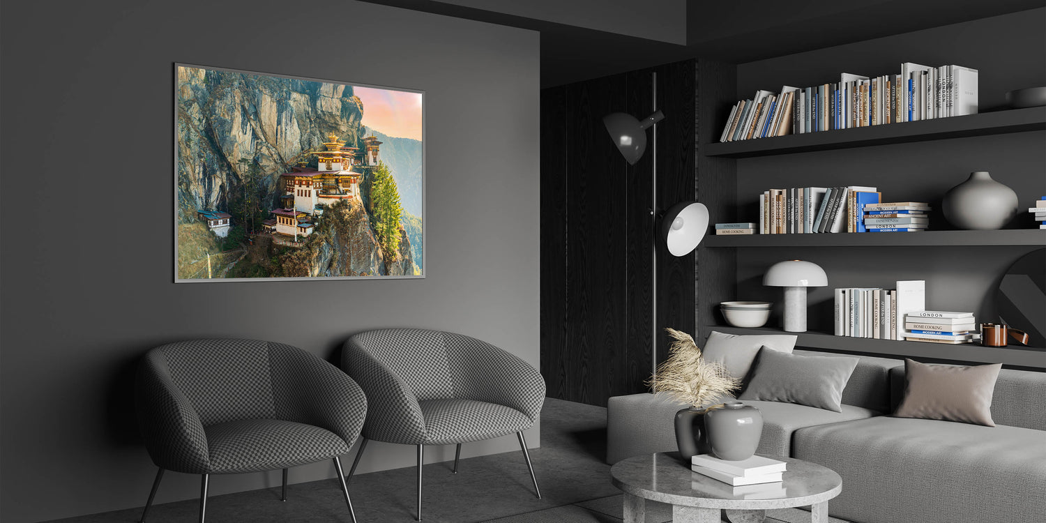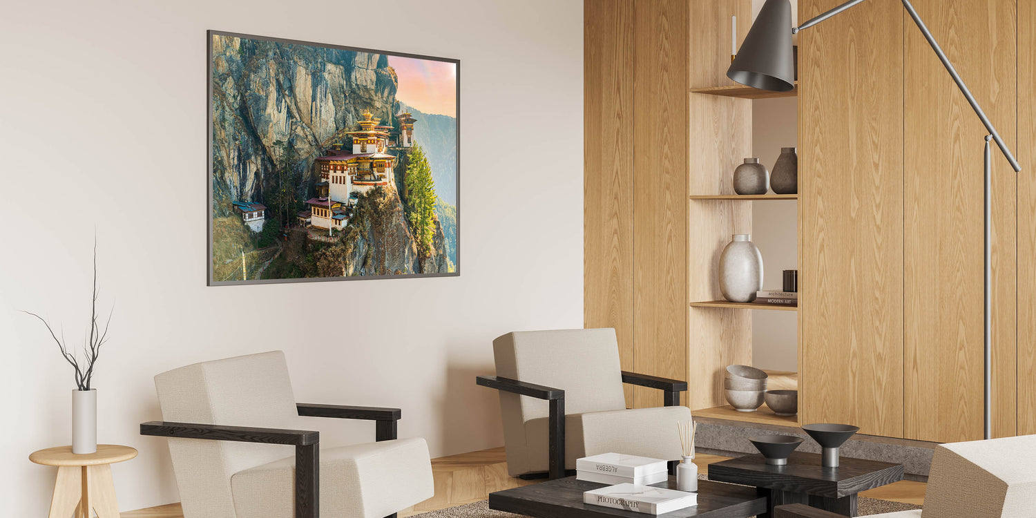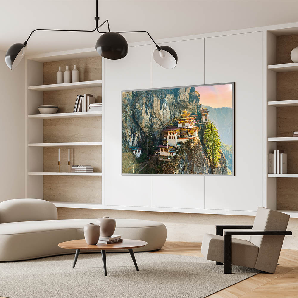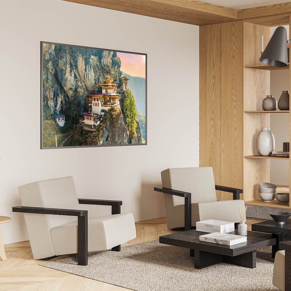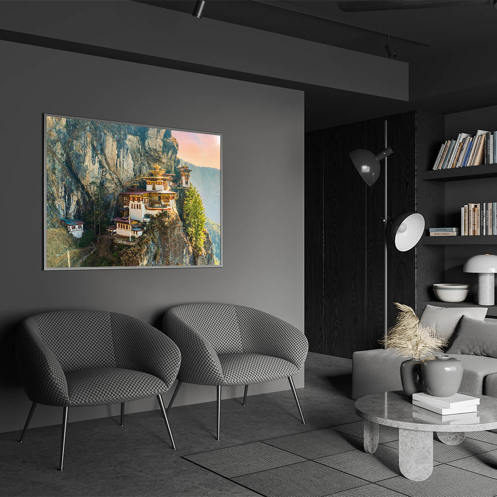 Experience the breathtaking beauty of Bhutan with this stunning wall art featuring the iconic Tiger's Nest Monastery perched high on a cliffside. This Bhutan wall art captures the serene majesty of the monastery against a backdrop of rugged mountains and tranquil skies, making it a perfect addition to any space that seeks to inspire a sense of peace and wonder.