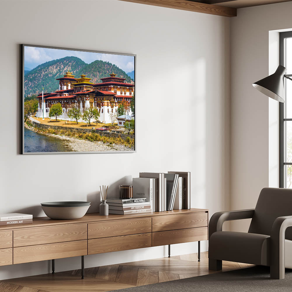 Immerse yourself in the architectural splendor of Bhutan with this exquisite wall art featuring Punakha Dzong, one of Bhutan's most iconic and historically significant fortresses. Nestled between the confluence of two rivers and surrounded by lush mountains, this Dzong is a masterpiece of Bhutanese architecture and a symbol of the country’s rich cultural heritage. The vibrant colors and intricate details make this artwork a stunning focal point for any room.