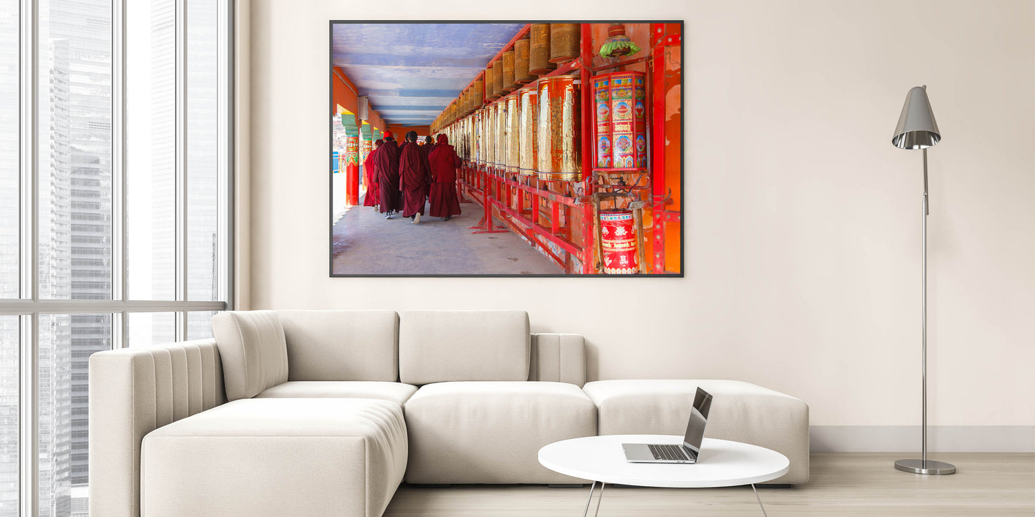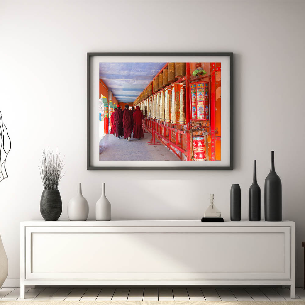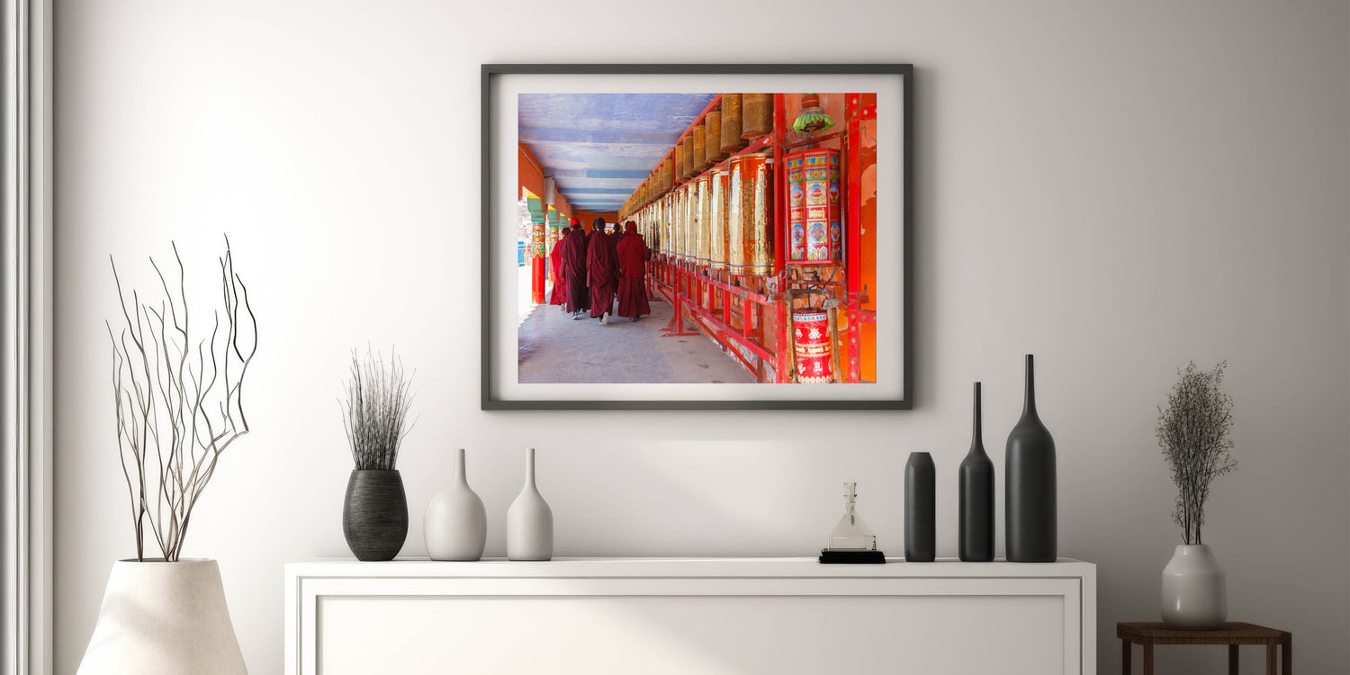 Step into the heart of Bhutan’s spiritual and cultural life with this vivid wall art featuring a group of monks walking along a corridor lined with colorful prayer wheels in a Bhutanese monastery. The rich colors and intricate details capture the essence of Bhutanese traditions, making this piece a perfect addition for anyone looking to bring a touch of the Himalayas into their home or office.