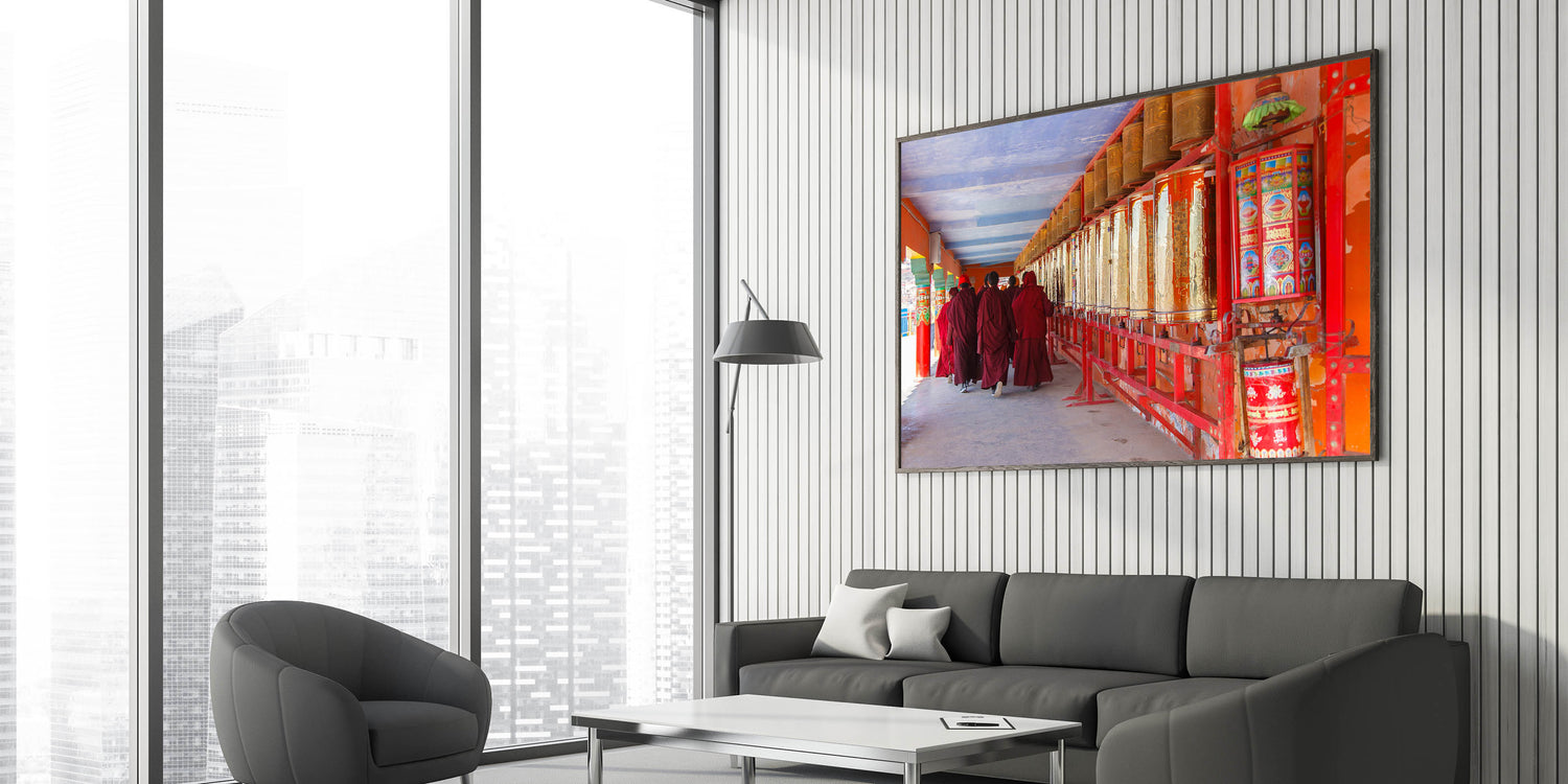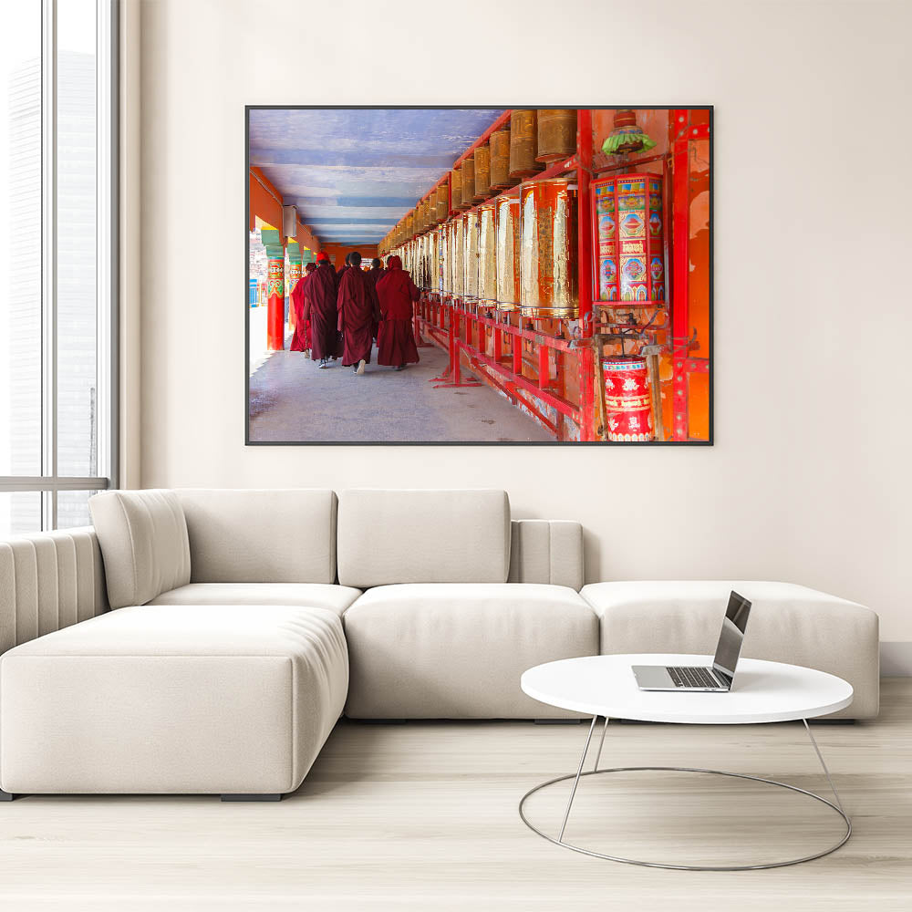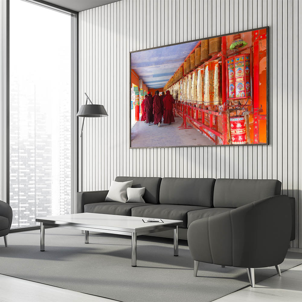 Step into the heart of Bhutan’s spiritual and cultural life with this vivid wall art featuring a group of monks walking along a corridor lined with colorful prayer wheels in a Bhutanese monastery. The rich colors and intricate details capture the essence of Bhutanese traditions, making this piece a perfect addition for anyone looking to bring a touch of the Himalayas into their home or office.