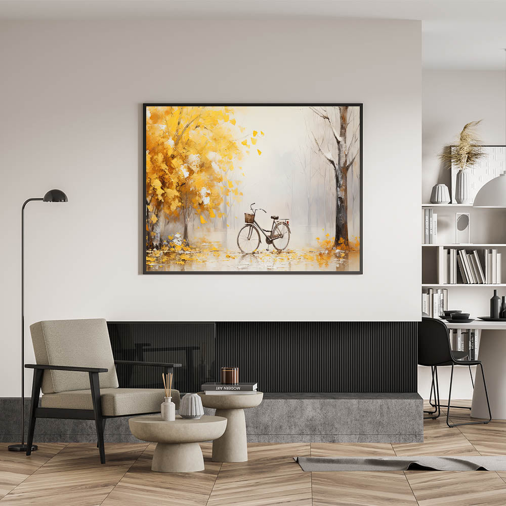 Immerse yourself in the beauty of autumn with this serene bicycle wall art. Featuring a lone bicycle amidst a landscape of falling golden leaves, this artwork captures the peacefulness of a crisp autumn day. The warm yellow hues of the leaves contrast beautifully with the soft, muted tones of the background, making this piece a perfect addition to any room that embraces the changing seasons.