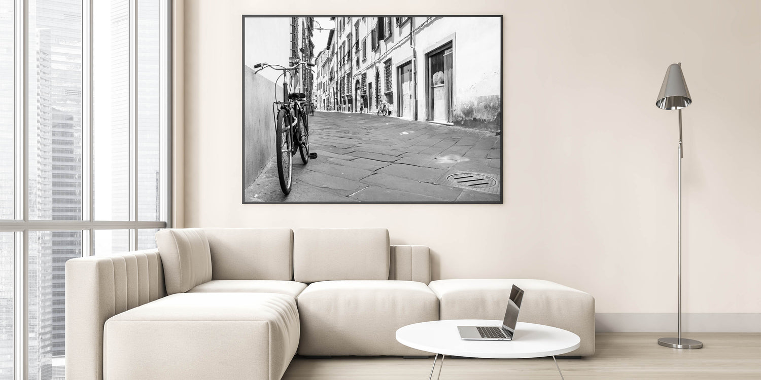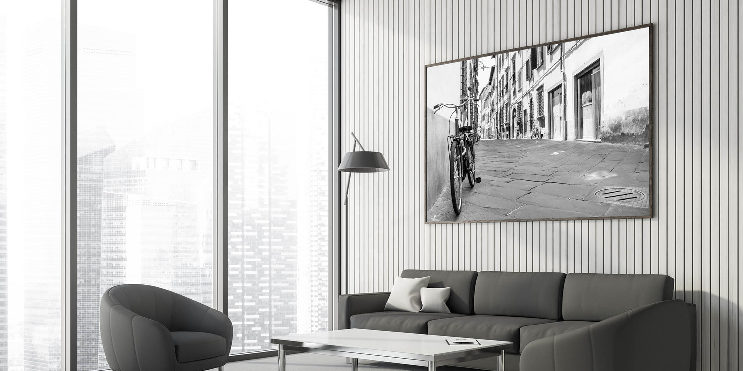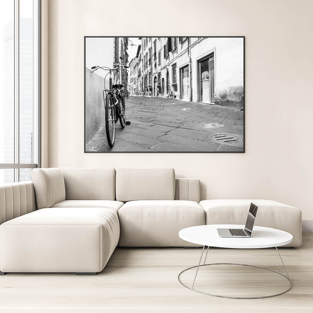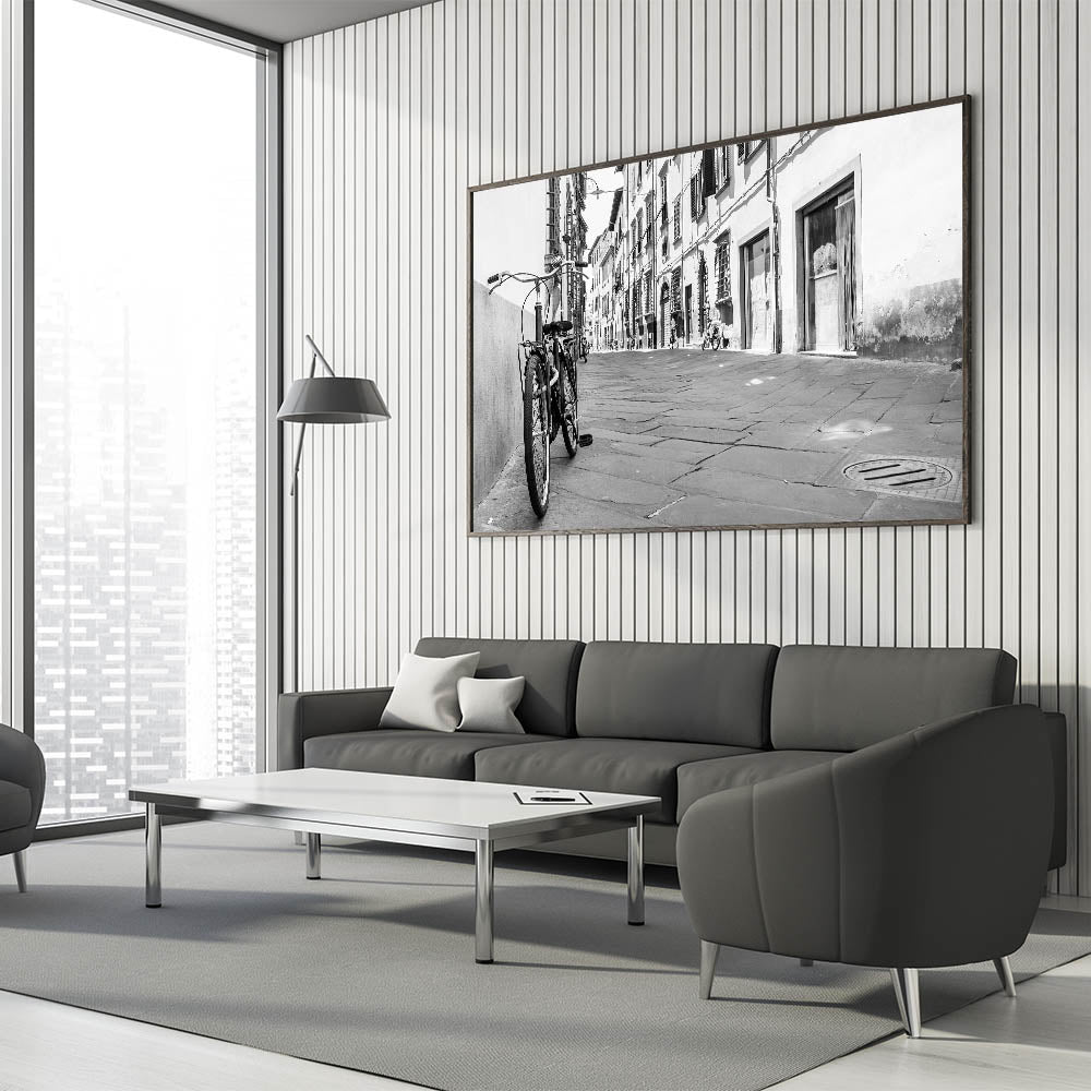 Elevate your interior design with this striking black and white bicycle wall art, featuring a classic bicycle parked against a city street backdrop. The monochrome palette and urban setting make this piece a perfect addition to modern and minimalist decor styles. The photograph captures the quiet charm of a timeless moment in an urban landscape, adding a touch of elegance to any room.