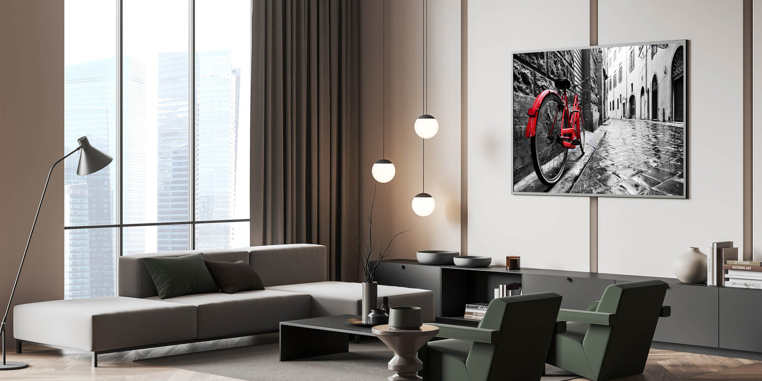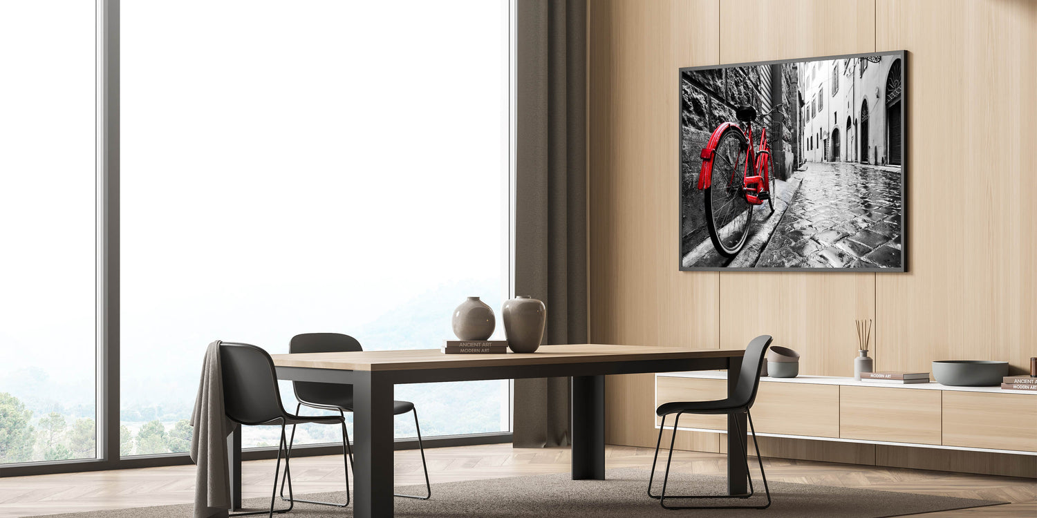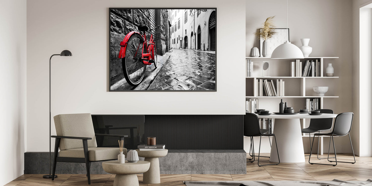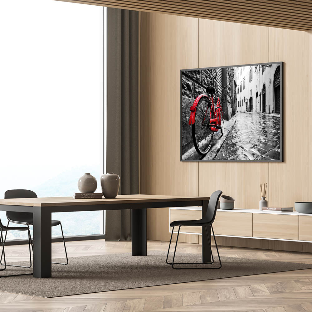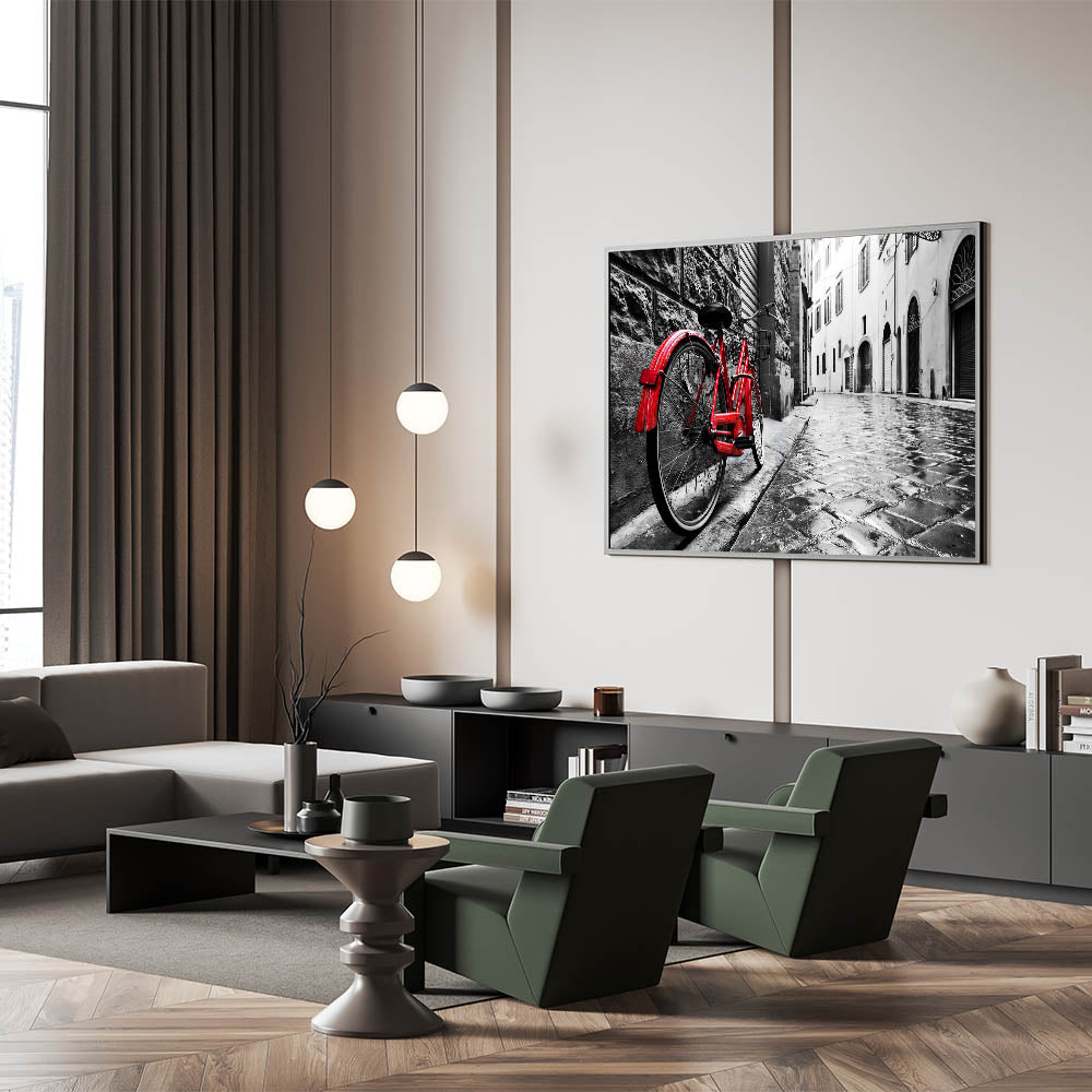 Add a bold statement to your decor with this striking red bicycle wall art. Featuring a vibrant red bicycle against a wet cobblestone street in a black-and-white urban setting, this piece exudes drama and style. The contrasting colors highlight the bicycle, making it the focal point of the scene, perfect for modern and eclectic decor styles.