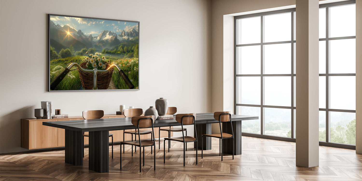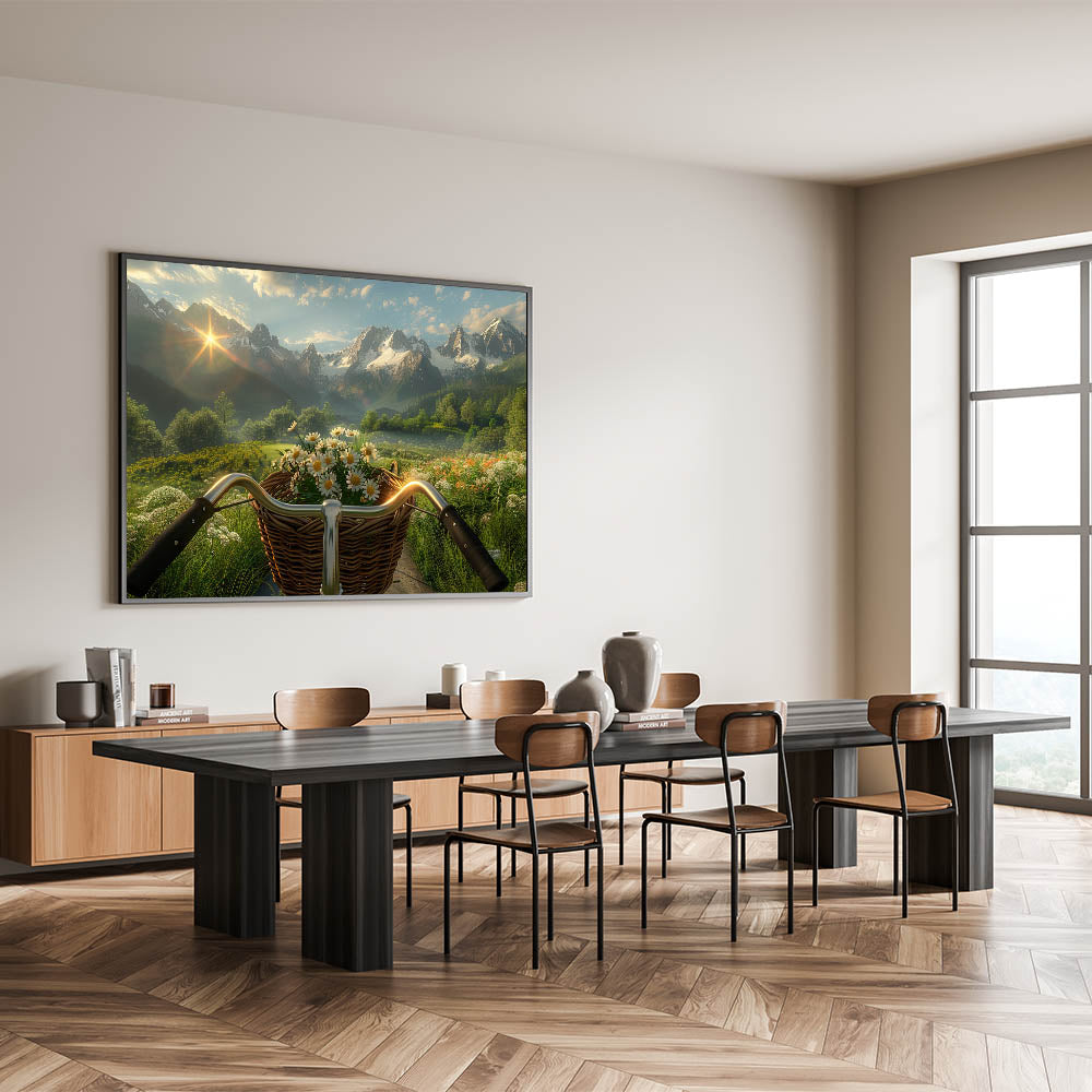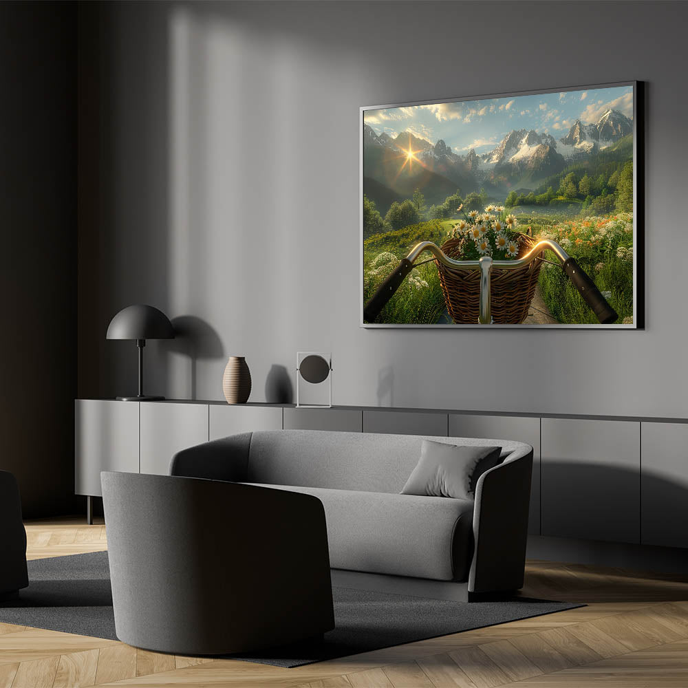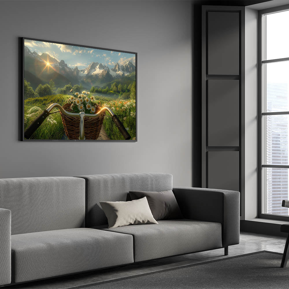 Immerse yourself in the serene beauty of nature with this sunrise mountain bicycle wall art. This breathtaking piece captures the view from a bicycle as it cruises through a lush, flower-filled meadow with majestic mountains in the background. The golden sunlight breaking through the peaks adds a warm, inviting glow, creating a sense of peace and adventure. This cycling-themed art is perfect for those who love the outdoors and seek to bring a touch of natural beauty into their living spaces.