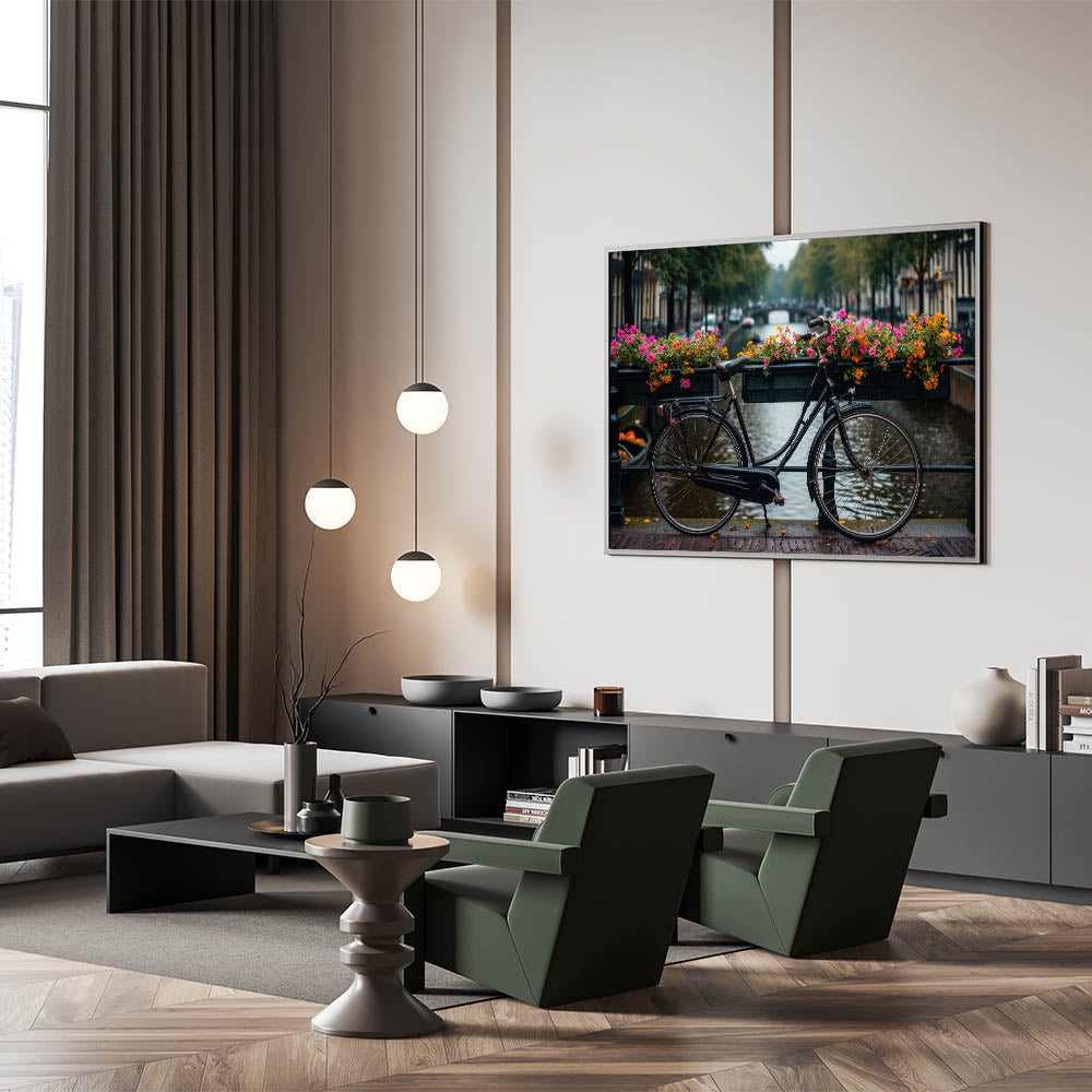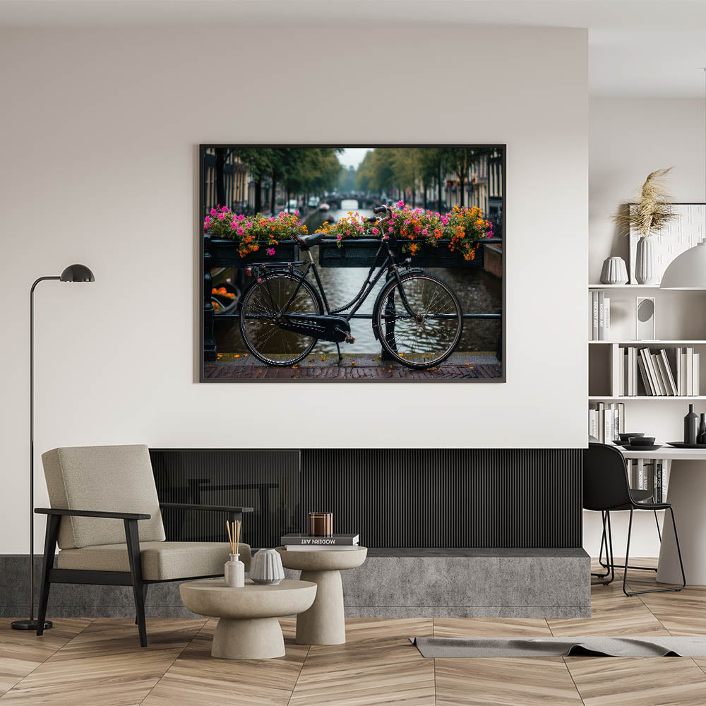 Capture the charm of a serene urban scene with this vintage bicycle wall art featuring a classic bicycle parked against a picturesque canal bridge adorned with vibrant flowers. This bicycle art collection piece blends the beauty of nature with urban life, making it an ideal choice for those who appreciate both the outdoors and the bustling energy of city landscapes. The vivid colors of the flowers contrast beautifully with the sleek lines of the bicycle, creating a visually captivating composition.