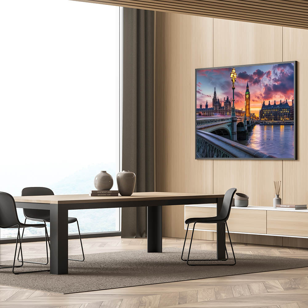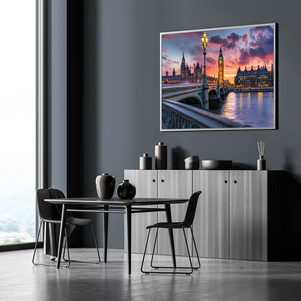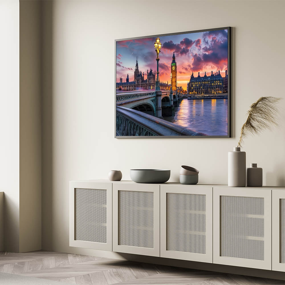 This vibrant Big Ben wall art captures the iconic Westminster Clock Tower as it glows beautifully under a magnificent sunset sky. With Westminster Bridge in the foreground and colorful clouds reflecting in the Thames, this artwork brings the magic of London’s evening charm into your home. Perfect for anyone who loves London landmarks, this piece adds a touch of elegance and drama to any space.