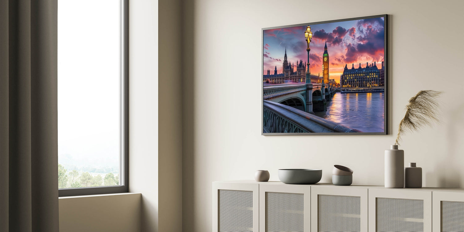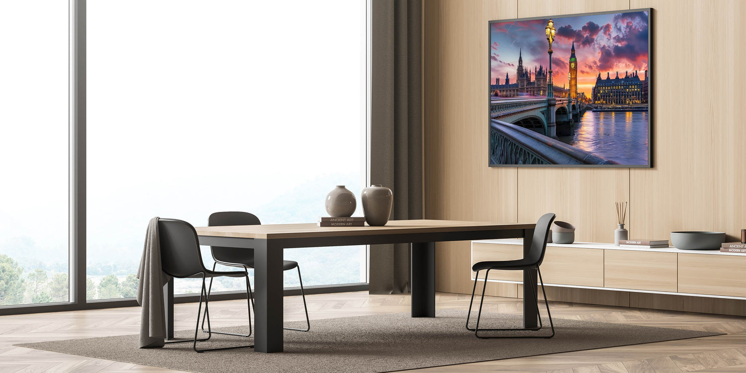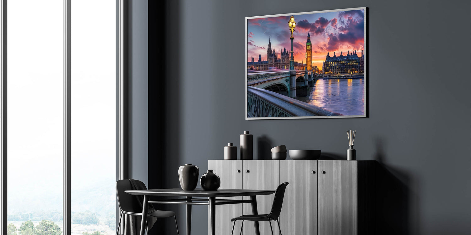 This vibrant Big Ben wall art captures the iconic Westminster Clock Tower as it glows beautifully under a magnificent sunset sky. With Westminster Bridge in the foreground and colorful clouds reflecting in the Thames, this artwork brings the magic of London’s evening charm into your home. Perfect for anyone who loves London landmarks, this piece adds a touch of elegance and drama to any space.