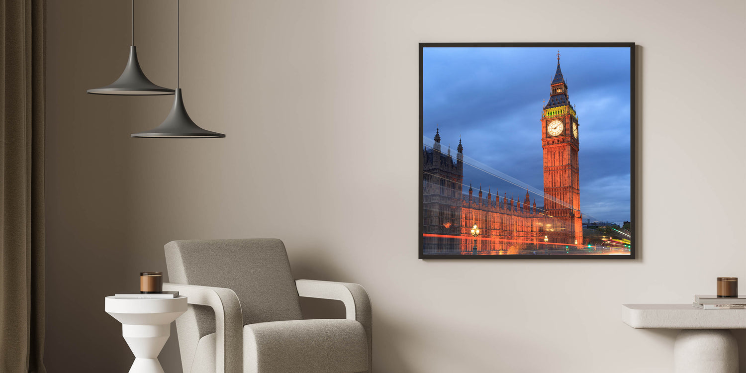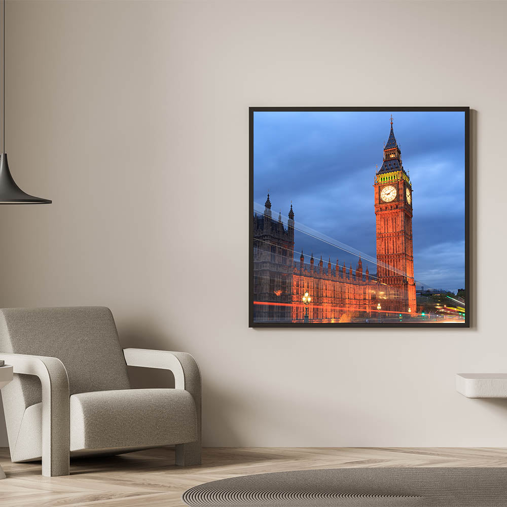Bring the charm of London’s most iconic landmark into your home with this stunning Big Ben wall art. This beautiful image captures the Westminster Clock Tower illuminated with warm evening lights, set against a moody blue sky. The light trails from passing vehicles add a dynamic element to the image, perfectly balancing the timeless architecture of Big Ben with the modern pace of the city.