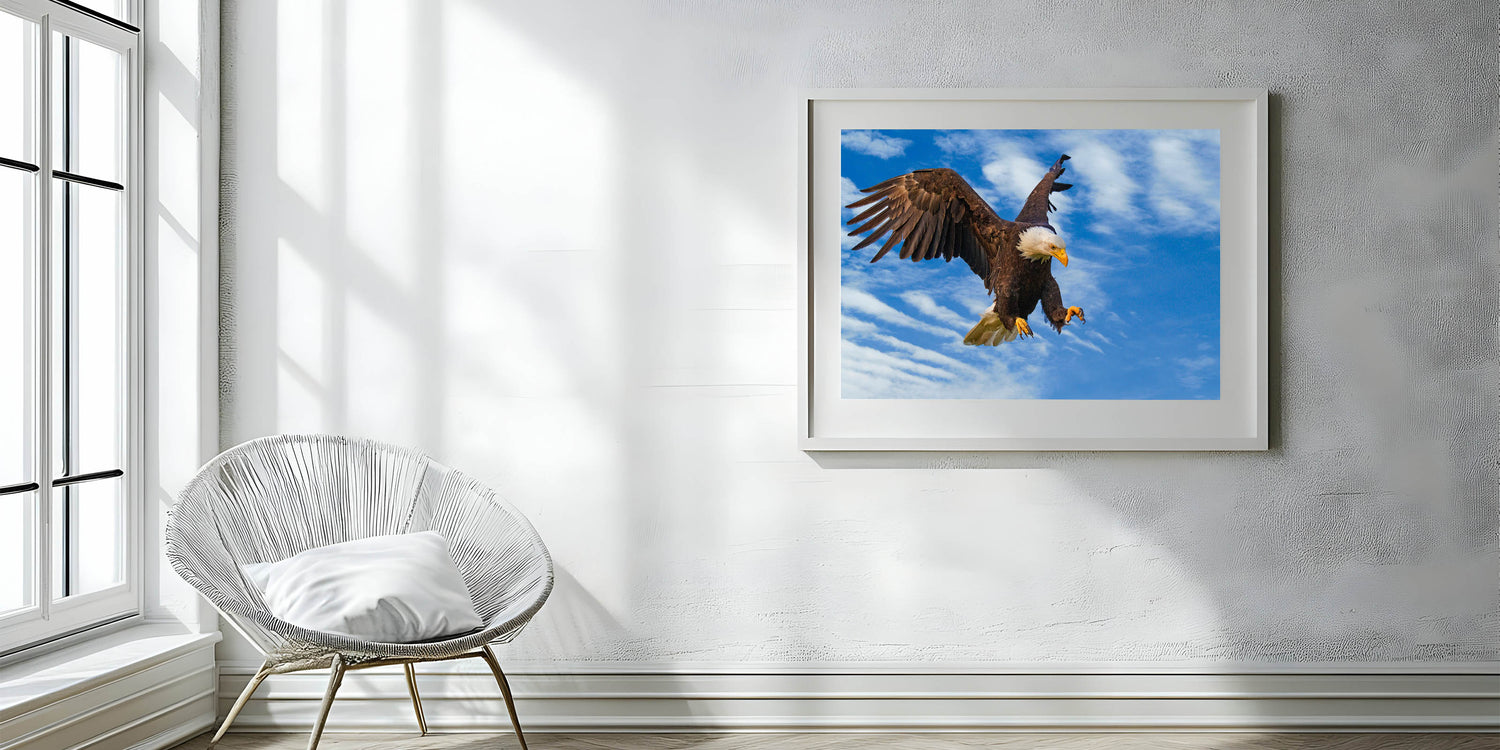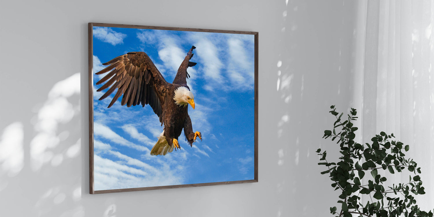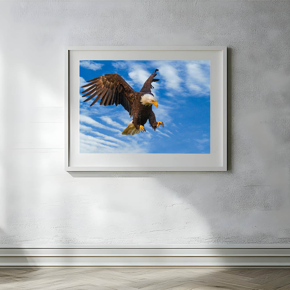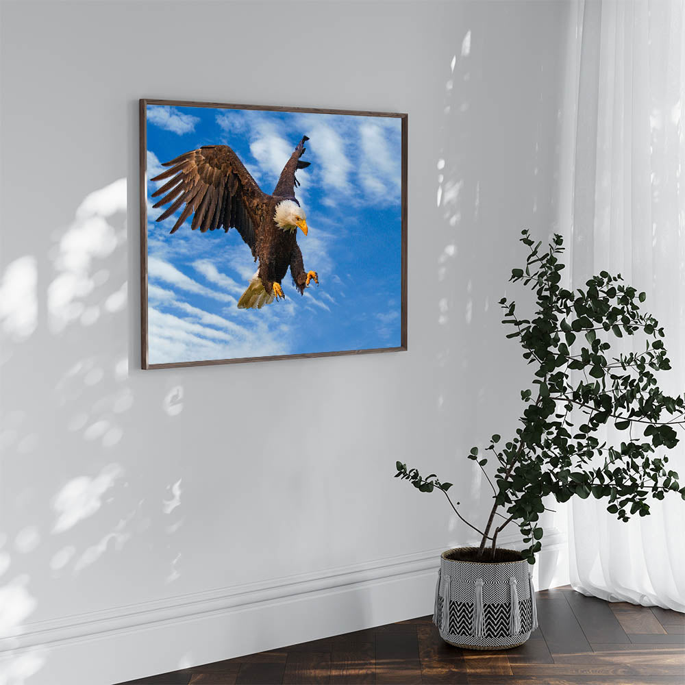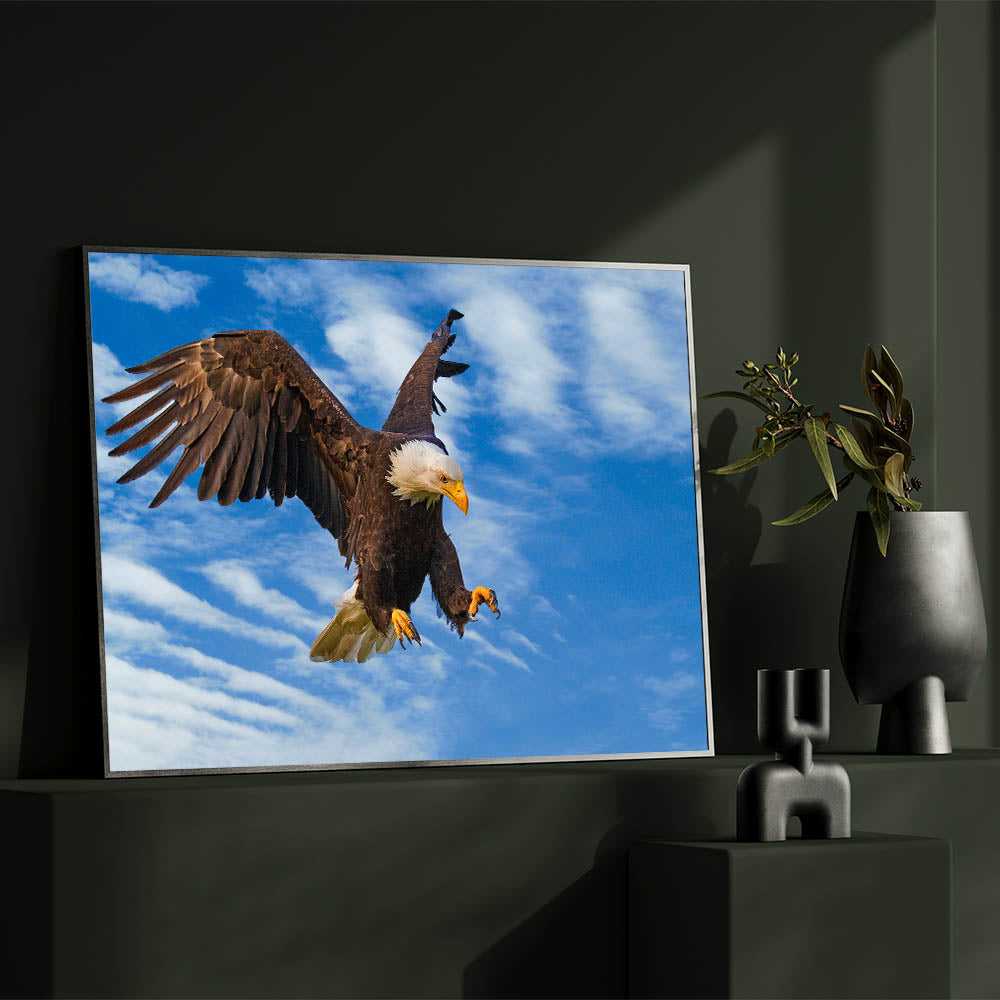 Elevate your decor with this powerful "Dynamic Bald Eagle Wall Art," featuring a breathtaking image of a bald eagle descending with precision and grace. Captured against a vivid blue sky, this artwork embodies the raw power and agility of one of nature’s most revered predators. The detailed feathers, intense gaze, and strong talons create a sense of movement and energy that will command attention in any room.