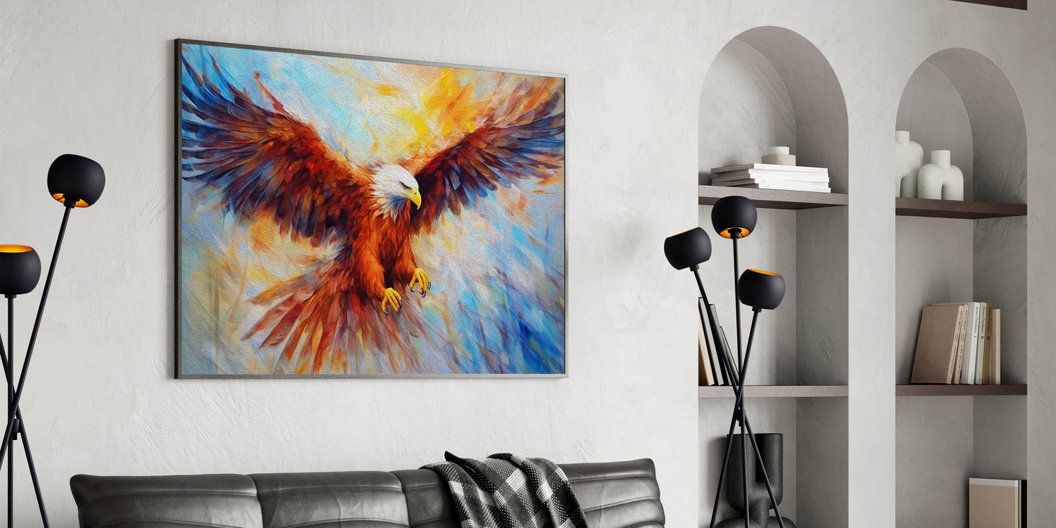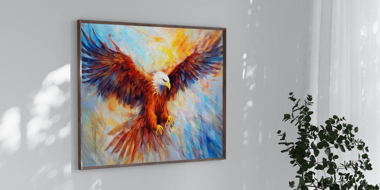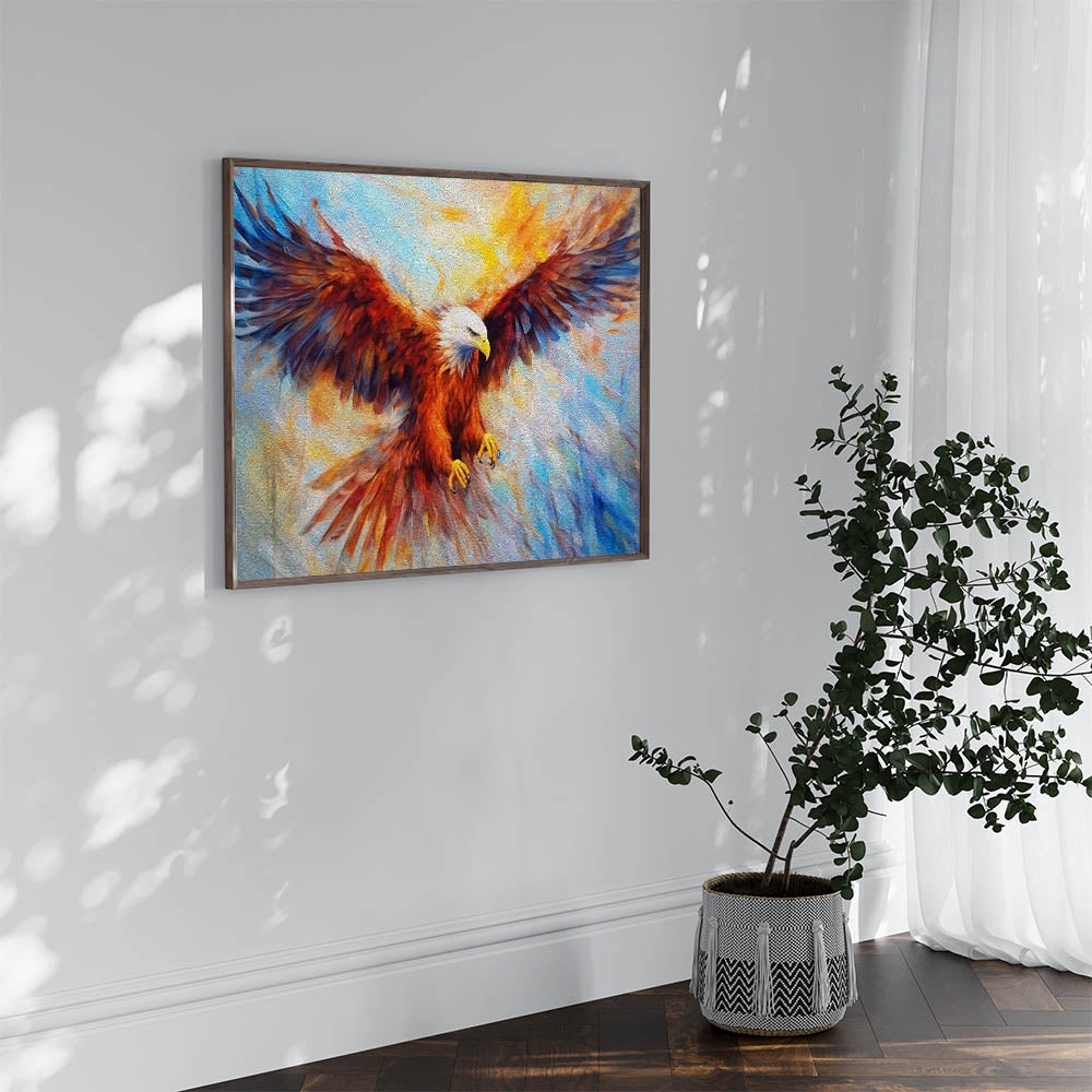 Ignite your space with the bold energy of this Fiery Eagle Wall Art. This dynamic artwork features a powerful bald eagle in mid-flight, rendered in a vibrant explosion of colors. The intense reds, oranges, and blues blend together to create a stunning visual that captures the spirit of freedom and strength. The artistic brushstrokes and rich textures add depth and movement, making this piece a striking centerpiece for any room.