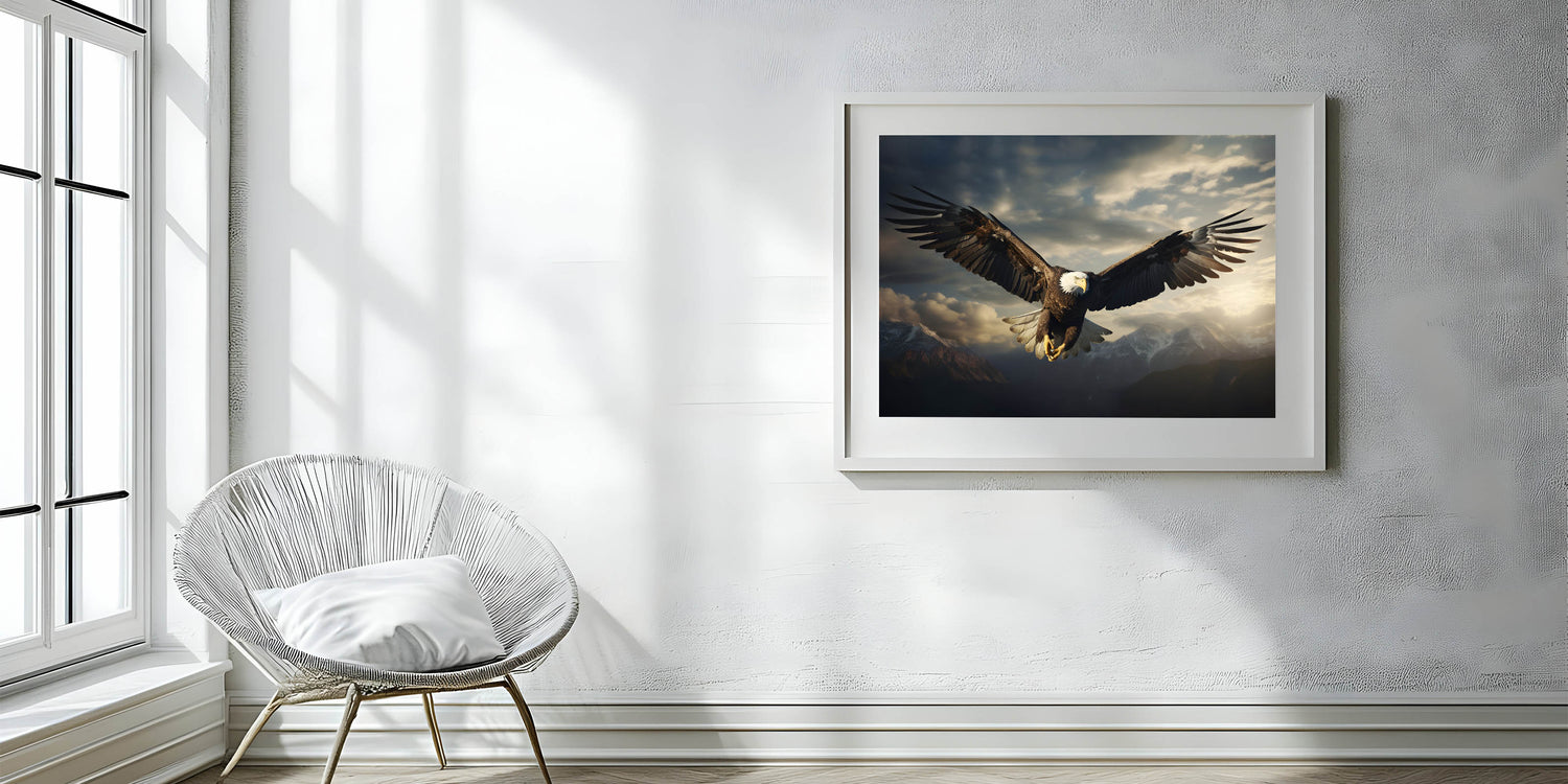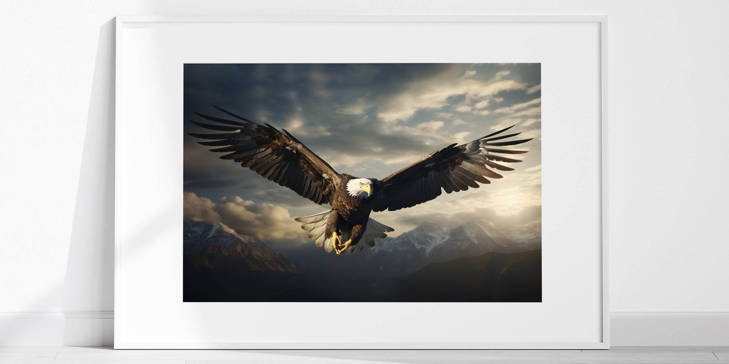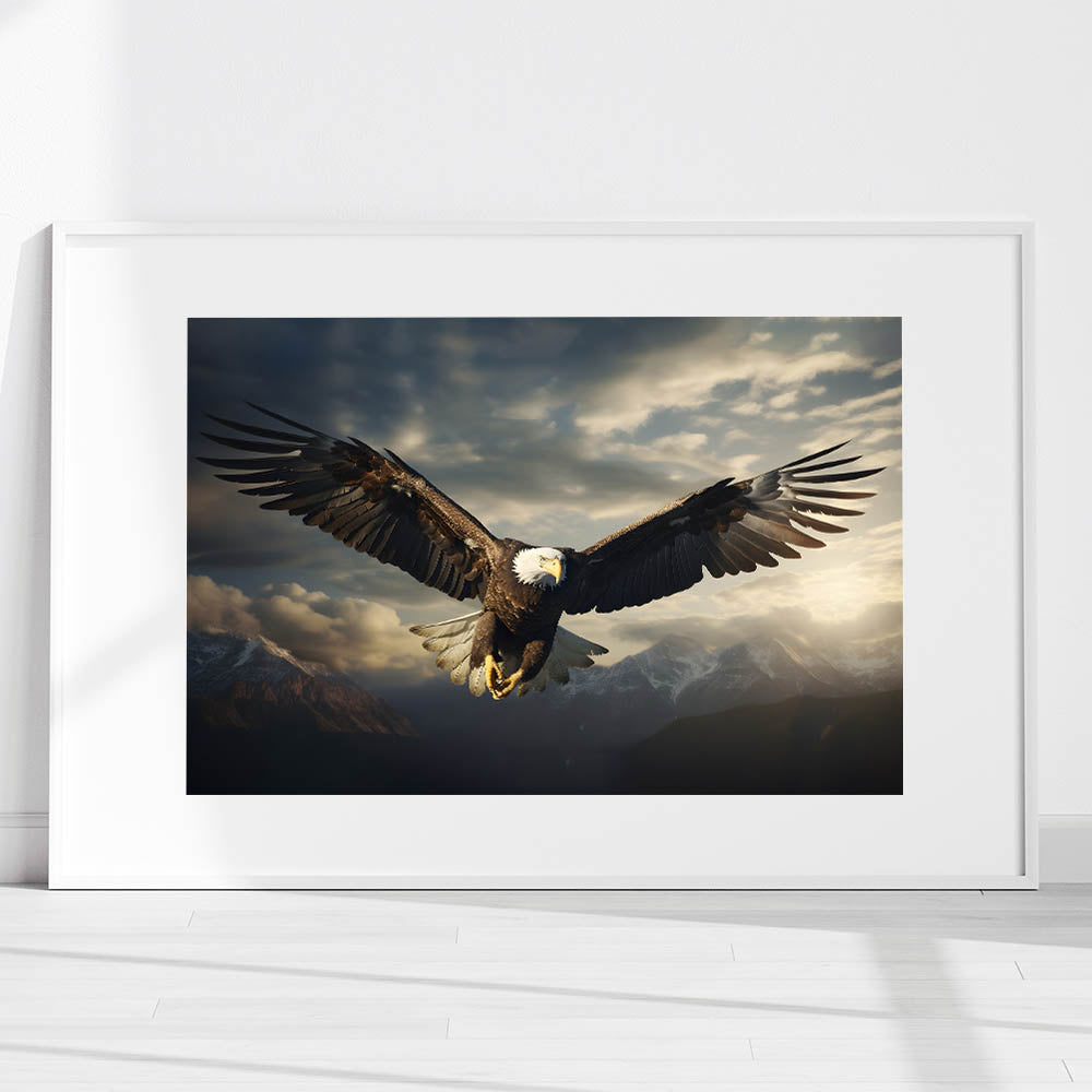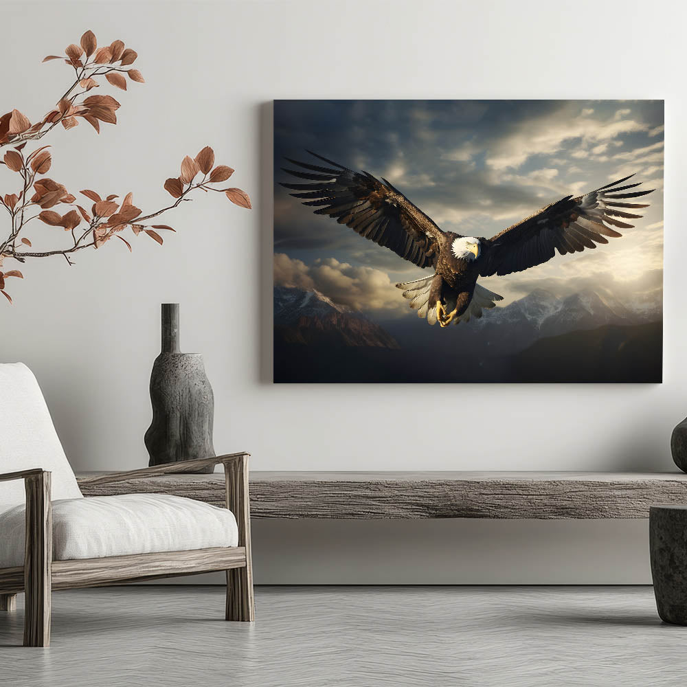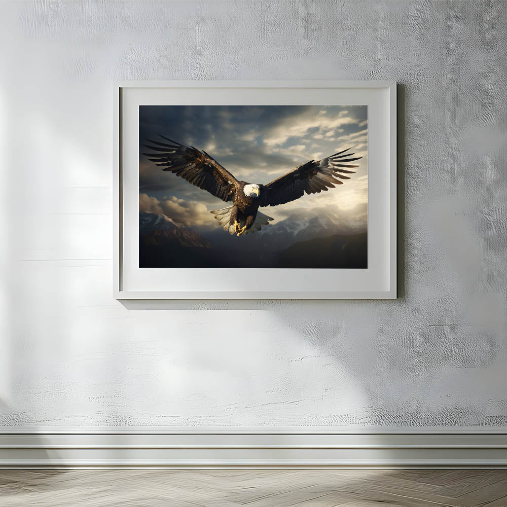 Elevate your decor with the awe-inspiring presence of this birds of prey wall art featuring a bald eagle soaring over a majestic mountain range. The eagle is captured in mid-flight, its wings fully extended as it glides through the dramatic skies above the rugged peaks. The interplay of light and shadow across the eagle’s feathers and the clouds creates a powerful and dynamic scene, evoking a sense of freedom and strength.