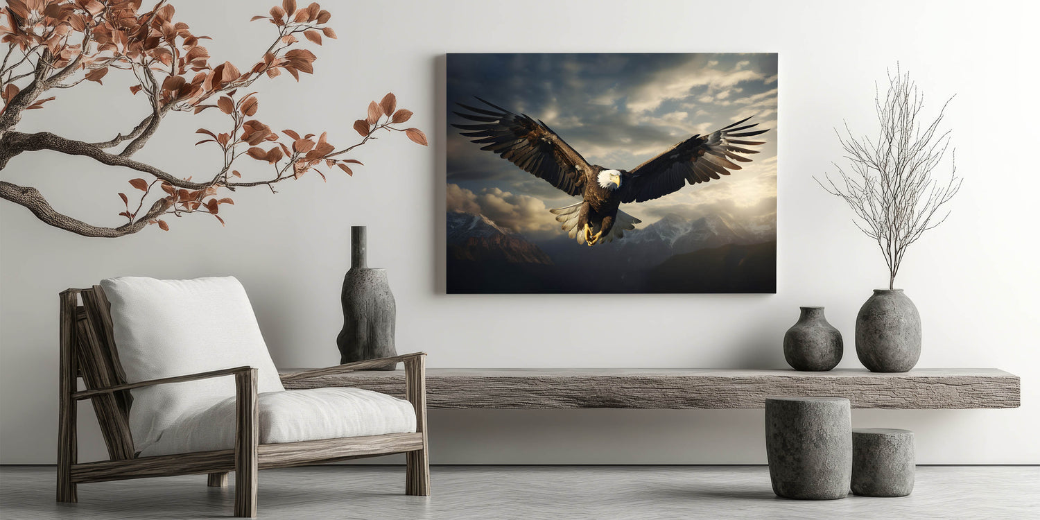- Majestic Imagery: The eagle’s commanding flight over the mountains brings a sense of grandeur and power to any room.