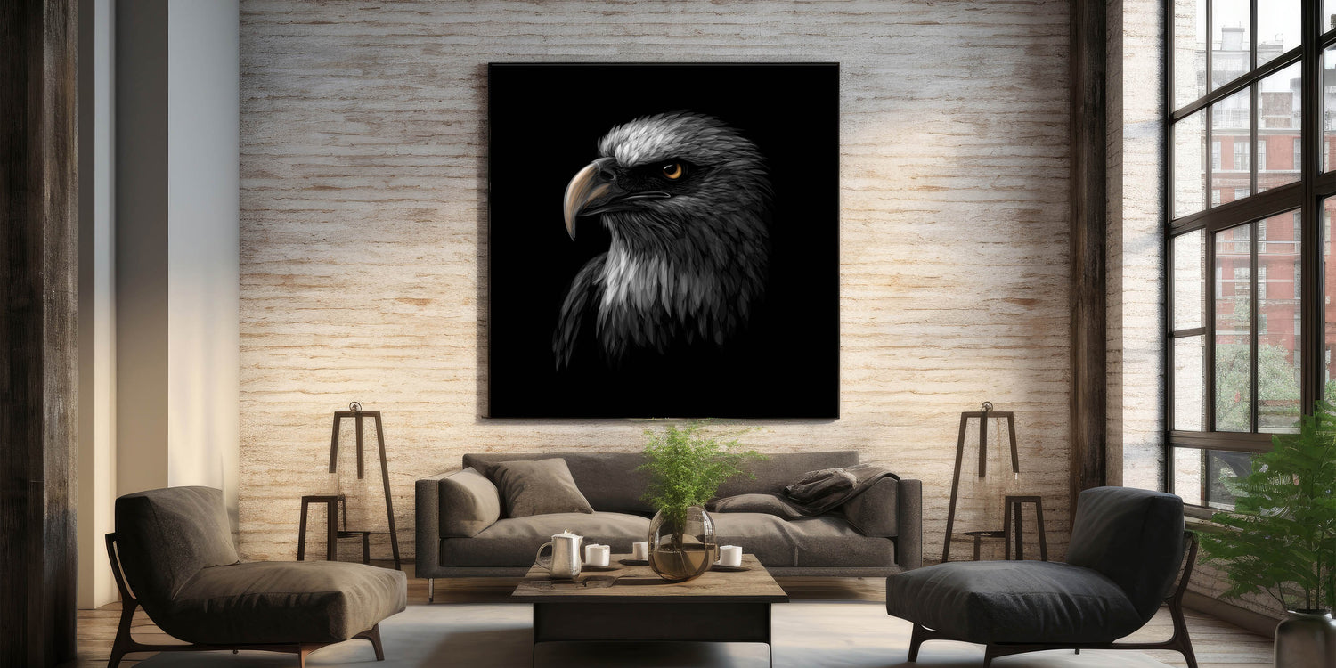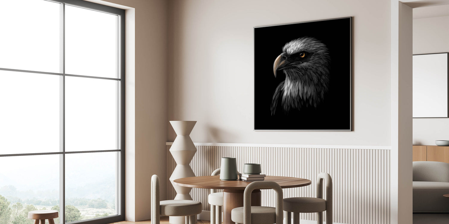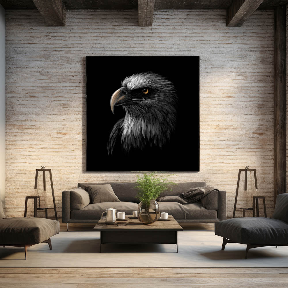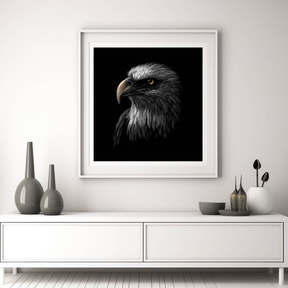 Ideal for those who appreciate the elegance of monochrome art and the strength of birds of prey, this piece adds a touch of sophistication and power to any room. The clean lines and deep blacks make it a versatile addition that complements both modern and classic decor styles.