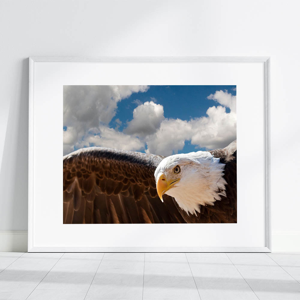 Embrace the untamed spirit of the skies with this "Powerful Bald Eagle Wall Art." Capturing a close-up of a bald eagle in mid-flight against a backdrop of expansive clouds, this artwork is a symbol of freedom, power, and the majestic beauty of the natural world. The dynamic angle and sharp detail of the eagle’s wings make this piece a striking addition to any room, creating a sense of movement and energy.