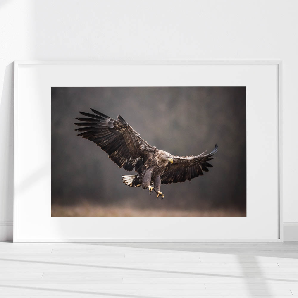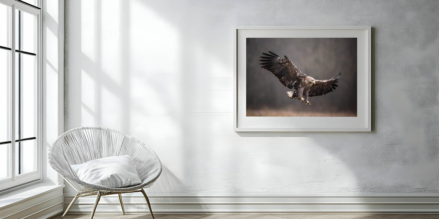 Embrace the raw power and grace of nature with this powerful birds of prey wall art. This stunning piece features an eagle mid-flight, its wings fully extended as it prepares to strike. The dark, moody background contrasts beautifully with the eagle’s sharp details, creating a captivating visual that draws you in.